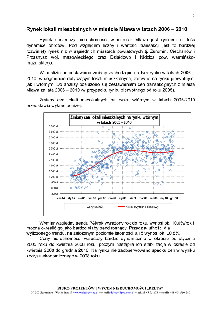 1 Rynek lokali mieszkalnych w mieście Mława w latach 2006 – 2010 Rynek sprzedaŜy nieruchomości w mieście Mława jest rynkiem o dość dynamice obrotów. Pod względem liczby i wartości transakcji jest to bardziej rozwinięty rynek niŜ w sąsiednich miastach powiatowych tj. śuromin, Ciechanów i Przasnysz woj. mazowieckiego oraz Działdowo i Nidzica pow. warmińskomazurskiego. W analizie przedstawiono zmiany zachodzące na tym rynku w latach 2006 – 2010, w segmencie dotyczącym lokali mieszkalnych, zarówno na rynku pierwotnym, jak i wtórnym. Do analizy posłuŜono się zestawieniem cen transakcyjnych z miasta Mława za lata 2006 – 2010 (w przypadku rynku pierwotnego od roku 2005). Zmiany cen lokali mieszkalnych na rynku wtórnym w latach 2005-2010 przedstawia wykres poniŜej. Zmiany cen lokali mieszkalnych na rynku wtórnym w latach 2005 - 2010 3 900 zł 3 600 zł 3 300 zł 3 000 zł 2 700 zł 2 400 zł 2 100 zł 1 800 zł 1 500 zł 1 200 zł 900 zł 600 zł 300 zł cze 04 sty 05 sie 05 mar 06 paź 06 cze 07 Ceny [zł/m2] sty 08 sie 08 mar 09 paź 09 maj 10 gru 10 nieliniowy trend czasowy Wymiar względny trendu [%]/rok wyraŜony rok do roku, wynosi ok. 10,6%/rok i moŜna określić go jako bardzo słaby trend rosnący. Przedział ufności dla wyliczonego trendu, na załoŜonym poziomie istotności 0,15 wynosi ok. ±0,8%. Ceny nieruchomości wzrastały bardzo dynamicznie w okresie od stycznia 2005 roku do kwietnia 2008 roku, poczym nastąpiła ich stabilizacja w okresie od kwietnia 2008 do grudnia 2010. Na rynku nie zaobserwowano spadku cen w wyniku kryzysu ekonomicznego w 2008 roku. BIURO PROJEKTÓW I WYCEN NIERUCHOMOŚCI „DELTA” 09-300 śuromin ul. Wschodnia 17 • www.debscy.cad.pl • e-mail: [email protected] • tel. 23 65 73 273 • mobile +48 604 550 240 2 Zmiany cen lokali mieszkalnych na rynku pierwotnym w latach 2006 – 2010 przedstawia wykres poniŜej. O ile transakcje na rynku wtórnym naleŜy uznać za rynkowe, o tyle transakcje na rynku pierwotnym w większości przypadków nimi nie są. Powodem jest okres zawarcia umów z deweloperem wyprzedzający zawarcie transakcji (aktu notarialnego) zwykle o kilka do kilkunastu miesięcy, rozłoŜenie płatności na raty itp. 5 200 zł Zmiany cen lokali mieszkalnych na rynku pierwotnym w latach 2006- 2010 4 800 zł 4 400 zł 4 000 zł 3 600 zł 3 200 zł 2 800 zł 2 400 zł 2 000 zł 1 600 zł 1 200 zł 800 zł kwi 06 wrz 06 lut 07 lip 07 gru 07 cze 08 Ceny [zł/m2] lis 08 kwi 09 wrz 09 lut 10 lip 10 gru 10 nieliniowy trend czasowy Wymiar względny trendu [%]/rok wyraŜony rok do roku, wynosi ok. 11,3%/rok i moŜna określić go jako bardzo słaby trend rosnący. Przedział ufności dla wyliczonego trendu, na załoŜonym poziomie istotności 0,15 wynosi ok. ±1,2%. Inwestycje deweloperskie w mieście zaczęły się w 2005 roku i pierwsze transakcje zaistniały na rynku we wrześniu 2006 roku. Ze względu na duŜy popyt na rynku ceny rosły do marca 2009 roku. Ze względu na duŜą ilość rozpoczętych inwestycji i duŜą podaŜ mieszkań na rynku, ceny uległy po tej dacie stopniowemu spadkowi. Wzrost cen pod koniec 2010 roku wiąŜe się z oddaniem do uŜytku inwestycji deweloperskich o najatrakcyjniejszych lokalizacjach w mieście. Zmiany ilościowe i wartościowe na obydwu rynkach przedstawiają się następująco: BIURO PROJEKTÓW I WYCEN NIERUCHOMOŚCI „DELTA” 09-300 śuromin ul. Wschodnia 17 • www.debscy.cad.pl • e-mail: [email protected] • tel. 23 65 73 273 • mobile +48 604 550 240 3 Liczba transakcji lokali mieszkalnych w mieście Mława lata 2006 - 2010 Rynek pierwotny Rynek wtórny 160 147 144 140 122 117 120 121 108 98 100 89 80 60 39 40 19 20 0 2006 2007 2008 2009 2010 Ogólna wartość transakcji lokali mieszkalnych w mieście Mława [zł] lata 2006 - 2010 Rynek pierwotny Rynek wtórny 25 000 000 20 157 081 20 000 000 12 683 408 17 156 570 15 180 593 13 707 460 15 000 000 14 797 483 12 125 216 10 464 508 10 000 000 5 000 000 2 256 478 3 704 274 0 2006 2007 2008 2009 2010 BIURO PROJEKTÓW I WYCEN NIERUCHOMOŚCI „DELTA” 09-300 śuromin ul. Wschodnia 17 • www.debscy.cad.pl • e-mail: [email protected] • tel. 23 65 73 273 • mobile +48 604 550 240 4 Suma sprzedanych powierzchni lokali mieszkalnych w mieście Mława [m2] lata 2006 - 2010 Rynek pierwotny Rynek wtórny 8 000 6 803 7 000 6 947 6 016 6 000 5 611 5 471 5 102 5 000 4 908 4 247 4 000 3 000 2 004 2 000 1 153 1 000 0 2006 2007 2008 2009 2010 W latach 2006 – 2010 na rynku pierwotnym sprzedano ogółem 389 mieszkań o łącznej powierzchni 19 115 m 2 , za łączną kwotę 53 598 724 zł, zaś na rynku wtórnym odpowiednio 615 mieszkań o łącznej powierzchni 35 157 m 2, z kwotę 76 798 724 zł. Procentowy udział w rynku przedstawiono na wykresach poniŜej. Ilość transakcji Rynek pierwotny 39% Rynek wtórny 61% BIURO PROJEKTÓW I WYCEN NIERUCHOMOŚCI „DELTA” 09-300 śuromin ul. Wschodnia 17 • www.debscy.cad.pl • e-mail: [email protected] • tel. 23 65 73 273 • mobile +48 604 550 240 5 Wartość transakcji Rynek pierwotny 41% Rynek wtórny 59% Powierzchnia lokali Rynek pierwotny 35% Rynek wtórny 65% Średnie ceny lokali na obydwu rynkach w latach 2006 – 2010 wykazywały w latach 2006 – 2007 tendencje wzrostowe, natomiast w latach 2008 – 2010 uległy stabilizacji. Ceny na obu rynkach w 2006 roku były porównywalne, zaś w latach 2007 - 2010 ceny na rynku pierwotnym były wyŜsze średnio o około 450 zł/m 2 niŜ ceny na rynku pierwotnym. Tłumaczy to stosunkowo małą dysproporcję wartości transakcji na obu runkach w porównaniu do powierzchni sprzedanych lokali. Zmiany średnich cen na rynku przedstawia wykres poniŜej. BIURO PROJEKTÓW I WYCEN NIERUCHOMOŚCI „DELTA” 09-300 śuromin ul. Wschodnia 17 • www.debscy.cad.pl • e-mail: [email protected] • tel. 23 65 73 273 • mobile +48 604 550 240 6 Średnia cena jednostkowa lokali mieszkalnych w mieście Mława [zł/m2] lata 2006 - 2010 Rynek pie