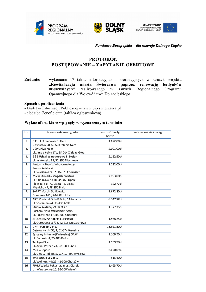 Fundusze Europejskie – dla rozwoju Dolnego Śląska PROTOKÓŁ POSTĘPOWANIE – ZAPYTANIE OFERTOWE Zadanie: wykonanie 17 tablic informacyjno – promocyjnych w ramach projektu „Rewitalizacja miasta Świerzawa poprzez renowację budynków mieszkalnych” realizowanego w ramach Regionalnego Programu Operacyjnego dla Województwa Dolnośląskiego Sposób upublicznienia: - Biuletyn Informacji Publicznej – www.bip.swierzawa.pl - siedziba Beneficjenta (tablica ogłoszeniowa) Wykaz ofert, które wpłynęły w wyznaczonym terminie: Lp. 1. 2. 3. 4. 5. 6. 7. 8. 9. 10. 11. 12. 13. 14. 15. 16. Nazwa wykonawcy, adres P.P.H.U Pracownia Reklam Dziwiszów 20, 58-508 Jelenia Góra USP Uniwersum ul. Jana z Kolna 17a, 65-014 Zielona Góra B&B Usługi komputerowe B.Bocian ul. Krakowska 14, 72-350 Niechorze Jantom – Druk Wielkoformatowy Janusz Świsłocki ul. Warszawska 32, 16-070 Choroszcz Mixmultimedia Magdalena Mróz ul. Chełmska 20/10, 45-469 Opole Plakapol s.c. G. Biedal Z. Biedal Młynisko 47, 98-350 Biała SAPPY Marcin Dudkiewicz Dominów 141f, 20-388 Lublin ART.Master A.Duła,K.Duła,D.Maślanka ul. Scaleniowa 4, 93-436 Łódź Studio Reklamy VALDEX s.c. Barbara Ziora, Waldemar Sosin ul. Pułaskiego 17, 46-200 Kluczbork STUDIOEMKA Robert Kurasiński ul. Ogrodowa 18/22, 42-215 Częstochowa DM-TECH Sp. z o.o. Ostrów Kaliski 58/1, 62-874 Brzeziny Systemy Informacji Wizualnej GRAF ul. Podlasie 4, 25-108 Kielce TechgrafQ s.c. ul. Armii Poznań 24, 62-030 Luboń Media Espace ul. Gen. J. Hallera 176/7, 53-203 Wrocław Ever Group sp.z o.o. ul. Wolności 40/25, 41-500 Chorzów PPHU Wielka Reklama Janusz Ciosek Ul. Warszawska 10, 98-300 Wieluń wartość oferty brutto 1.672,00 zł 2.091,00 zł 2.152,50 zł 1.722,00 zł 2.993,80 zł 982,77 zł 1.672,80 zł 6.747,78 zł 1.777,35 zł 1.568,25 zł 13.591,50 zł 1.168,50 zł 1.999,98 zł 2.070,09 zł 913,40 zł 1.463,70 zł podsumowanie / uwagi Fundusze Europejskie – dla rozwoju Dolnego Śląska 17. 18. 19. 20. 21. 22. 23. 24. 25. 26. 27. 28. 29. 30. 31. 32. 33. 34. 35. 36. 37. 38. 39. 40. 41. 42. FRESH ul. Wrześni 1B, 57-400 Nowa Ruda Reklamy Grzegorz Kotterba ul. 1 Maja 4, 47-450 Krzyżanowice „KOMERT” PHU Import – Export ul. Karłowicza 47, 51-610 Wrocław EDEN-Media Studio grafiki i reklamy Czesław Siudak ul. Ikara 6, 43-382 Bielsko-Biała Agencja Reklamowa Piotr Hajduk ul.Paderewskiego 9/66, 26-600 Radom F.H.U. „DANFI” Anna Firek ul. Pokoju 1/2, 41-709 Ruda Śląska Jakub Woda Kubic Art. ul. Ariańska 4, 33-300 Nowy Sącz Pracownia Reklamy Adam Syrtów ul. Rolnicza 18, 22-600 Tomaszów Lub. „STALUM” Andrzej Biegański ul. Pobielska 11, 60-002 Poznań Salwador Studio Reklamy K. Skonieczna ul. Lutycka 9, 57-300 Kłodzko GAMA Agencja Reklamowa W.Koczewski ul. M. Bacciarellego 53, 51-649 Wrocław PRO TEST Andrzej Radwan 106 Dywizji Piechoty AK nr 2, 32-200 Miechów ConColor Radosław Stańczyk ul. Kwiatkowskiego 77, 26-600 Radom Agencja Reklamowa „SAND” Press Photo ul. Biskupia 11, 50-950 Wrocław PHU PRUS-POL-BIS Agencja Reklamowa ul. Sobieskiego 56/58, 58-500 Jelenia Góra DASKOGRAF Dawid Skowroński ul. Topolowa 18, 56-300 Milicz FOX-ART. Maciej Lis Firma Usługowa Borowiec, ul. Karmelowa 7, 62-023 Gądki Media Light Jacek Mojski ul. Bursaki 6, 20-150 Lublin Pracownia Szyldów i Reklam s.c. T. Buśkiewicz, R. Czagowiec ul. Wrzeciono 48, 01-956 Warszawa WIZARD Karol Błaszczyk ul. Mickiewicza 51, 26-021 Daleszyce FHU AWIR K.Wojciechowska Ul. Fryderyka Chopina 1A, 62-800 Kalisz „SERD MEDIA” Ul. Serwitucka 33, 05-230 Kobyłka FHUP „ARTON24” Nosek Rafał Ul. Dworcowa 4/10A, 39-300 Mielec PPHU „GREEN POINT” Reklama Wizualna Szymon Wroński Żmigródek 94, 55-140 Żmigród Muffin Kaszczuk Ewa Ul. Wesoła 47, 58-200 Dzierżoniów „Freeboard” Paweł Romański Armii Krajowej 43, 58-302 Wałbrzych 3.136,50 zł 2.321,01 zł 3.554,70 zł 1.530,00 zł 2.779,80 zł 1.860,99 zł 1.463,70 zł 861,00 zł najniższa oferta brutto 3.554,70 zł 1.986,45 zł 2.927,40 zł 1.672,80 zł 1.888,30 zł 6.168,45 zł 2.152,50 zł 1.451,40 zł 2.896,65 zł 861,00 zł 2.312,40 zł 20.700,90 zł 1.400,97 zł 9.409,50 zł 1.537,50 zł 1.389,90 zł 41.820,00 zł 1.345,85 zł najniższa oferta brutto Fundusze Europejskie – dla rozwoju Dolnego Śląska 43. 44. 45. 46. 47. 48. 49. 50. 51. 52. 53. 54. 55. 56. 57. 58. 59. 60. 61. 62. 63. 64. 65. 66. 67. Agencja Reklamowa Pinakolada.pl Ul. Mikołowska 39/21, 40-066 Katowice Zakład Reklamowy ZNAKI PL K. Gabory Ul. Nyska 22, 48-385 Otmuchów APLA Sp. z o.o. Ul. Dąbrowskiego 207/225, 93-231 Łódź MTS Pracownia Plastyczna Tomasz Stępień Ul. Balzaka 16/2, 52-437 Wrocław ALFA TOM Tomasz Wąsik Ul. Ks. Bochenka 23, 55-100 Trzebnica BUDOTECHNIKA Sp. z o.o. Ul. Bierawka 2a, 44-145 Pilchowice Iwon’s PPHU Włodzimierz Dondelewski Ul. Wólczańska 66, 90-516 Łódź GRAFIT 3 Mazek Michał Ul. Zana 5, 20-601 Lublin „Prace Wysokościowe” Tomasz Bąkowski Ul. Asnyka 19/8, 62-800 Kalisz PMP Studio Reklamy Paweł Windak Ul. Karpacka 47, 38-457 Zręcin S.G.B. s.c. Ul. Janowicza 30 C, 10-693 Olsztyn eMPe Mateusz Poręba Wyskitna 161, 33-331 Stróże CREO Maciej Juszczyk Pl. J. Piłsudskiego 17/4, 58-105 Świdnica PHU MAD Beata Duda Ul. Trzech Kotwic 6, 49-300 Brzeg 3R Agencja Reklamowo-Marketingowa Sylwiusz Gruś, Ul. Wilcza 8, 56-120 Brzeg Dolny INTRO F&K Fechner J. Kalitka W. Błotnica ul. Słoneczna 28, 64-234 Przemęt Galeria Admar s.c. Ul. Barniewicka 173, 80-299 Gdańsk Agencja reklamowa WEKTOR 77 A. Wojton Ul. Towarowa 5, 10-416 Olsztyn Reklama Wizualna ALMAKS Maciej Śliwiński Pl. Sprzymierzeńców 1, 59-500 Złotoryja REDIS Centrum Reklamy Ewa Klosińska Pl. Zwycięstwa 2, 56-400 Oleśnica IDP INTERSIGN Ul. M.Curie-Sklodowskiej 6, 90-505 Łódź dotMedia Tomasz Czelej Sp.j. ul. Przemysłowa 21, 23-200 Kraśnik Pracownia reklam VISION Ul. Poznańska 22, 58-500 Jelenia Góra Studio reklamy BM Ul. Koziegłowska 1, 42-310 Żarki Pikgroup ul. Westerplatte 51, 58-100 Świdnica 1.573,17 zł 1.430,17 zl 