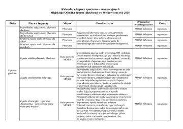 Kalendarz imprez sportowo – rekreacyjnych Miejskiego Ośrodka Sportu i Rekreacji we Włodawie na rok 2015 Data Nazwa imprezy Indywidualne zajęcia nauki pływania dla dzieci Indywidualne zajęcia nauki pływania dla dorosłych Grupowe zajęcia nauki pływania dla dzieci Grupowe zajęcia nauki pływania dla dorosłych Miejsce Charakterystyka Pływalnia Pływalnia Pływalnia Pływalnia Zajęcia szkółki piłkarskiej dla dzieci Hala sportowa MOSiR Zajęcia szkółki tenisa stołowego Hala sportowa MOSiR Zajęcia rekreacyjno – sportowe ,,Gimnastyka – nowoczesne formy ruchu przy muzyce” Hala sportowa MOSiR Styczeń grudzień Zajęcia nauki pływania mają na celu zapoznanie uczestników ze środowiskiem wodnym, przełamanie wszelkich barier, lęku, nabycie elementarnych umiejętności pływackich. Przygotowanie do samodzielnego pływania i doskonalenia umiejętności. Uczestnikami zajęć są osoby z rocznika 2005 i młodsze. Dzieci poprzez różnego rodzaju gry i zabawy wyrabiają podstawowe cechy motoryczne jak szybkość, zwinność, wytrzymałość. Zapoznają się z podstawowymi przepisami gry w piłkę nożną oraz uczą się podstawowych elementów piłkarskich. Prowadzenie zajęć szkółki tenisa stołowego ma na celu kształtowanie i doskonalenie harmonijnego rozwoju fizycznego dzieci i młodzieży, wdrażanie do „zdrowego” współzawodnictwa, popularyzację i upowszechnienie sportów indywidualnych i drużynowych. Poprzez prowadzenie zajęć chcemy zachęcić uczniów do udziału w imprezach rekreacyjnych i sportowych. Prozdrowotny fitness skierowany do osób w różnym wieku. Zajęcia poprowadzone są w sposób umożliwiający wdrożenie się i rozpoczęcie zabawy z fitnessem każdemu kto nigdy wcześniej nie ćwiczył i nie miał do czynienia z tego typu aktywnością ruchową. Zapewniamy opiekę instruktora z dużym doświadczeniem w prowadzeniu zajęć ruchowych. Instruktor dostosowuje rodzaj ćwiczeń do możliwości ćwiczących. Wykorzystywane są wszelkie formy aktywności ruchowej takie jak: stretchingu, pilates, elementy tańca, ćwiczenia z przyrządami i bez, ćwiczenia w sali i na basenie Organizator/ Współorganizator Zasięg MOSiR Włodawa regionalna MOSiR Włodawa regionalna MOSiR Włodawa regionalna MOSiR Włodawa regionalna MOSiR Włodawa regionalna MOSiR Włodawa regionalna MOSiR Włodawa regionalna Styczeń Młodzieżowa Liga Siatkówki Hala sportowa MOSiR Styczeń marzec Liga Siatkówki Mężczyzn Hala sportowa MOSiR Styczeńmaj Szkolna Liga Pływacka Luty Pływalnia MOSiR FERIE ZIMOWE 02.02.15 – 15.02.15 Zajęcia z tenisa stołowego Zajęcia piłki nożnej Zajęcia Tenisa ziemnego Intensywny kurs nauki pływania Hala sportowa MOSiR Pływalnia MOSiR Młodzieżowy Turniej Trójek Siatkarskich Hala sportowa MOSiR Turniej tenisa stołowego Hala sportowa MOSiR Cykl meczy odbywających się w weekendy, mecze rozgrywane systemem „każdy z każdym”. Celem organizacji ligi jest popularyzacji piłki siatkowej wśród młodzieży powiatu włodawskiego. Umożliwienie i prowadzenie rywalizacji pomiędzy drużynami grającymi w piłkę siatkową oraz wyłonienie zwycięscy. Cykl meczy odbywających się w weekendy, mecze rozgrywane systemem „każdy z każdym”. Celem organizacji ligi jest popularyzacja piłki siatkowej wśród mieszkańców powiatu włodawskiego. Umożliwienie i prowadzenie rywalizacji pomiędzy amatorskimi drużynami grającymi w piłkę siatkową oraz wyłonienie zwycięzcy. Skierowana do młodzieży szkolnej. Głównym celem organizacji imprezy jest propagowanie pływania, wyłonienie najlepszych pływaków, propozycja aktywnego wypoczynku dla poprawy osobistej sprawności i własnego zdrowia, dobra zabawa w formie współzawodnictwa rówieśników, promocja miasta oraz ośrodka Aktywne spędzanie czasu wolnego podczas ferii zimowych. Kształtowanie i rozwijanie cech motorycznych, szybkości, siły, wytrzymałości, koordynacji ruchowej. Zajęcia mają na celu również kształtowanie śmiałości i odwagi. Przestrzeganie zasad współdziałania w grupie. Zajęcia nauki pływania mają na celu zapoznanie uczestników ze środowiskiem wodnym, przełamanie wszelkich barier, lęku, nabycie elementarnych umiejętności pływackich. Turniej skierowany do młodzieży szkolnej Gimnazjalistów i Licealistów. Celem turnieju jest promocja piłki siatkowej wśród młodzieży oraz umożliwienie udziału w atrakcyjnej formie czynnego wypoczynku i sportowej rywalizacji w czasie wolnym od zajęć szkolnych. Turniej rozegrany zostanie w kat. skrzatów, żaków, młodzików, kadetów, juniorów i open. Głównym celem MOSiR Włodawa powiatowa MOSiR Włodawa powiatowa MOSiR Włodawa regionalna MOSiR Włodawa regionalna MOSiR Włodawa regionalna MOSiR Włodawa regionalna Turniej piłki nożnej dzieci z rocznika 2005 i młodszych Turniej Piłkarski kl. V-VI szkół podstawowych marzec Turniej Piłki Nożnej – rozpoczęcie sezonu ORLIK Wiosenny Turniej Piłki Nożnej Gimnazjalistów kwiecień Zajęcia rekreacyjno – sportowe przedszkolaków Wielkanocny Turniej Tenisa Stołowego Młodzieżowy Turniej Trójek Siatkarskich turnieju jest aktywne spędzanie czasu wolnego podczas ferii zimowych, popularyzacja tenisa stołowego wśród dzieci, młodzieży, osób dorosłych, rozwijanie ich zainteresowań poprzez sport. Turniej skierowany do dzieci z rocznika 2005 i młodszych mający na celu Hala sportowa - popularyzację halowej piłki nożnej wśród dzieci MOSiR - wyłonienie mistrzowskiej drużyny -rozwijanie zainteresowań dzieci poprzez sport - eksponowanie zasad „Fair Play” w sporcie. Turniej skierowany do uczniów klas V-VI szkół Hala sportowa podstawowych mający na celu zapewnienie aktywnego MOSiR wypoczynku podczas ferii zimowych. Turniej skierowany do osób dorosłych 18+ Mający na Boiska ORLIK celu popularyzację piłki nożnej, zachęcenie do czynnego uprawiania tej dyscypliny sportowej. Celem organizacji turnieju jest popularyzacja p