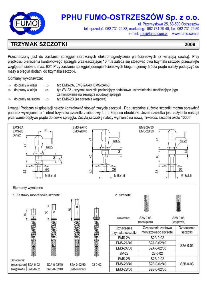 PPHU FUMO-OSTRZESZÓW Sp. z o.o. FUMO ul. Przemysłowa 25, 63-500 Ostrzeszów tel. sprzedaż: 062 731 29 38, marketing: 062 731 29 40, fax. 062 731 29 50 e-mail: [email protected] www.fumo.com.pl TRZYMAK SZCZOTKI 2009 Przeznaczony jest do zasilania sprzęgieł sterowanych elektromagnetycznie pierścieniowych (z wirującą cewką). Przy prędkości pierścienia kontaktowego sprzęgła przekraczającej 10 m/s zaleca się stosować dwa trzymaki szczotki przesunięte względem siebie o max. 90°. Przy zasilaniu sprzęgieł jednopierścieniowych biegun ujemny źródła prądu należy podłączyć do masy a biegun dodatni do trzymaka szczotki. Odmiany wykonawcze: • • do pracy w oleju do pracy w oleju ⇒ ⇒ • do pracy na sucho ⇒ typ EMS-2A, EMS-2A/40, EMS-2A/60 typ SV-22 – trzymak szczotki posiadający dodatkowe uszczelnienie umożliwiające jego zamontowanie na zewnątrz obudowy sprzęgła typ EMS-2B (ze szczotką węglową) Uwaga! Podczas eksploatacji należy kontrolować stopień zużycia szczotki . Dopuszczalne zużycie szczotki można sprawdzić poprzez wykręcenie o 1 obrót trzymaka szczotki z obudowy lub z korpusu obrabiarki. Jeżeli szczotka jest zużyta to nastąpi przerwanie dopływu prądu do cewki sprzęgła. Zużytą szczotkę należy wymienić na nową. Trwałość szczotki około 1000 h EMS-2A/40 EMS-2B/40 EMS-2A/60 EMS-2B/60 6kt.22 6kt.22 60 40 22 2,5 Ø6 M18x1,5 Ø6 Ø6 2,5 14 2,5 14 6kt.22 14 47 47 35 47 EMS-2A EMS-2B SV-22 M18x1,5 M18x1,5 Elementy wymienne 2. Szczotki 55 35 15 1. Zestawy montażowe szczotki Oznaczenie: Oznaczenie: (mosiężna) S2A-0-02 (węglowa) S2B-0-02 S2A-0-02/40 S2B-0-02/40 S2A-0-02/60 S2B-0-02/60 22-0-02 Oznaczenie trzymaka szczotki EMS-2A EMS-2A/40 EMS-2A/60 SV-22 EMS-2B EMS-2B/40 EMS-2B/60 S2A-0-03 S2B-0-03 (mosiężna) (węglowa) Oznaczenie zestawu montażowego szczotki S2A-0-02 S2A-0-02/40 S2A-0-02/60 22-0-02 S2B-0-02 S2B-0-02/40 S2B-0-02/60 Oznaczenie szczotki S2A-0-03 S2B-0-03