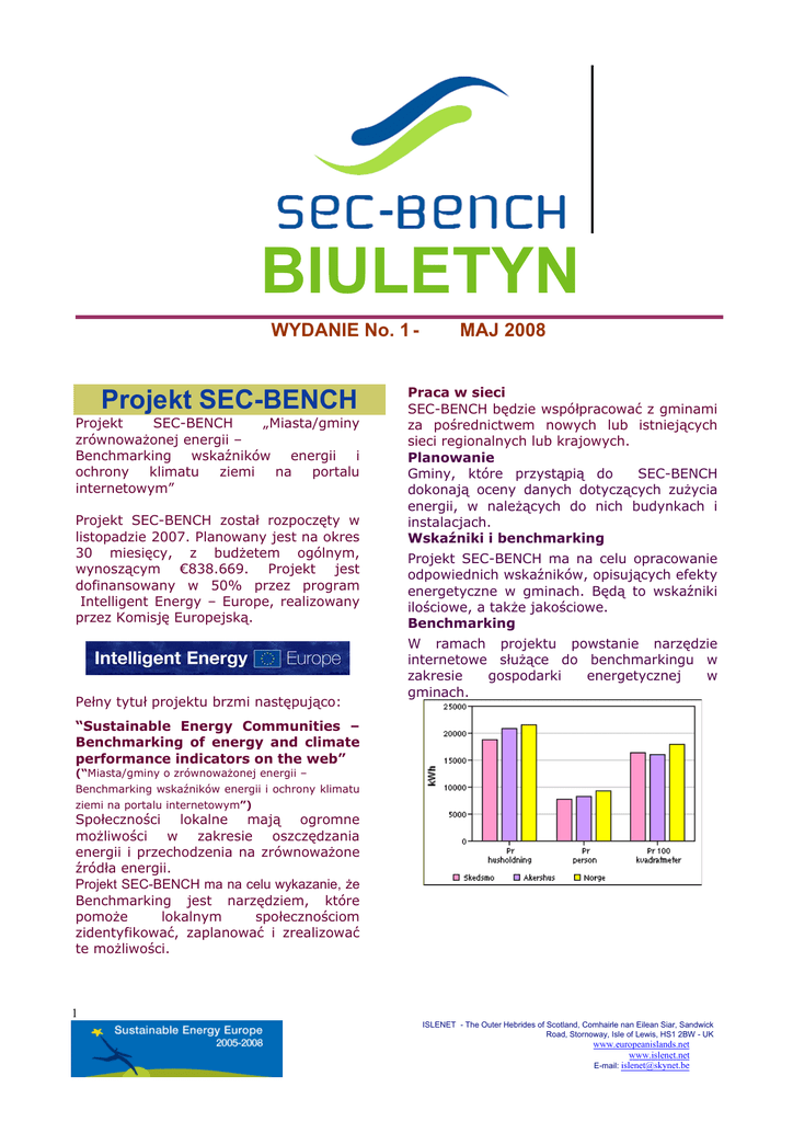 BIULETYN WYDANIE No. 1 - Projekt SEC-BENCH Projekt SEC-BENCH „Miasta/gminy zrównoważonej energii – Benchmarking wskaźników energii i ochrony klimatu ziemi na portalu internetowym” Projekt SEC-BENCH został rozpoczęty w listopadzie 2007. Planowany jest na okres 30 miesięcy, z budżetem ogólnym, wynoszącym €838.669. Projekt jest dofinansowany w 50% przez program Intelligent Energy – Europe, realizowany przez Komisję Europejską. Pełny tytuł projektu brzmi następująco: MAJ 2008 Praca w sieci SEC-BENCH będzie współpracować z gminami za pośrednictwem nowych lub istniejących sieci regionalnych lub krajowych. Planowanie Gminy, które przystąpią do SEC-BENCH dokonają oceny danych dotyczących zużycia energii, w należących do nich budynkach i instalacjach. Wskaźniki i benchmarking Projekt SEC-BENCH ma na celu opracowanie odpowiednich wskaźników, opisujących efekty energetyczne w gminach. Będą to wskaźniki ilościowe, a także jakościowe. Benchmarking W ramach projektu powstanie narzędzie internetowe służące do benchmarkingu w zakresie gospodarki energetycznej w gminach. “Sustainable Energy Communities – Benchmarking of energy and climate performance indicators on the web” (“Miasta/gminy o zrównoważonej energii – Benchmarking wskaźników energii i ochrony klimatu ziemi na portalu internetowym”) Społeczności lokalne mają ogromne możliwości w zakresie oszczędzania energii i przechodzenia na zrównoważone źródła energii. Projekt SEC-BENCH ma na celu wykazanie, że Benchmarking jest narzędziem, które pomoże lokalnym społecznościom zidentyfikować, zaplanować i zrealizować te możliwości. 1 ISLENET - The Outer Hebrides of Scotland, Comhairle nan Eilean Siar, Sandwick Road, Stornoway, Isle of Lewis, HS1 2BW - UK www.europeanislands.net www.islenet.net E-mail: [email protected] Cele Głównym celem projektu SEC-BENCH jest opracowanie i uruchomienie narzędzia internetowego, które ma być pomocne dla gmin przy wykorzystaniu ich potencjału w zakresie oszczędności energii i konwersji na odnawialne źródła energii. Główne etapy Cele projektu zostaną osiągnięte w efekcie realizacji następujących głównych etapów: • Opracowania i eksploatacji sieci • Wykonania pilotowych planów energetycznych i ochrony klimatu • Opracowanie wskaźników oceny gospodarki energetycznej • Opracowanie internetowego systemu benchmarkingu • System działań w celu rozpowszechniania informacji i zaangażowania wszystkich potencjalnych uczestników projektu na szczeblu lokalnym, regionalnym, krajowym i międzynarodowym Oczekiwane rezultaty Sieci Projekt SEC-BENCH obejmie organizację i prowadzenie krajowych sieci tematycznych w 7 krajach partnerskich. Naszym celem jest zaangażowanie jak największej liczby gmin i innych podmiotów / jednostek (np. wysp) w każdej z sieci krajowych. Planowanie energetyczne Projekt SEC-BENCH będzie również obejmować przegląd istniejących modeli planowania a także wydanie praktycznego poradnika na temat sporządzania lokalnych planów energetycznych. Wskaźniki Projekt SEC-BENCH pozwoli ocenić istniejące wskaźniki a także wszelkie dostępne serie danych długookresowych, dotyczących gmin partnerskich. Ponadto, w ramach projektu zostanie opracowana propozycja rutynowej metody gromadzenia danych, ich przetwarzania i przedstawiania odpowiednich wskaźników. Benchmarking internetowy Projekt SEC-BENCH pozwoli zbadać istniejące rozwiązania i opracować narzędzie benchmarkingu oparte o internet, dotyczące wskaźników wykorzystania energii i wpływu na klimat w poszczególnych gminach. Partnerzy Projektu Kraj Partner NO NEPAS NO KS NO Nettconsult GR 21OTA GR CRES SI ApE DK KL DK BaSS PT AREAC IT Lazio Region IT ISIS Sieć ISLENET europejska PL FEWE BG DLAEM NEPAS - Norwegia New Energy Performance AS (NEPAS) jest koordynatorem projektu SEC-BENCH. NEPAS powstał w roku 2004. Głównym udziałowcem jest Institute for Energy Technology (IFE). Wizja prezentowana przez NEPAS “Energy Management – Powered by NEPAS” opiera się na tym, że usługi oferowane klientom w prywatnych zakładach przemysłowych i w sektorze publicznym, będą dotyczyć gospodarki energetycznej. Dzięki temu NEPAS pomoże tym podmiotom w osiągnięciu lepszych efektów energetycznych w rezultacie wprowadzenia technologii i narzędzi planowania, rozwoju kompetencji i koncentracji na procesach decyzyjnych. Kontakt: Hans Jacob Mydske [email protected] http://www.nepas.no/ 2 ISLENET - The Outer Hebrides of Scotland, Comhairle nan Eilean Siar, Sandwick Road, Stornoway, Isle of Lewis, HS1 2BW - UK www.europeanislands.net www.islenet.net E-mail: [email protected] KS - Norwegia The Norwegian Association of Regional and Local Authorities (KS) jest krajowym związkiem gmin, hrabstw i przedsiębiorstw publicznych, będących własnością gmin lub hrabstw. Związek zrzesza wszystkie gminy i hrabstwa. KS jest organizacją centralną, doradczą i konsultingową oraz pośredniczącą w rozmowach z rządem w imieniu swoich członków. Kontakt: Ole Jørgen Elstad Grann [email protected] www.ks.no AGDER ENERGI NETTKONSULT AS - Norwegia Agder Energi Nettkonsult AS (AEN) jest spółką-córką Agder Energi Group. Agder Energi AS to jedna z największych grup energetycznych w Norwegii, w dziedzinie produkcji energii w hydroelektrowniach. Ta firma należy do 30 gmin w regionie i do spółki energetycznej Statkraft. AEN jest firmą inżynierską, w ramach grupy. Realizuje projekty w zakresie energii ze źródeł odnawialnych (OZE), ciepłownictwa, zużycia energii w budynkach i planowania energetycznego. Kontakt: Arild Olsbu [email protected] www.nettkonsult.no 21 OTA - GRECJA Koalicja 21 samorządów lokalnych w północno-wschodnim sektorze Prefektury Aten (21OTA). 21 gmin (jednostek samorządowych) w Pn-W sektorze Prefektury Aten, z ok. 1 milionem mieszkańców, powołało w r. 1999 Koalicję na rzecz promocji zasad i celów zrównowa