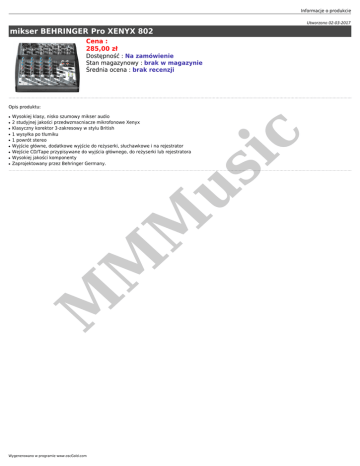 Informacje o produkcie Utworzono 02-03-2017 mikser BEHRINGER Pro XENYX 802 Cena : 285,00 zł Dostępność : Na zamówienie Stan magazynowy : brak w magazynie Średnia ocena : brak recenzji ● ● ● ● ● ● ● ● M M M us ● Wysokiej klasy, nisko szumowy mikser audio 2 studyjnej jakości przedwzmacniacze mikrofonowe Xenyx Klasyczny korektor 3-zakresowy w stylu British 1 wysyłka po tłumiku 1 powrót stereo Wyjście główne, dodatkowe wyjście do reżyserki, słuchawkowe i na rejestrator Wejście CD/Tape przypisywane do wyjścia głównego, do reżyserki lub rejestratora Wysokiej jakości komponenty Zaprojektowany przez Behringer Germany. ic Opis produktu: Wygenerowano w programie www.oscGold.com