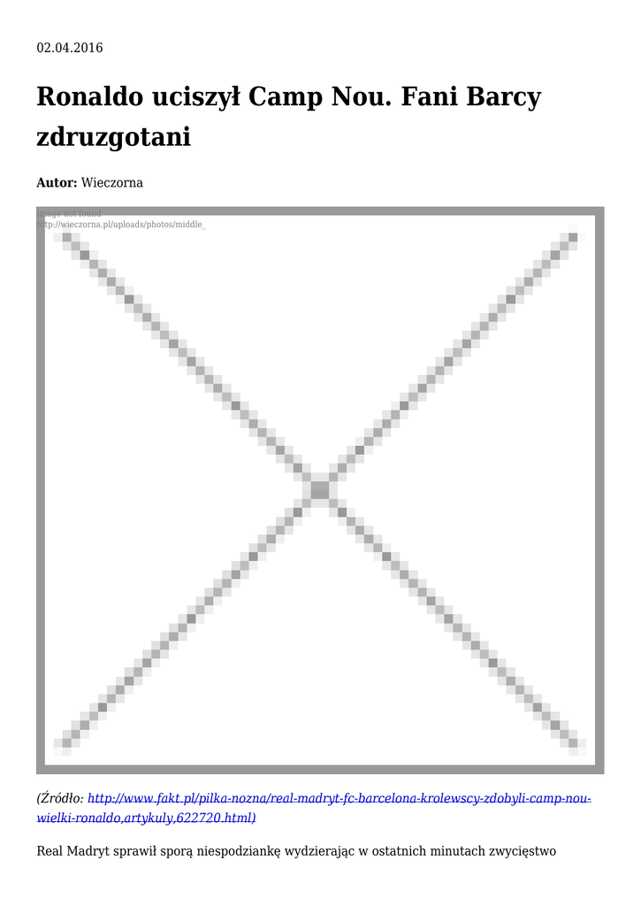 02.04.2016 Ronaldo uciszył Camp Nou. Fani Barcy zdruzgotani Autor: Wieczorna Image not found http://wieczorna.pl/uploads/photos/middle_ (Źródło: http://www.fakt.pl/pilka-nozna/real-madryt-fc-barcelona-krolewscy-zdobyli-camp-nouwielki-ronaldo,artykuly,622720.html) Real Madryt sprawił sporą niespodziankę wydzierając w ostatnich minutach zwycięstwo liderom Primera Division - FC Barcelonie. Decydującego gola na 2:1 strzelił Cristiano Ronaldo, kiedy Królewskich na boisku była już tylko dziesiątka. Kilka chwil wcześniej z boiska wyleciał Sergio Ramos.