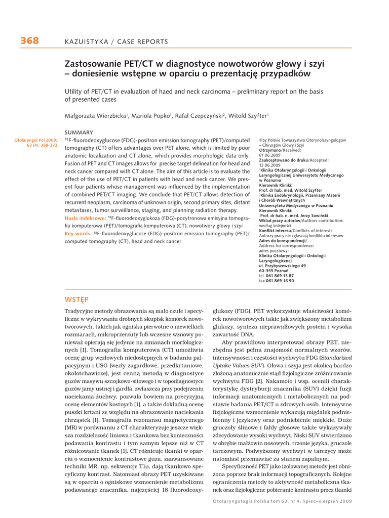 368 KAZU ISTYKA / CASE REPORTS Zastosowanie PET/CT w diagnostyce nowotworów głowy i szyi – doniesienie wstępne w oparciu o prezentację przypadków Utility of PET/CT in evaluation of haed and neck carcinoma – preliminary report on the basis of presented cases Małgorzata Wierzbicka1, Mariola Popko1, Rafał Czepczyński2, Witold Szyfter 1 Otolaryngol Pol 2009; 63 (4): 368-372 SUMMARY 18 F-fluorodeoxyglucose (FDG)-positron emission tomography (PET)/computed tomography (CT) offers advantages over PET alone, which is limited by poor anatomic localization and CT alone, which provides morphologic data only. Fusion of PET and CT images allows for precise target delineation for head and neck cancer compared with CT alone. The aim of this article is to evaluate the effect of the use of PET/CT in patients with head and neck cancer. We present four patients whose management was influenced by the implementation of combined PET/CT imaging. We conclude that PET/CT allows detection of recurrent neoplasm, carcinoma of unknown origin, second primary sites, distant metastases, tumor surveillance, staging, and planning radiation therapy. Hasła indeksowe: 18F-fluorodeoxyglukoza (FDG)-pozytronowa emisyjna tomografia komputerowa (PET)/tomografia komputerowa (CT), nowotwory głowy i szyi Key words: 18 F-fl uorodeoxyglucose (FDG)-positron emission tomography (PET)/ computed tomography (CT), head and neck cancer ©by Polskie Towarzystwo Otorynolaryngologów – Chirurgów Głowy i Szyi Otrzymano/Received: 01.06.2009 Zaakceptowano do druku/Accepted: 12.06.2009 1 Klinika Otolaryngologii i Onkologii Laryngologicznej Uniwersytetu Medycznego w Poznaniu Kierownik Kliniki: Prof. dr hab. med. Witold Szyfter 2 Klinika Endokrynologii, Przemiany Materii i Chorób Wewnętrznych Uniwersytetu Medycznego w Poznaniu Kierownik Kliniki: Prof. dr hab. n. med. Jerzy Sowiński Wkład pracy autorów/Authors contribution: według kolejności Konflikt interesu/Conflicts of interest: Autorzy pracy nie zgłaszają konfliktu interesów. Adres do korespondencji/ Address for correspondence: adres pocztowy: Klinika Otolaryngologii i Onkologii Laryngologicznej ul. Przybyszewskiego 49 60-355 Poznań tel. 061 869 13 87 fax 061 869 16 90 WSTĘP Tradycyjne metody obrazowania są mało czułe i specyficzne w wykrywaniu drobnych skupisk komórek nowotworowych, takich jak ogniska pierwotne o niewielkich rozmiarach, mikroprzerzuty lub wczesne wznowy ponieważ opierają się jedynie na zmianach morfologicznych [1]. Tomografia komputerowa (CT) umożliwia ocenę grup węzłowych niedostępnych w badaniu palpacyjnym i USG (węzły zagardłowe, przedkrtaniowe, okołotchawicze), jest cenną metodą w diagnostyce guzów masywu szczękowo-sitowego i w topodiagnostyce guzów jamy ustnej i gardła, zwłaszcza przy podejrzeniu naciekania żuchwy, pozwala bowiem na precyzyjną ocenę elementów kostnych [1], a także dokładną ocenę puszki krtani ze względu na obrazowanie naciekania chrząstek [1]. Tomografia rezonansu magnetycznego (MR) w porównaniu z CT charakteryzuje jeszcze większa rozdzielczość liniowa i tkankowa bez konieczności podawania kontrastu i tym samym lepsze niż w CT różnicowanie tkanek [1]. CT różnicuje tkanki w oparciu o wzmocnienie kontrastowe guza, zaawansowane techniki MR, np. sekwencje T1ϕ, dają tkankowo specyficzny kontrast. Natomiast obrazy PET uzyskiwane są w oparciu o ogniskowe wzmocnienie metabolizmu podawanego znacznika, najczęściej 18 fluorodeoxy- glukozy (FDG). PET wykorzystuje właściwości komórek nowotworowych takie jak zwiększony metabolizm glukozy, synteza nieprawidłowych protein i wysoka zawartość DNA. Aby prawidłowo interpretować obrazy PET, niezbędna jest pełna znajomość normalnych wzorów, intensywności i częstości wychwytu FDG (Standarized Uptake Values SUV ). Głowa i szyja jest okolicą bardzo złożoną anatomicznie stąd fizjologiczne zróżnicowanie wychwytu FDG [2]. Nakamoto i wsp. ocenili charakterystykę dystrybucji znacznika (SUV) dzięki fuzji informacji anatomicznych i metabolicznych na podstawie badania PET/CT u zdrowych osób. Intensywne fizjologiczne wzmocnienie wykazują migdałek podniebienny i językowy oraz podniebienie miękkie. Duże gruczoły ślinowe i fałdy głosowe także wykazywały zdecydowanie wysoki wychwyt. Niski SUV stwierdzono w obrębie małżowin nosowych, trzonie języka, gruczole tarczowym. Podwyższony wychwyt w tarczycy może natomiast przemawiać za stanem zapalnym. Specyficzność PET jako izolowanej metody jest obniżona poprzez brak informacji topograficznych. Kolejne ograniczenia metody to aktywność metaboliczna tkanek oraz fizjologiczne pobieranie kontrastu przez tkanki Otolar yngologia Polska tom 63, nr 4, lipiec– sierpień 20 0 9 KAZUISTYKA / CASE REPORTS a także kurczenie się mięśni w fazie pobierania znacznika. Część guzów, zwłaszcza pochodzenia gruczołowego, ma niejednorodny poziom gromadzenia znacznika, co dodatkowo obniża czułość metody. Dopiero fuzja metody metabolicznej, jaka jest PET i anatomicznej, czyli CT (PET/CT) pozwala na eliminację ograniczeń samej metody poprzez dokładne lokalizowanie wychwytu FDG w konkretnych strukturach. Tak więc cechy obrazowania PET to ograniczona zdolność obrazowania struktur morfologicznych i anatomicznych, niedostateczna topodiagnostyka, mało wiarygodny staging, ale metoda ta pozwala na wykrywanie drobnych ognisk nowotworowych. Natomiast PET/CT poza metaboliczną oceną tkanki nowotworowej zapewnia jej dokładne zlokalizowanie względem punktów anatomicznych, struktur i tkanek oraz dodatkowo poprawia ocenę objętości guza (volume) [3]. CT jest użyteczny w wykrywaniu nieprawidłowości PET-u zwłaszcza u chorych z chirurgicznie zmienioną anatomią. Dzięki zastosowaniu PET bardziej precyzyjna staje się ocena TNM [3] w porównaniu z rutynowo wykonywanym podczas planowania radioterapii samym CT. OPIS PRZYPADKÓW Przypadek 1. Poszukiwanie ogniska pierwotnego. Chora I.M., 
