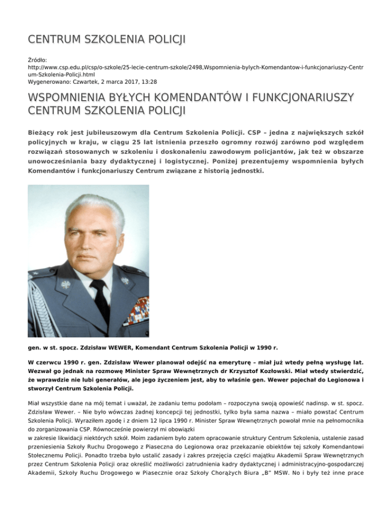 CENTRUM SZKOLENIA POLICJI Źródło: http://www.csp.edu.pl/csp/o-szkole/25-lecie-centrum-szkole/2498,Wspomnienia-bylych-Komendantow-i-funkcjonariuszy-Centr um-Szkolenia-Policji.html Wygenerowano: Czwartek, 2 marca 2017, 13:28 WSPOMNIENIA BYŁYCH KOMENDANTÓW I FUNKCJONARIUSZY CENTRUM SZKOLENIA POLICJI Bieżący rok jest jubileuszowym dla Centrum Szkolenia Policji. CSP – jedna z największych szkół policyjnych w kraju, w ciągu 25 lat istnienia przeszło ogromny rozwój zarówno pod względem rozwiązań stosowanych w szkoleniu i doskonaleniu zawodowym policjantów, jak też w obszarze unowocześniania bazy dydaktycznej i logistycznej. Poniżej prezentujemy wspomnienia byłych Komendantów i funkcjonariuszy Centrum związane z historią jednostki. gen. w st. spocz. Zdzisław WEWER, Komendant Centrum Szkolenia Policji w 1990 r. W czerwcu 1990 r. gen. Zdzisław Wewer planował odejść na emeryturę – miał już wtedy pełną wysługę lat. Wezwał go jednak na rozmowę Minister Spraw Wewnętrznych dr Krzysztof Kozłowski. Miał wtedy stwierdzić, że wprawdzie nie lubi generałów, ale jego życzeniem jest, aby to właśnie gen. Wewer pojechał do Legionowa i stworzył Centrum Szkolenia Policji. Miał wszystkie dane na mój temat i uważał, że zadaniu temu podołam – rozpoczyna swoją opowieść nadinsp. w st. spocz. Zdzisław Wewer. – Nie było wówczas żadnej koncepcji tej jednostki, tylko była sama nazwa – miało powstać Centrum Szkolenia Policji. Wyraziłem zgodę i z dniem 12 lipca 1990 r. Minister Spraw Wewnętrznych powołał mnie na pełnomocnika do zorganizowania CSP. Równocześnie powierzył mi obowiązki w zakresie likwidacji niektórych szkół. Moim zadaniem było zatem opracowanie struktury Centrum Szkolenia, ustalenie zasad przeniesienia Szkoły Ruchu Drogowego z Piaseczna do Legionowa oraz przekazanie obiektów tej szkoły Komendantowi Stołecznemu Policji. Ponadto trzeba było ustalić zasady i zakres przejęcia części majątku Akademii Spraw Wewnętrznych przez Centrum Szkolenia Policji oraz określić możliwości zatrudnienia kadry dydaktycznej i administracyjno-gospodarczej Akademii, Szkoły Ruchu Drogowego w Piasecznie oraz Szkoły Chorążych Biura „B” MSW. No i były też inne prace przygotowawcze. Po przyjeździe do Legionowa spotkałem się z tamtejszą kadrą, jak również z kadrą ze Szkoły Ruchu Drogowego w Piasecznie. Przez tę ostatnią zostałem przyjęty szczególnie życzliwie, bo tam kończyłem szkołę podoficerską, a później, po szkole oficerskiej w Szczytnie, trzymiesięczny kurs dla kierowników komórek ds. ruchu drogowego. Wspólnie przystąpiliśmy do określania struktury nowej szkoły, do której później dostosowywaliśmy stanowiska. Kierownictwo Ministerstwa Spraw Wewnętrznych zaakceptowało te propozycje bez żadnych zastrzeżeń. Następnie, z udziałem wiceministra Zimowskiego, została dokonana weryfikacja kadry i jej przydział do określonych stanowisk. W strukturze organizacyjnej uwzględniliśmy takie działy, jak: organizacja pracy, prawo, walka z przestępczością kryminalną, gospodarczą, prewencja, ruch drogowy, ale dostosowując się też do nowych warunków, nowych zadań, które czekały Policję, zwróciłem szczególną uwagę na organizowanie takich działów, jak: nauczanie języków obcych, informatyka i szkolenie z zakresu pirotechniki i walki z terroryzmem, bo w terenie Policja nie była wyposażona w tym zakresie, nie było też specjalistów – trzeba było korzystać z wojskowych zasobów. Rok wcześniej miałem możliwość poznania wyposażenia i szkolenia w tym zakresie policji węgierskiej i muszę przyznać, że byli dużo dalej w tych dziedzinach. Posiadali wyszkolonych pirotechników, jak również mieli sprzęt, roboty, urządzenia do wywożenia materiałów wybuchowych. Tego u nas nie było i dlatego uważałem, że w tym zakresie powinniśmy szkolić i wyposażać Policję. Niektórzy byli sceptyczni co do tego kierunku, ale jak czas pokazał, potrzeby przerosły nawet oczekiwania. 17 sierpnia 1990 r. zostałem mianowany na stanowisko komendanta Centrum Szkolenia Policji. Niestety, moje mianowanie niektórym politykom nie za bardzo się spodobało. W związku z tym złożyłem raport z prośbą o przejście na emeryturę i ostatecznie w styczniu 1991 r. odszedłem ze służby. Za swój duży sukces uważam samo zorganizowanie CSP – opracowanie struktury, dopasowanie kadry. Przecież wtedy nikt nie miał pojęcia, jaka to ma być koncepcja, jak to zorganizować, ale zostało to zrobione. Natomiast to, co nie do końca mi się udało, dotyczy logistyki, bo Legionowo było wówczas mocno zaniedbane. Czy dziś tworzyłbym CSP w ten sam sposób? No cóż, czas zawsze zmienia oczekiwania, potrzeby i zawsze trzeba się dostosowywać, a szczególnie, jeżeli chodzi o Policję. Policja nie może być zaściankowa, musi się rozwijać i dostosowywać do nowych warunków i wyzwań. Dziś na przykład przestępczość kształtuje się inaczej, są nowe rodzaje przestępstw, przestępcy też dysponują coraz lepszym sprzętem, Policja więc musi się do tego dostosować. Tak pod względem kadrowym, jak i wyposażenia oraz szkolenia. Lata dziewięćdziesiąte to był okres rozchwiania, zwolnień, braku pewności. W takiej atmosferze pracownicy nie angażują się tak jak powinni. Ja jednak uważałem, że do końca trzeba solidnie pracować, i uważam, że zadanie, które powierzył mi minister, wykonałem solidnie. oprac. asp. szt. Piotr Budzyń insp. w st. spocz. dr STANISŁAW LASKUS, Komendant Centrum Szkolenia Policji w latach 1990-1991 Kiedy nastąpił przełom 1989 r., dający najważniejszy impuls do zmian ustrojowych, pułkownik dr Stanisław Laskus był komendantem Szkoły Ruchu Drogowego MO w Piasecznie pod Warszawą. W ramach reorganizacji szkolnictwa resortowego jednostka ta została włączona w skład tworzonego Centrum Szkolenia Policji. Dlatego też kierowana przez niego 
