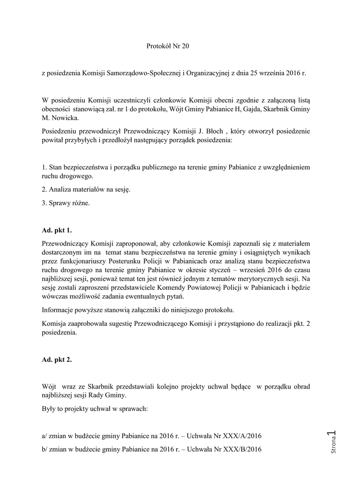 Protokół Nr 20 z posiedzenia Komisji Samorządowo-Społecznej i Organizacyjnej z dnia 25 września 2016 r. W posiedzeniu Komisji uczestniczyli członkowie Komisji obecni zgodnie z załączoną listą obecności stanowiącą zał. nr 1 do protokołu, Wójt Gminy Pabianice H, Gajda, Skarbnik Gminy M. Nowicka. Posiedzeniu przewodniczył Przewodniczący Komisji J. Błoch , który otworzył posiedzenie powitał przybyłych i przedłożył następujący porządek posiedzenia: 1. Stan bezpieczeństwa i porządku publicznego na terenie gminy Pabianice z uwzględnieniem ruchu drogowego. 2. Analiza materiałów na sesję. 3. Sprawy różne. Ad. pkt 1. Przewodniczący Komisji zaproponował, aby członkowie Komisji zapoznali się z materiałem dostarczonym im na temat stanu bezpieczeństwa na terenie gminy i osiągniętych wynikach przez funkcjonariuszy Posterunku Policji w Pabianicach oraz analizą stanu bezpieczeństwa ruchu drogowego na terenie gminy Pabianice w okresie styczeń – wrzesień 2016 do czasu najbliższej sesji, ponieważ temat ten jest również jednym z tematów merytorycznych sesji. Na sesję zostali zaproszeni przedstawiciele Komendy Powiatowej Policji w Pabianicach i będzie wówczas możliwość zadania ewentualnych pytań. Informacje powyższe stanowią załączniki do niniejszego protokołu. Komisja zaaprobowała sugestię Przewodniczącego Komisji i przystąpiono do realizacji pkt. 2 posiedzenia. Ad. pkt 2. Wójt wraz ze Skarbnik przedstawiali kolejno projekty uchwał będące w porządku obrad najbliższej sesji Rady Gminy. b/ zmian w budżecie gminy Pabianice na 2016 r. – Uchwała Nr XXX/B/2016 Strona a/ zmian w budżecie gminy Pabianice na 2016 r. – Uchwała Nr XXX/A/2016 1 Były to projekty uchwał w sprawach: c/ zmian w budżecie gminy Pabianice na 2016 r. – Uchwała Nr XXX/C/2016 d/ zmian w budżecie gminy Pabianice na 2016 r. – Uchwała Nr XXX/D/2016 e/ zmian w budżecie gminy Pabianice na 2016 r. – Uchwała Nr XXX/E /2016 f/ ustalenia stawek podatku od nieruchomości na rok2017 – Uchwała Nr XXX/F/2016 g/ określenia wysokości stawek podatku od środków transportowych – Uchwała Nr XXX/G/2016 h/określenia zwolnień w podatkach lokalnych na 2017 rok. – Uchwała Nr XXX/H/2016 i/ zmian w budżecie gminy na 2016 – Uchwała Nr XXX/I/2016 j/ zmian w budżecie gminy na 2016 – Uchwała Nr XXX/J/2016 k/ zmieniająca Uchwałę Nr XXVI/224/ 2012 Rady Gminy Pabianice z dnia 29 października 2012 r. w sprawie nadania statutu Publicznego Zakładu Opieki Zdrowotnej – Gminnego Ośrodka Zdrowia w Petrykozach – Uchwała Nr XXX/K/2016 - zmian w Wieloletniej Prognozie Finansowej uchwalonej Uchwałą Nr XVIII/167/2016 Rady Gminy Pabianice z dnia 15 stycznia 2016r. –Uchwała Nr XXX/ /2016 Projekty uchwał stanowią załączniki do protokołu od nr 2 do nr 12. Wyjaśnienia do projektów uchwał stanowią zał. nr 13 do protokołu. Wójt poinformował, że będzie występował na sesji Rady Gminy z wnioskiem o wprowadzenie dodatkowych projektów uchwał; będzie to projekt uchwały zmieniającej Uchwałę Nr XXI/190/2016 Rady Gminy Pabianice z dnia 30 marca 2016 r. w sprawie zasad udzielenia dotacji celowej na dofinansowanie kosztów inwestycji z zakresu ochrony środowiska i gospodarki wodnej do budowy przyłączy kanalizacyjnych i przydomowych oczyszczalni ścieków, w której zmienia się zapis § 3 pkt. 3 i otrzymuje brzmienie „dla przyłącza kanalizacyjnego wraz z przepompownią ścieków ustala się sumę kosztów wymienionych w pkt. 1 oraz kwotę ryczałtu w wysokości 7 tys. zł. ” Projekt powyższej uchwały stanowi zał. nr 14 do protokołu. Drugi projekt uchwały, o którego wprowadzenie będzie wnioskował Wójt to projekt uchwały w sprawie zmian w budżecie gminy Pabianice polegający na włączeniu do budżetu środków Krajowego Funduszu Szkoleniowego na dofinansowanie kształcenia ustawicznego (kwota 5.760 zł.). Komisja do przedłożonych projektów uchwał nie wniosła uwag. Strona W sprawach różnych Przewodniczący Komisji J. Błoch zapoznał Komisją z pismem jakie Wójt skierował do Kierownika PZOZ Gminnego Ośrodka Zdrowia w Petrykozach, które zostało wystosowane w związku z wnioskiem Komisji Samorządowo Społecznej i Organizacyjnej w sprawie szczepień przeciwko wirusowi HPV. 2 Ad. pkt 3. Kserokopia pisma w załączeniu do niniejszego protokołu jako zał. nr 15. Kolejne pisma, z którymi zapoznał Komisję Przewodniczący Komisji to były pisma Ludowego Klubu Sportowego „Jutrzenka” w Bychlewie: 1/ pismo z dnia 11.08.2016 data wpływu do Urzędu Gminy 13.10.2016 r., w którym zarząd zwraca się z prośbą o sfinansowanie rozbudowy budynku klubowego w Bychlewie 2/ pismo z dnia 12.10.2016 r. data wpływu do Urzędu Gminy 13.10.2016 o sfinansowanie monitoringu na terenie obiektu kulturalno – sportowego w Bychlewie, z którego boisk i obiektu socjalnego korzysta klub. 3/ pismo z dnia 11.08.2016 r. data wpływu 13.10.2016 w sprawie sfinansowania remontu płyty boiska do piłki nożnej . Wójt Gminy zabierając głos powiedział, że jego zdaniem wszystkie sprawy, z którymi występuje w powyższych wnioskach LKS Jutrzenka są wnioskami do rozpatrzenia w budżetach gminy na kolejne lata. Nie jest możliwe na pewno ujęcie ich w budżecie przyszłego roku z uwagi na pilniejsze sprawy. Czeka nas reforma oświatowa, będą na pewno w związku z tym zwiększone potrzeby dla szkół. Jeżeli chodzi o płytę boiska Komisja stwierdziła, że podczas wyjazdowego posiedzenia i objazdu klubów sportowych nie stwierdziła pilnej potrzeby remontu płyty boiska. W pierwszej kolejności na pewno należy przeznaczyć środki na budowę sal gimnastycznych oraz boiska w Pawlikowicach przy szkole , które zostało zniszczone przez dziki. W tym miejscu Wójt poinformował, że jeżeli chodzi o boisko w Pawlikowicach jest plan aby w 2017 roku wykonać projekt boiska wielofunkcyjnego przy tej szkole. Ponadto Komisja w sprawie monitoringu na t