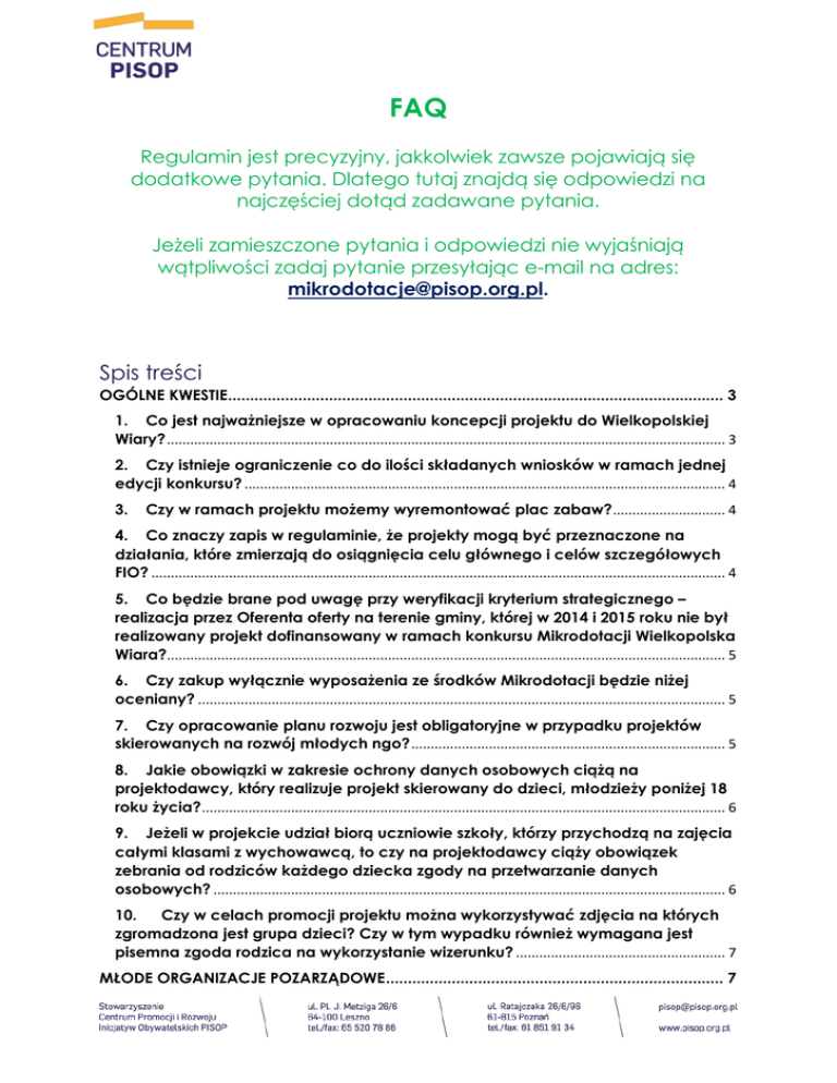 FAQ Regulamin jest precyzyjny, jakkolwiek zawsze pojawiają się dodatkowe pytania. Dlatego tutaj znajdą się odpowiedzi na najczęściej dotąd zadawane pytania. Jeżeli zamieszczone pytania i odpowiedzi nie wyjaśniają wątpliwości zadaj pytanie przesyłając e-mail na adres: [email protected]. Spis treści OGÓLNE KWESTIE................................................................................................................. 3 1. Co jest najważniejsze w opracowaniu koncepcji projektu do Wielkopolskiej Wiary? ................................................................................................................................................ 3 2. Czy istnieje ograniczenie co do ilości składanych wniosków w ramach jednej edycji konkursu? ............................................................................................................................ 4 3. Czy w ramach projektu możemy wyremontować plac zabaw? ............................. 4 4. Co znaczy zapis w regulaminie, że projekty mogą być przeznaczone na działania, które zmierzają do osiągnięcia celu głównego i celów szczegółowych FIO? .................................................................................................................................................... 4 5. Co będzie brane pod uwagę przy weryfikacji kryterium strategicznego – realizacja przez Oferenta oferty na terenie gminy, której w 2014 i 2015 roku nie był realizowany projekt dofinansowany w ramach konkursu Mikrodotacji Wielkopolska Wiara?................................................................................................................................................ 5 6. Czy zakup wyłącznie wyposażenia ze środków Mikrodotacji będzie niżej oceniany? ........................................................................................................................................ 5 7. Czy opracowanie planu rozwoju jest obligatoryjne w przypadku projektów skierowanych na rozwój młodych ngo? ................................................................................. 5 8. Jakie obowiązki w zakresie ochrony danych osobowych ciążą na projektodawcy, który realizuje projekt skierowany do dzieci, młodzieży poniżej 18 roku życia? ....................................................................................................................................... 6 9. Jeżeli w projekcie udział biorą uczniowie szkoły, którzy przychodzą na zajęcia całymi klasami z wychowawcą, to czy na projektodawcy ciąży obowiązek zebrania od rodziców każdego dziecka zgody na przetwarzanie danych osobowych? .................................................................................................................................... 6 10. Czy w celach promocji projektu można wykorzystywać zdjęcia na których zgromadzona jest grupa dzieci? Czy w tym wypadku również wymagana jest pisemna zgoda rodzica na wykorzystanie wizerunku? ...................................................... 7 MŁODE ORGANIZACJE POZARZĄDOWE ............................................................................. 7 1. Reprezentuję organizacją pozarządową – jakie warunki musimy spełnić, aby ubiegać się o dofinansowanie? ................................................................................................ 7 2. Organizacja pozarządowa, czyli kto? ............................................................................. 8 3. Jak weryfikowana będzie wartość budżetu młodej ngo, w kontekście nie przekroczenia wartości 25 tysięcy rocznie?........................................................................... 8 4. Organizacja jest w trakcie rejestracji w KRS. Złożyła wniosek ale sąd jeszcze nie wpisał organizacji do KRS. Wpis nastąpi dopiero po terminie wpływania ofert. Czy organizacja jest podmiotem uprawnionym? ................................................................ 8 5. Czy członkowie stowarzyszenia realizującego projekt mogą być odbiorcami projektu? Czy mogą np. brać udział w zajęciach organizowanych w ramach działań projektowych?................................................................................................................. 9 6. Na czym polega realizacja projektu skierowanego na rozwój młodej organizacji? ..................................................................................................................................... 9 GRUPY NIEFORMALNE I SAMOPOMOCOWE ...................................................................... 9 1. Reprezentuję grupę nieformalną nieposiadającą osobowości prawnej, w jaki sposób będą przekazywane środki finansowe? ................................................................... 9 2. Kto może być Patronem dla grupy nieformalnej i jaka jest jego rola?................ 10 3. Czy Patron może mieć siedzibę poza terenem województwa wielkopolskiego? 10 4. Czy budżet projektu może obejmować koszty administracyjne ponoszone przez Patrona? .............................................................................................................................. 10 5. Czy cele dla których powołano grupę nieformalną oraz zakres realizacji projektu może pokrywać się z zakresem działań prowadzonych przez Patrona? .. 10 6. Czy w skład grupy nieformalnej mogą wchodzić osoby niepełnoletnie? ......... 10 7. Co to jest grupa samopomocowa?................................................................................ 10 8. Co to jest grupa samopomocowa posiadająca osobowość prawną? ............... 11 9. W przypadku grupy nieformalnej kto staje się właścicielem sprzętu po zakończeniu realizacji projektu? ............................................................................................. 11 10. Czy Patronem może być gmina, samorząd, firma?............................................... 11 11. Czy grupa nieformalna z P