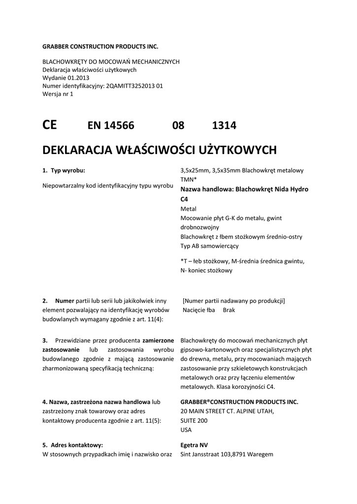GRABBER CONSTRUCTION PRODUCTS INC. BLACHOWKRĘTY DO MOCOWAŃ MECHANICZNYCH Deklaracja właściwości użytkowych Wydanie 01.2013 Numer identyfikacyjny: 2QAMITT3252013 01 Wersja nr 1 CE EN 14566 08 1314 DEKLARACJA WŁAŚCIWOŚCI UŻYTKOWYCH 1. Typ wyrobu: Niepowtarzalny kod identyfikacyjny typu wyrobu 3,5x25mm, 3,5x35mm Blachowkręt metalowy TMN* Nazwa handlowa: Blachowkręt Nida Hydro C4 Metal Mocowanie płyt G-K do metalu, gwint drobnozwojny Blachowkręt z łbem stożkowym średnio-ostry Typ AB samowiercący *T – łeb stożkowy, M-średnia średnica gwintu, N- koniec stożkowy 2. Numer partii lub serii lub jakikolwiek inny element pozwalający na identyfikację wyrobów budowlanych wymagany zgodnie z art. 11(4): [Numer partii nadawany po produkcji] Nacięcie łba Brak 3. Przewidziane przez producenta zamierzone zastosowanie lub zastosowania wyrobu budowlanego zgodnie z mającą zastosowanie zharmonizowaną specyfikacją techniczną: Blachowkręty do mocowań mechanicznych płyt gipsowo-kartonowych oraz specjalistycznych płyt do drewna, metalu, przy mocowaniach mających zastosowanie przy szkieletowych konstrukcjach metalowych oraz przy łączeniu elementów metalowych. Klasa korozyjności C4. 4. Nazwa, zastrzeżona nazwa handlowa lub zastrzeżony znak towarowy oraz adres kontaktowy producenta zgodnie z art. 11(5): GRABBER®CONSTRUCTION PRODUCTS INC. 20 MAIN STREET CT. ALPINE UTAH, SUITE 200 USA 5. Adres kontaktowy: W stosownych przypadkach imię i nazwisko oraz Egetra NV Sint Jansstraat 103,8791 Waregem adres kontaktowy przedstawiciela upoważnionego do wykonywania czynności określonych w art. 12(2): 6. Ocena i weryfikacja stałości właściwości użytkowych: System lub systemy oceny i weryfikacji stałości właściwości użytkowych wyrobu budowlanego wg CPR określone w załączniku nr V: Belgia System 4 Wyrób/Wyroby Blachowkręty do mocowań mechanicznych Zamierzone zastosowanie/nia Punkt 1 Poziom/y i klasa/y Wszystkie Deklaracja zgodności systemu/ów System 4: Patrz: Dyrektywa 89/106/EWG (CPD) Załącznik III.2.(ii), trzecia możliwość. 7. Jednostka notyfikowana (hEN): W przypadku deklaracji właściwości użytkowych dotyczących wyrobu budowlanego objętego normą zharmonizowaną: NIE DOTYCZY EN 14566:2009-10 8. Jednostka notyfikowana (ETA) W przypadku deklaracji właściwości użytkowych dotyczących wyrobu budowlanego, dla którego wydano Europejską Aprobatę Techniczną: Nie dotyczy (patrz: 7) 9. Deklaracja właściwości użytkowych TMN Płyta wiórowa/Metal mocowanie płyt G-K do metalu, gwint drobnozwojny WYRÓB: Blachowkręty do mocowań mechanicznych stosowane przy mocowaniu płyt gipsowokartonowych ZAMIERZONE ZASTOSOWANIE: patrz punkt 1 Zasadnicze charakterystyki Wymóg/poziom lub klasa Reakcja na ogień (produkt nieosłonięty) A1 –F WYNIK A1 Pozytywny Wytrzymałość na rozciąganie (zginanie) GRABBER CONSTRUCTION PRODUCTS INC. 20 Main Street Ct. Suite 200 Alpine Utah 84004 Zharmonizowana specyfikacja techniczna >10° EN 14566:200910 Pozytywny “Wybór Profesjonalisty” 10. Deklaracja Stwierdza się zgodność właściwości użytkowych wyrobu określonego w pkt. 1 i 2 z właściwościami użytkowymi deklarowanymi w pkt. 9. Niniejsza deklaracja właściwości użytkowych zostaje wydana na wyłączną odpowiedzialność producenta określonego w pkt. 4. W imieniu producenta podpisał: Doug Holmberg Kierownik ds. Jakości 205 Manson Circle Concord CA 925-680-0777 x 225 [email protected] www.Grabberman.com Informacje dotyczące ekologii, zdrowia i bezpieczeństwa (REACH) Wyrób niniejszy stanowi przedmiot określony w art. 3 rozporządzenia (WE) Nr 1907/2006 (REACH). Nie zawiera substancji, które powinny się uwalniać podczas odpowiedniego użytkowania w przewidzianych warunkach. Karta bezpieczeństwa zgodnie z art. 31 tego samego rozporządzenia nie jest wymagana do dopuszczenia wyrobu do obrotu, transportu lub użytkowania. W celu zachowania bezpieczeństwa użytkowania, należy przestrzegać instrukcji zawartych w karcie charakterystyki wyrobu. Wedle naszej najlepszej wiedzy, wyrób nie zawiera substancji wzbudzających szczególnie duże obawy (SVHC) wyszczególnionych w załączniku XIV rozporządzenia REACH ani substancji umieszczonych na liście kandydackiej opublikowanej przez Europejską Agencję Chemikaliów w stężeniu wagowym przekraczającym 0,1%. Nota prawna: Informacja ta podana jest w dobrej wierze na podstawie aktualnej wiedzy i doświadczenia firmy Grabber związanych z wyrobami przechowywanymi, dostarczanymi i użytkowanymi w odpowiednich warunkach, zgodnie ze wskazówkami firmy. W praktyce różnice w materiałach, podłożu i faktycznych warunkach w miejscu zastosowania nie gwarantują przydatności handlowej czy przydatności do określonego celu. Niniejsza informacja, podobnie jak udzielone na piśmie porady lub zalecenia, nie stanowią podstawy do nawiązania jakiegokolwiek stosunku prawnego czy pociągnięcia producenta do wynikającej z niego odpowiedzialności. Użytkownik wyrobu zobowiązany jest do sprawdzenia czy wyrób nadaje się do zamierzonego przez niego zastosowania. Firma Grabber zastrzega sobie prawo do zmiany właściwości swoich wyrobów. Wymagane jest przestrzeganie praw własności osób trzecich. Wszelkie zamówienia przyjmowane są zgodnie z aktualnie obowiązującymi warunkami sprzedaży i dostawy. Użytkowników wyrobów prosi się o każdorazowe odwoływanie się do najnowszego wydania karty charakterystyki wyrobu, której egzemplarze dostępne są na żądanie.