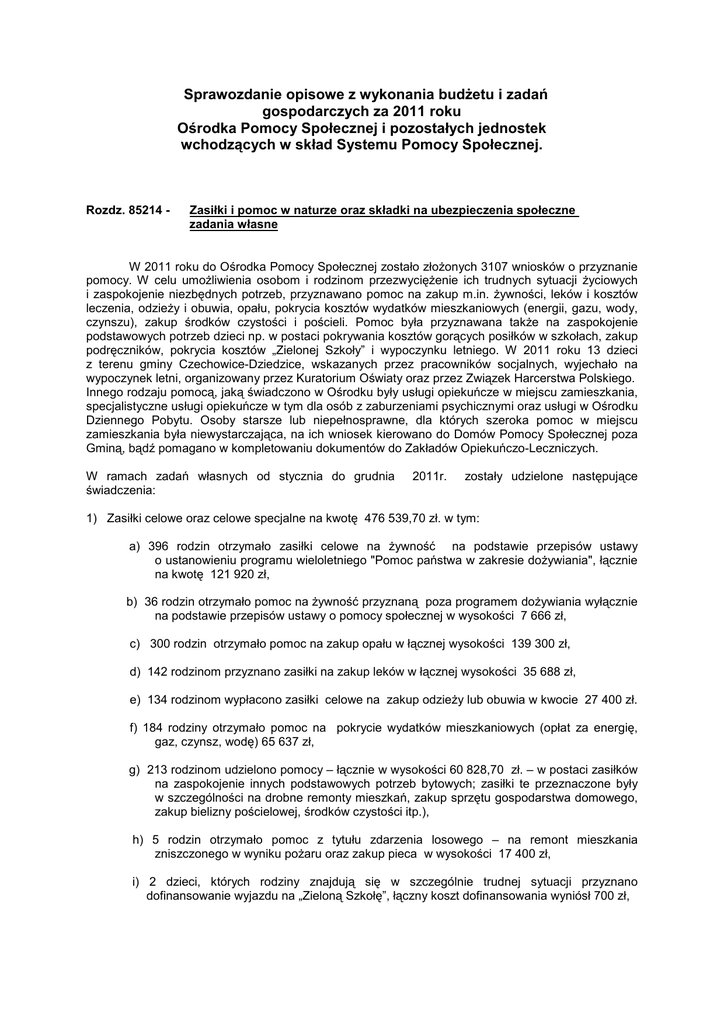 Sprawozdanie opisowe z wykonania budżetu i zadań gospodarczych za 2011 roku Ośrodka Pomocy Społecznej i pozostałych jednostek wchodzących w skład Systemu Pomocy Społecznej. Rozdz. 85214 - Zasiłki i pomoc w naturze oraz składki na ubezpieczenia społeczne zadania własne W 2011 roku do Ośrodka Pomocy Społecznej zostało złożonych 3107 wniosków o przyznanie pomocy. W celu umożliwienia osobom i rodzinom przezwyciężenie ich trudnych sytuacji życiowych i zaspokojenie niezbędnych potrzeb, przyznawano pomoc na zakup m.in. żywności, leków i kosztów leczenia, odzieży i obuwia, opału, pokrycia kosztów wydatków mieszkaniowych (energii, gazu, wody, czynszu), zakup środków czystości i pościeli. Pomoc była przyznawana także na zaspokojenie podstawowych potrzeb dzieci np. w postaci pokrywania kosztów gorących posiłków w szkołach, zakup podręczników, pokrycia kosztów „Zielonej Szkoły” i wypoczynku letniego. W 2011 roku 13 dzieci z terenu gminy Czechowice-Dziedzice, wskazanych przez pracowników socjalnych, wyjechało na wypoczynek letni, organizowany przez Kuratorium Oświaty oraz przez Związek Harcerstwa Polskiego. Innego rodzaju pomocą, jaką świadczono w Ośrodku były usługi opiekuńcze w miejscu zamieszkania, specjalistyczne usługi opiekuńcze w tym dla osób z zaburzeniami psychicznymi oraz usługi w Ośrodku Dziennego Pobytu. Osoby starsze lub niepełnosprawne, dla których szeroka pomoc w miejscu zamieszkania była niewystarczająca, na ich wniosek kierowano do Domów Pomocy Społecznej poza Gminą, bądź pomagano w kompletowaniu dokumentów do Zakładów Opiekuńczo-Leczniczych. W ramach zadań własnych od stycznia do grudnia świadczenia: 2011r. zostały udzielone następujące 1) Zasiłki celowe oraz celowe specjalne na kwotę 476 539,70 zł. w tym: a) 396 rodzin otrzymało zasiłki celowe na żywność na podstawie przepisów ustawy o ustanowieniu programu wieloletniego "Pomoc państwa w zakresie dożywiania", łącznie na kwotę 121 920 zł, b) 36 rodzin otrzymało pomoc na żywność przyznaną poza programem dożywiania wyłącznie na podstawie przepisów ustawy o pomocy społecznej w wysokości 7 666 zł, c) 300 rodzin otrzymało pomoc na zakup opału w łącznej wysokości 139 300 zł, d) 142 rodzinom przyznano zasiłki na zakup leków w łącznej wysokości 35 688 zł, e) 134 rodzinom wypłacono zasiłki celowe na zakup odzieży lub obuwia w kwocie 27 400 zł. f) 184 rodziny otrzymało pomoc na pokrycie wydatków mieszkaniowych (opłat za energię, gaz, czynsz, wodę) 65 637 zł, g) 213 rodzinom udzielono pomocy – łącznie w wysokości 60 828,70 zł. – w postaci zasiłków na zaspokojenie innych podstawowych potrzeb bytowych; zasiłki te przeznaczone były w szczególności na drobne remonty mieszkań, zakup sprzętu gospodarstwa domowego, zakup bielizny pościelowej, środków czystości itp.), h) 5 rodzin otrzymało pomoc z tytułu zdarzenia losowego – na remont mieszkania zniszczonego w wyniku pożaru oraz zakup pieca w wysokości 17 400 zł, i) 2 dzieci, których rodziny znajdują się w szczególnie trudnej sytuacji przyznano dofinansowanie wyjazdu na „Zieloną Szkołę”, łączny koszt dofinansowania wyniósł 700 zł, 2) 9 osobom bezdomnym, w tym: 5 samotnym mężczyznom oraz 1 czteroosobowej rodzinie przyznano pokrycie kosztów schronienia poza gminą. Łącznie koszt tej pomocy wyniósł 39 726,41 zł. 3) w ramach programu „Pomoc państwa w zakresie dożywiania” z wyżywienia w szkołach w formie śniadań i obiadów skorzystało 349 uczniów – koszt przyznanych obiadów wyniósł 55 069,64 zł, 4) 125 dzieciom z rodzin niepełnych lub nieradzących sobie z problemami opiekuńczymi opłacono koszty pobytu i żywienia w przedszkolach. Na terenie gminy z tej formy pomocy korzystały przede wszystkim dzieci uczęszczające do oddziałów „zerowych”, a także dzieci młodsze – szczególnie w przypadku matek samotnie wychowujących dzieci i pracujących zawodowo lub matek intensywnie poszukujących zatrudnienia. Koszt tej formy pomocy wyniósł łącznie 49 341,33 zł; w tym: – w ramach programu „Pomoc państwa w zakresie dożywiania” wydano kwotę 22 790,50 zł. 5) Na pokrycie kosztów wyżywienia w Jadłodajni i Ośrodku Dziennego Pobytu oraz dwóch stołówkach wydatkowano kwotę 17 394,69 zł; w tym: - w ramach programu „Pomoc państwa w zakresie dożywiania” koszt posiłku osób dorosłych wyniósł 8 773,21 zł. - kwotę 8.621,48zł przeznaczono na pokrycie kosztów całodziennego wyżywienia 6 osób korzystających z nieodpłatnie z usług ODP w dziale osób starszych, 1 dziecka w dziale dzieci, oraz na zrefundowanie kosztów wyżywienia 1 osoby bezdomnej poza gminą. 6) 16 osób korzystało z pomocy rzeczowej w formie bonów żywnościowych realizowanych w sklepie „ZETA”. Łączny koszt tej formy pomocy wyniósł 2 960 zł, 7) w okresie od stycznia do grudnia 2011 roku Ośrodek pokrył koszty pogrzebu 3 osobom w wysokości 11 253 zł, Podstawową formą pracy pracowników socjalnych jest praca socjalna, która jest działalnością zawodową mającą na celu pomoc osobom i rodzinom we wzmacnianiu lub odzyskiwaniu zdolności do funkcjonowania w społeczeństwie, poprzez pełnienie odpowiednich ról społecznych. W ramach pracy socjalnej 2011r. pracownicy socjalni podpisali i realizowali 101 kontraktów socjalnych. Celami nadrzędnymi kontraktów były głównie: poprawa funkcjonowania rodziny lub wyjście z trudnej sytuacji, w jakiej rodzina się znalazła, podjęcie leczenia odwykowego, podjęcie zatrudnienia. Czas realizacji kontraktu to zazwyczaj kilka miesięcy z możliwością przedłużenia. W kontraktach realizowano najczęściej kilka celów istotnych dla konkretnej osoby/rodziny. Pomoc w formie pracy socjalnej była udzielana również osobom i rodzinom, które nie korzystały w tym czasie z pomocy finansowej lub rzeczowej z Ośrodka Pomocy Społecznej. W 2011 roku pracownicy 