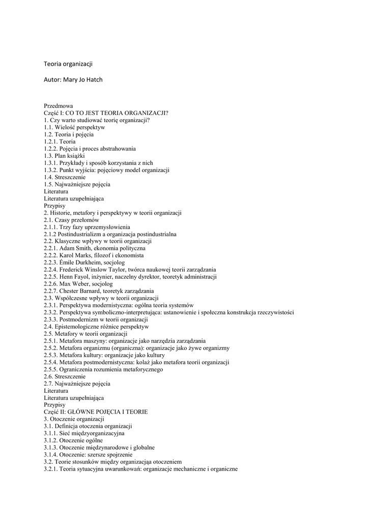 Teoria organizacji Autor: Mary Jo Hatch Przedmowa Część I: CO TO JEST TEORIA ORGANIZACJI? 1. Czy warto studiować teorię organizacji? 1.1. Wielość perspektyw 1.2. Teoria i pojęcia 1.2.1. Teoria 1.2.2. Pojęcia i proces abstrahowania 1.3. Plan książki 1.3.1. Przykłady i sposób korzystania z nich 1.3.2. Punkt wyjścia: pojęciowy model organizacji 1.4. Streszczenie 1.5. Najważniejsze pojęcia Literatura Literatura uzupełniająca Przypisy 2. Historie, metafory i perspektywy w teorii organizacji 2.1. Czasy przełomów 2.1.1. Trzy fazy uprzemysłowienia 2.1.2 Postindustrializm a organizacja postindustrialna 2.2. Klasyczne wpływy w teorii organizacji 2.2.1. Adam Smith, ekonomia polityczna 2.2.2. Karol Marks, filozof i ekonomista 2.2.3. Émile Durkheim, socjolog 2.2.4. Frederick Winslow Taylor, twórca naukowej teorii zarządzania 2.2.5. Henn Fayol, inżynier, naczelny dyrektor, teoretyk administracji 2.2.6. Max Weber, socjolog 2.2.7. Chester Barnard, teoretyk zarządzania 2.3. Współczesne wpływy w teorii organizacji 2.3.1. Perspektywa modernistyczna: ogólna teoria systemów 2.3.2. Perspektywa symboliczno-interpretująca: ustanowienie i społeczna konstrukcja rzeczywistości 2.3.3. Postmodernizm w teorii organizacji 2.4. Epistemologiczne różnice perspektyw 2.5. Metafory w teorii organizacji 2.5.1. Metafora maszyny: organizacje jako narzędzia zarządzania 2.5.2. Metafora organizmu (organiczna): organizacje jako żywe organizmy 2.5.3. Metafora kultury: organizacje jako kultury 2.5.4. Metafora postmodernistyczna: kolaż jako metafora teorii organizacji 2.5.5. Ograniczenia rozumienia metaforycznego 2.6. Streszczenie 2.7. Najważniejsze pojęcia Literatura Literatura uzupełniająca Przypisy Część II: GŁÓWNE POJĘCIA I TEORIE 3. Otoczenie organizacji 3.1. Definicja otoczenia organizacji 3.1.1. Sieć międzyorganizacyjna 3.1.2. Otoczenie ogólne 3.1.3. Otoczenie międzynarodowe i globalne 3.1.4. Otoczenie: szersze spojrzenie 3.2. Teorie stosunków między organizacjąa otoczeniem 3.2.1. Teoria sytuacyjna uwarunkowań: organizacje mechaniczne i organiczne 3.2.2. Teoria zależności od zasobów 3.2.3. Ekologia populacji 3.2.4. Teoria instytucjonalna 3.2.5. Porównanie teorii stosunków między organizacją a otoczeniem 3.3. Złożoność, zmiana, niepewność 3.3.1. Buforowanie i rozszerzanie granic 3.3.2. Punkt widzenia teorii ustanowienia i społecznej konstrukcji rzeczywistości 3.3.3. Postmodernizm a stosunki między organizacją i otoczeniem 3.4. Streszczenie: jak analizować otoczenie organizacji 3.5. Najważniejsze pojęcia Literatura 2 Literatura uzupełniająca Przypisy 4. Strategia i cele 4.1. Dopasowanie strategiczne 4.2. Proces strategiczny jako racjonalne podejmowanie decyzji 4.2.1. Analiza 4.2.2. Sformułowanie strategii 4.2.3. Wdrażanie strategii 4.3. Trudności modelu racjonalnego 4.3.1. Strategie samorzutne (wyłaniające się), emergentne 4.3.2. Strategia jako działanie symboliczne 4.3.3. Trzy alternatywne spojrzenia na strategię 4.4. Niepewność a proces strategiczny 4.4.1. Postmodernistyczne postscriptum 4.5. Cele 4.5.1. Cele oficjalne a cele operacyjne 4.5.2. Wielość celów i konflikty między nimi 4.6. Streszczenie 4.7. Najważniejsze pojęcia Literatura Literatura uzupełniająca Przypisy 5. Technologia 5.1. Definicja technologii 5.1.1. Dynamiczne spojrzenie na technologię 5.1.2. Główna technologia 5.1.3. Technologia wysoko zaawansowana 5.1.4. Technologie świadczenia usług a technologie produkcji 5.2. Typy technologii 5.2.1. Typologia Woodward 5.2.2. Typologia Thompsona 5.2.3. Typologia Perrowa 5.2.4. Korzystanie z tych trzech typologii 5.3. Technologia a struktura społeczna 5.3.1. Imperatyw technologiczny 5.3.2. Złożoność techniczna, niepewność i rutyna 5.3.3. Współzależność zadań a mechanizmy koordynacyjne 5.3.4. Technologia a przetwarzanie informacji 5.4. Społeczna konstrukcja technologii 5.5. Rozumienie nowych technologii 5.5.1. Cechy nowych technologii 5.5.2. Postmodernizm i nowe technologie 5.6. Streszczenie 5.7. Najważniejsze pojęcia Literatura Literatura uzupełniająca Przypisy 6. Struktura społeczna organizacji 6.1. Struktura społeczna jako dyferencjacja i integracja 6.2. Co to jest społeczna struktura organizacji? 6.2.1. Hierarchia autorytetu 6.2.2. Podział pracy 6.2.3. Mechanizmy koordynacji 6.2.4. Parametry społecznej struktury organizacji 6.2.5. Organizacje mechaniczne organiczne i biurokratyczne 6.3. Biurokracja 6.4. Dynamiczne modele struktury społecznej 6.4.1. Cykl życiowy organizacji 6.4.2. Rozwój struktur społecznych według modelu systemów otwartych 6.4.3. Teoria strukturalizacji 6.5. Opis, analiza i projektowanie struktur społecznych organizacji 6.5.1. Struktura prosta 6.5.2. Struktura funkcjonalna 6.5.3. Struktura wielozakładowa 6.5.4. Struktura macierzowa 3 6.5.5. Struktura hybrydowa 6.5.6. Struktura sieciowa 6.5.7. Układ struktury a logika organizacji 6.6. Organizacje ponadnarodowe i globalne 6.7. Streszczenie 6.8. Najważniejsze pojęcia Literatura Literatura uzupełniająca Przypisy 7. Kultura organizacji 7.1. Co to jest kultura organizacji? 7.2. Narodowościowe różnice kulturowe w organizacjach 7.3. Model kultury organizacji według Scheina 7.3.1. Przekonania i założenia 7.3.2. Normy i wartości 7.3.3. Artefakty 7.3.4. Jak działa kultura 7.4. Symboliczno-interpretująca teoria kultury organizacji 7.4.1. Symbole 7.4.2. Interpretacja 7.4.3. Etnografia: jak prowadzić badania kultury organizacji 7.4.4. Przykład analizy kultury 7.5. Subkultury w organizacjach 7.5.1. Typy subkultur 7.5.2. Dlaczego istnieją subkultury? 7.6. Kultura jako fragmentacja: stanowisko postmodernistyczne 7.7. Kultura z perspektywy modernistycznej 7.7.1. Zarządzanie kulturą 7.8. Streszczenie 7.9. Najważniejsze pojęcia Literatura Literatura uzupełniająca Przypisy 8. Fizyczna struktura organizacji 8.1. Definicja struktury fizycznej 8.1.1. Geografia organizacyjna 8.1.2. Rozkład przestrzenny 8.1.3. Architektur