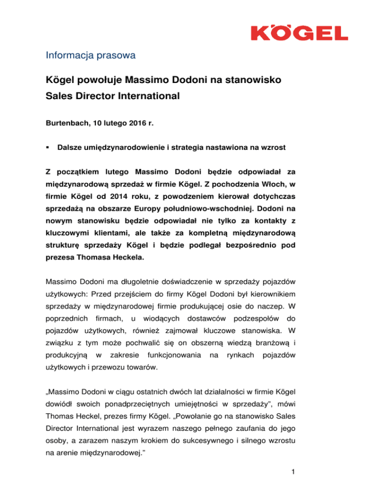 Informacja prasowa Kögel powołuje Massimo Dodoni na stanowisko Sales Director International Burtenbach, 10 lutego 2016 r. Dalsze umiędzynarodowienie i strategia nastawiona na wzrost Z początkiem lutego Massimo Dodoni będzie odpowiadał za międzynarodową sprzedaż w firmie Kögel. Z pochodzenia Włoch, w firmie Kögel od 2014 roku, z powodzeniem kierował dotychczas sprzedażą na obszarze Europy południowo-wschodniej. Dodoni na nowym stanowisku będzie odpowiadał nie tylko za kontakty z kluczowymi klientami, ale także za kompletną międzynarodową strukturę sprzedaży Kögel i będzie podlegał bezpośrednio pod prezesa Thomasa Heckela. Massimo Dodoni ma długoletnie doświadczenie w sprzedaży pojazdów użytkowych: Przed przejściem do firmy Kögel Dodoni był kierownikiem sprzedaży w międzynarodowej firmie produkującej osie do naczep. W poprzednich firmach, u wiodących dostawców podzespołów do pojazdów użytkowych, również zajmował kluczowe stanowiska. W związku z tym może pochwalić się on obszerną wiedzą branżową i produkcyjną w zakresie funkcjonowania na rynkach pojazdów użytkowych i przewozu towarów. „Massimo Dodoni w ciągu ostatnich dwóch lat działalności w firmie Kögel dowiódł swoich ponadprzeciętnych umiejętności w sprzedaży”, mówi Thomas Heckel, prezes firmy Kögel. „Powołanie go na stanowisko Sales Director International jest wyrazem naszego pełnego zaufania do jego osoby, a zarazem naszym krokiem do sukcesywnego i silnego wzrostu na arenie międzynarodowej.” 1 Informacja prasowa „Cieszę się, że będą mógł skoncentrować swoją pracę na perspektywie przyszłego wzrostu znaczenia firmy Kögel i jej dalszego budowania mocnej pozycji na strategicznych rynkach sprzedaży”, mówi Massimo Dodoni, nowy Sales Director International w firmie Kögel. Za sprzedaż w regionie DACH (Niemcy, Austria, Szwajcaria) nadal odpowiada Petra Adrianowytsch, prezes w firmie Kögel. Zdjęcie: Massimo Dodoni, Sales Director International w firmie Kögel Więcej informacji na temat niniejszej informacji prasowej może udzielić: Volker Seitz Dyrektor ds. komunikacji / marketingu i rozwoju Telefon + 49 82 85 88 – 12 3 06 Faks + 49 82 85 88 – 12 4 24 [email protected] Patrick Wanner Rzecznik prasowy Telefon + 49 82 85 88 – 12 3 01 Faks + 49 82 85 88 – 12 2 84 [email protected] Firma Kögel jest jednym z czołowych producentów przyczep w Europie. Od chwili założenia w 1934 r. z jej taśm produkcyjnych zeszło ponad 500 000 sztuk pojazdów. Firma Kögel od ponad 80 lat oferuje najwyższej jakości pojazdy użytkowe i rozwiązania na potrzeby firm transportowych i budowlanych, oparte na myśli inżynierskiej „made in Germany”. We wszystkich działaniach firmy najważniejsza była zawsze pasja do transportu i innowacji, z której największe korzyści czerpią klienci z branży transportowej. Siedziba i główny zakład produkcyjny firmy Kögel Trailer GmbH & Co. KG znajdują się w bawarskiej miejscowości Burtenbach. Kögel posiada również zakłady i siedziby w Neu-Ulm (D), Duingen (D), Choceniu (CZ) oraz w Moskwie (RUS). www.koegel.com 2