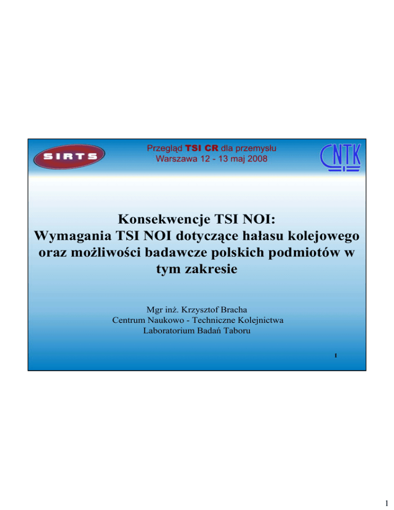 Konsekwencje TSI NOI: Wymagania TSI NOI dotyczące hałasu kolejowego oraz możliwości badawcze polskich podmiotów w tym zakresie Mgr inż. Krzysztof Bracha Centrum Naukowo - Techniczne Kolejnictwa Laboratorium Badań Taboru 1 1 TSI NOI - dyrektywa 2006/66/WE • Wprowadzona decyzją Komisji Europejskiej z dnia 23.12.2005 r. • notyfikowana jako dokument C(2005) 5666 • obowiązuje po upływie 6 miesięcy od daty notyfikacji • dotyczy podsystemu „tabor kolejowy” wymienionego w pkt. 1 zał II do dyrektywy 2001/16/WE o interoperacyjności transeuropejskiego systemu kolei konwencjonalnych 2 2 Cele TSI NOI: • Ustalenie dopuszczalnych wartości emisji hałasu od taboru kolejowego • Określenie warunków akustycznej homologacji pojazdów kolejowych, tj. warunków wykonania pomiarów 3 3 Przedmiotem TSI są: • • • • wagony towarowe lokomotywy zespoły trakcyjne (EMU, DMU) wagony osobowe kolei konwencjonalnej, przeznaczone do użytku zarówno międzynarodowego jak i krajowego 4 4 Zakres wymagań TSI: • Wagony towarowe - w odniesieniu do: Îhałasu przejazdu Îhałasu stacjonarnego Dotyczy wagonów nowych i po modernizacji • Lokomotywy, zespoły trakcyjne ,wagony osobowe w odniesieniu do: Îhałasu stacjonarnego Îhałasu podczas rozruchu Îhałasu przejazdu Îhałasu w kabinie maszynisty Dotyczy nowego taboru 5 5 Wartości dopuszczalne hałasu: 1. Hałas przejazdu - wagony towarowe Wagony nowe APL do 0,15 m-1 <= 82 dB(A) Wagony zmodernizowane APL do 0,15 m-1 <= 84 dB(A) Wagony nowe APL od 0,15 m-1 do 0,275 m-1 <= 83 dB(A) Wagony zmodernizowane APL od 0,15 m-1 do 0,275 m-1 <= 85 dB(A) Wagony nowe APL powyżej 0,275 m-1 <= 85 dB(A) Wagony zmodernizowane APL powyżej 0,275 m-1 <= 87 dB(A) Wszystkie wartości dla v = 80 km/h APL - iloraz liczby osi przez długość wagonu między zderzakami 6 6 Wartości dopuszczalne hałasu: 2. Hałas stacjonarny - wagony towarowe Wszystkie wagony towarowe <= 65 dB(A) dotyczy wyłącznie wagonów wyposażonych w dodatkowe urządzenia takie jak silniki, generatory, układy chłodzenia (np. wagony chłodnicze) 7 7 Wartości dopuszczalne hałasu: 3. Hałas stacjonarny - lokomotywy, zespoły trakcyjne, wagony osobowe Lokomotywy elektryczne 75 dB(A) Lokomotywy spalinowe 75 dB(A) EMU 68 dB(A) DMU 73 dB(A) Wagony pasażerskie 65 dB(A) 8 8 Wartości dopuszczalne hałasu: : 4. Hałas podczas rozruchu - lokomotywy, zespoły trakcyjne, wagony osobowe Lokomotywy elektryczne ( P < 4 500 kW na obwodzie kół ) 82 dB(A) Lokomotywy elektryczne ( P >= 4 500 kW na obwodzie kół ) 85 dB(A) Lokomotywy spalinowe ( P < 2 000 kW na wale ) 86 dB(A) Lokomotywy spalinowe ( P >= 2 000 kW na wale ) 89 dB(A) EMU DMU DMU 82 dB(A) ( P < 500 kW/silnik ) ( P >= 500 kW/silnik ) 83 dB(A) 85 dB(A) 9 9 Wartości dopuszczalne hałasu: 5. Hałas przejazdu - lokomotywy, zespoły trakcyjne, wagony osobowe Lokomotywy elektryczne 85 dB(A) Lokomotywy spalinowe 85 dB(A) EMU 81 dB(A) DMU 82 dB(A) Wagony pasażerskie 80 dB(A) 10 10 Wartości dopuszczalne hałasu: 6. Hałas w kabinie maszynisty Na postoju 95 dB(A) (w warunkach działania sygnałów dźwiękowych) Przy jeździe z prędkością maksymalną 78 dB(A) 11 11 Okres przejściowy: z z wagony towarowe - brak okresu przejściowego wagony pasażerskie, lokomotywy, zespoły trakcyjne - w określonych przypadkach + 2 dB(A) przez 2 lata od daty wejścia w życie standardów z spalinowe zespoły trakcyjne (DMU) o mocy > 500 kW/silnik + 2 dB(A) przez 5 lat - hałas podczas rozruchu z hałas w kabinie + 2 dB(A) przez 3 lata (tylko dla warunków stacjonarnych przy działaniu syren) 12 12 Przypadki szczególne: Kategoria „P” - stałe z wartości dopuszczalne hałasu stacjonarnego (tylko DMU) - UK i Irlandia wartości dopuszczalne hałasu podczas rozruchu (lokomotywy i DMU zależnie od mocy) - UK i Irlandia z Kategoria „T” - tymczasowe z wartości dopuszczalne hałasu stacjonarnego (wagony wyposażone w agregaty o mocy > 100 kW) - Finlandia z wartości dopuszczalne hałasu przejazdu (wszystkie wagony towarowe) Finlandia, Norwegia, Litwa, Łotwa, Estonia z koleje wąskotorowe - Grecja 13 13 Warunki pomiaru: Hałas przejazdu (dla wszystkich rodzajów taboru) z Sposób pomiarów zgodnie z pr EN ISO 3095:2001 z pewnymi odchyleniami z Zdefiniowane: odległość usytuowania mikrofonu od osi toru (7,5 m) oraz wysokość powyżej poziomu powierzchni główki szyny (1,2 m) z Ustalone prędkości przejazdu pojazdów: maksymalna oraz prędkość odniesienia (80 km/h) z z Ustalona charakterystyka toru pomiarowego (odcinka pomiarowego) Jako wynik - wartość równoważnego poziomu dźwięku za czas przejazdu 14 14 Warunki pomiaru: Hałas podczas rozruchu (lokomotywy i zespoły trakcyjne) z Sposób pomiarów zgodnie z pr EN ISO 3095:2001 z pewnymi odchyleniami z Zdefiniowane: odległość usytuowania mikrofonu od osi toru (7,5 m) oraz wysokość powyżej poziomu powierzchni główki szyny (1,2 m) z Ustalona minimalna siła pociągowa z Ustalona charakterystyka toru pomiarowego (odcinka pomiarowego) identyczna jak dla pomiarów hałasu przejazdu z Jako wynik - wartość maksymalna poziomu dźwięku Próba rozruchu opisana w niniejszej TSI odpowiada próbie przyspieszania wg pr EN ISO 3095:2001 15 15 Warunki pomiaru: Hałas stacjonarny (dla wszystkich rodzajów taboru) z Sposób pomiarów zgodnie z pr EN ISO 3095:2001 z pewnymi odchyleniami z Zdefiniowane: odległość usytuowania mikrofonu od osi toru (7,5 m) oraz wysokość powyżej poziomu powierzchni główki szyny (1,2 m) Czas pomiaru 60 s dla każdego punktu pomiarowego z z Jako wynik - średnia energetyczna ze wszystkich punktów pomiarowych Hałas w kabinie maszynisty z Pomiar na postoju w warunkach oddziaływania syren z Przejazd z maksymalną prędkością w otwartym terenie 16 16 Wymagania TSI NOI a polskie jednostki badawcze Rozporządzenie Ministra Infrastruktury z dn. 30.04.2004 r. podaje wykaz jednostek badawczych upoważnionych do prowadzenia badań koniecznych do uzyskania świade