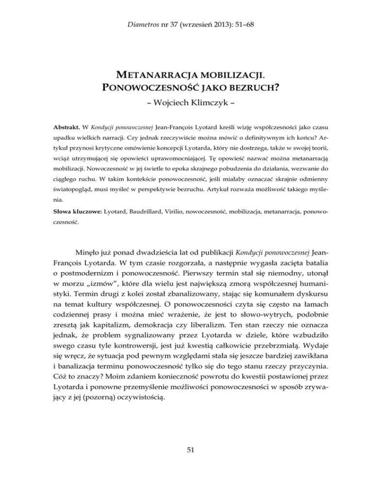 Diametros nr 37 (wrzesień 2013): 51–68 METANARRACJA MOBILIZACJI. PONOWOCZESNOŚĆ JAKO BEZRUCH? – Wojciech Klimczyk – Abstrakt. W Kondycji ponowoczesnej Jean-François Lyotard kreśli wizję współczesności jako czasu upadku wielkich narracji. Czy jednak rzeczywiście można mówić o definitywnym ich końcu? Artykuł przynosi krytyczne omówienie koncepcji Lyotarda, który nie dostrzega, także w swojej teorii, wciąż utrzymującej się opowieści uprawomocniającej. Tę opowieść nazwać można metanarracją mobilizacji. Nowoczesność w jej świetle to epoka skrajnego pobudzenia do działania, wezwanie do ciągłego ruchu. W takim kontekście ponowoczesność, jeśli miałaby oznaczać skrajnie odmienny światopogląd, musi myśleć w perspektywie bezruchu. Artykuł rozważa możliwość takiego myślenia. Słowa kluczowe: Lyotard, Baudrillard, Virilio, nowoczesność, mobilizacja, metanarracja, ponowoczesność. Minęło już ponad dwadzieścia lat od publikacji Kondycji ponowoczesnej JeanFrançois Lyotarda. W tym czasie rozgorzała, a następnie wygasła zacięta batalia o postmodernizm i ponowoczesność. Pierwszy termin stał się niemodny, utonął w morzu „izmów”, które dla wielu jest największą zmorą współczesnej humanistyki. Termin drugi z kolei został zbanalizowany, stając się komunałem dyskursu na temat kultury współczesnej. O ponowoczesności czyta się często na łamach codziennej prasy i można mieć wrażenie, że jest to słowo-wytrych, podobnie zresztą jak kapitalizm, demokracja czy liberalizm. Ten stan rzeczy nie oznacza jednak, że problem sygnalizowany przez Lyotarda w dziele, które wzbudziło swego czasu tyle kontrowersji, jest już kwestią całkowicie przebrzmiałą. Wydaje się wręcz, że sytuacja pod pewnym względami stała się jeszcze bardziej zawikłana i banalizacja terminu ponowoczesność tylko się do tego stanu rzeczy przyczynia. Cóż to znaczy? Moim zdaniem konieczność powrotu do kwestii postawionej przez Lyotarda i ponowne przemyślenie możliwości ponowoczesności w sposób zrywający z jej (pozorną) oczywistością. 51 Wojciech Klimczyk ◦ Metanarracja mobilizacji. Ponowoczesność jako bezruch? Koniec wielkich narracji? Kondycja ponowoczesna nosi podtytuł Raport o stanie wiedzy, nie jest więc traktatem o całości kultury, ale skupia się na analizie jednego z jej segmentów, w naszym społeczeństwie kluczowego, czyli nauki. Lyotard rozważa problem podstawowy – co czyni wiedzę prawomocną? W sposób skrótowy przedstawia schematyczną ewolucję form uprawomocnienia, podkreślając kluczową rolę narracyjności na każdym etapie tej ewolucji. Lyotard stara się zachować szerokość spojrzenia i z całą pewnością nie ulega scjentyzmowi, sytuuje więc naukę w szerszym kontekście. Dowodzi, że wiedza nie sprowadza się do czystego rejestrowania faktów i ich opisywania (samo pojęcie faktu jest z gruntu wieloznaczne), ale ma w sobie też element praktyczny i moralny (stosowanie), a także estetyczny. Nauki ścisłe we współczesnym świecie, wchodząc w przestrzeń publiczną, odwołują się najczęściej nie do czysto scjentystycznej logiki, ale tworzą opowieść uprawomocniającą (wystarczy prześledzić medialne wypowiedzi naukowców o ich odkryciach), co oznacza, że także współcześnie narracja ma kluczowe znaczenie w procesie legitymizacji wiedzy naukowej. Forma narracyjna ma zdecydowaną przewagę w formułowaniu wiedzy tradycyjnej, czego świadectwa dają etnologia i antropologia społeczna. Jak pisze Lyotard, jest to: […] wiedza wybitnie wspólnotowa, podobna do tej z dziecięcych wyliczanek, wiedza, którą współcześnie próbowała odszukać czy przynajmniej przybliżyć muzyka repetycyjna. Wiedza ta ujawnia zaskakującą właściwość: w miarę jak metrum bierze górę nad akcentem w przebiegach dźwiękowych, słownych bądź bez słów, czas przestaje być wsparciem dla zapamiętywania i staje się bezpamiętnym odmierzaniem, które przy braku wyraźnych różnic między okresami, nie pozwala ich wyliczyć i spycha w zapomnienie1. Tak rozumiana wiedza to wiedza mitu i legendy, a więc wiedza nakierowana na budowanie więzi społecznej. Zbiorowość odnajduje ją nie tylko w treści opowieści, ale w samym akcie ich snucia. Ten aspekt wiedzy schodzi w nowoczesności na dalszy plan, ale nie znika bezpowrotnie. Lyoatrd posuwa się nawet do stwierdzenia, że być może narracja jest uniwersalną potrzebą człowieka. W niniejszych rozważaniach tak daleko iść nie musimy. Wystarczy stwierdzenie, że nowoczesność nie zrywa całkowicie z narracyjnością wiedzy, ale przekształca charakter narracji. 1 Lyotard [1997] s. 75. 52 Wojciech Klimczyk ◦ Metanarracja mobilizacji. Ponowoczesność jako bezruch? Naukowiec bada wartość wypowiedzi narracyjnych i stwierdza, że nigdy nie są podporządkowane argumentacji i dowodowi. Klasyfikuje je jako należące do innej mentalności: nieoswojonej, prymitywnej, nierozwiniętej, zapóźnionej, wyobcowanej, powstałej na gruncie potocznych opinii, zwyczajów, autorytetów, przesądów, ignorancji, ideologii2. Mit nie podlega regułom obserwacji i dowodzenia, więc musi zostać wykorzeniony. Nowoczesność dyskwalifikuje zatem narrację jako formę wiedzy. Ale tylko pozornie. Oświecenie rozprawiwszy się z boskim gwarantem prawdy próbuje zastąpić go rozumem. Jest to jednak rozwiązanie okupione pewną istotną stratą. Wraz z nowoczesną nauką w problematyce uprawomocnienia pojawiają się dwa nowe elementy. Po pierwsze, aby odpowiedzieć na pytanie: Jak dowieść dowodu?; czy też, ogólniej: Kto decyduje o warunkach prawdziwości?, nie szuka się już w sposób metafizyczny pierwszego dowodu albo transcendentnego autorytetu, lecz przyznaje, iż warunki prawdziwości, to znaczy reguły gry naukowej, są immanentne dla samej tej gry, że nie można ich ustalić inaczej, jak tylko w ramach debaty, która sama jest naukowa, i że nie ma