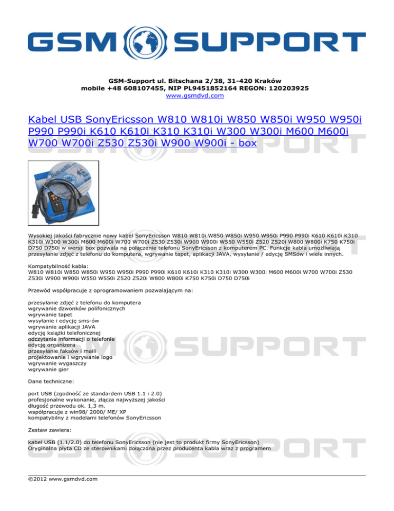 GSM-Support ul. Bitschana 2/38, 31-420 Kraków mobile +48 608107455, NIP PL9451852164 REGON: 120203925 www.gsmdvd.com Kabel USB SonyEricsson W810 W810i W850 W850i W950 W950i P990 P990i K610 K610i K310 K310i W300 W300i M600 M600i W700 W700i Z530 Z530i W900 W900i - box Wysokiej jakości fabrycznie nowy kabel SonyEricsson W810 W810i W850 W850i W950 W950i P990 P990i K610 K610i K310 K310i W300 W300i M600 M600i W700 W700i Z530 Z530i W900 W900i W550 W550i Z520 Z520i W800 W800i K750 K750i D750 D750i w wersji box pozwala na połączenie telefonu SonyEricsson z komputerem PC. Funkcje kabla umożliwiają przesyłanie zdjęć z telefonu do komputera, wgrywanie tapet, aplikacji JAVA, wysyłanie / edycję SMSów i wiele innych. Kompatybilność kabla: W810 W810i W850 W850i W950 W950i P990 P990i K610 K610i K310 K310i W300 W300i M600 M600i W700 W700i Z530 Z530i W900 W900i W550 W550i Z520 Z520i W800 W800i K750 K750i D750 D750i Przewód współpracuje z oprogramowaniem pozwalającym na: przesyłanie zdjęć z telefonu do komputera wgrywanie dzwonków polifonicznych wgrywanie tapet wysyłanie i edycję sms-ów wgrywanie aplikacji JAVA edycję książki telefonicznej odczytanie informacji o telefonie edycję organizera przesyłanie faksów i maili projektowanie i wgrywanie logo wgrywanie wygaszczy wgrywanie gier Dane techniczne: port USB (zgodność ze standardem USB 1.1 i 2.0) profesjonalne wykonanie, złącza najwyższej jakości długość przewodu ok. 1,3 m. współpracuje z win98/ 2000/ ME/ XP kompatybilny z modelami telefonów SonyEricsson Zestaw zawiera: kabel USB (1.1/2.0) do telefonu SonyEricsson (nie jest to produkt firmy SonyEricsson) Oryginalna płyta CD ze sterownikami dołączona przez producenta kabla wraz z programem ©2012 www.gsmdvd.com Opis ten nie stanowi oferty w rozumieniu Kodeksu Cywilnego. GSM-Support zastrzega sobie prawo do możliwych błędów w opisie produktu. Prosimy o weryfikację z Państwa strony, a w razie wątpliwości o kontakt. GSM-Support ul. Bitschana 2/38 31-420 Kraków POLSKA tel. 608107455 e-mail: [email protected] Powered by TCPDF (www.tcpdf.org)