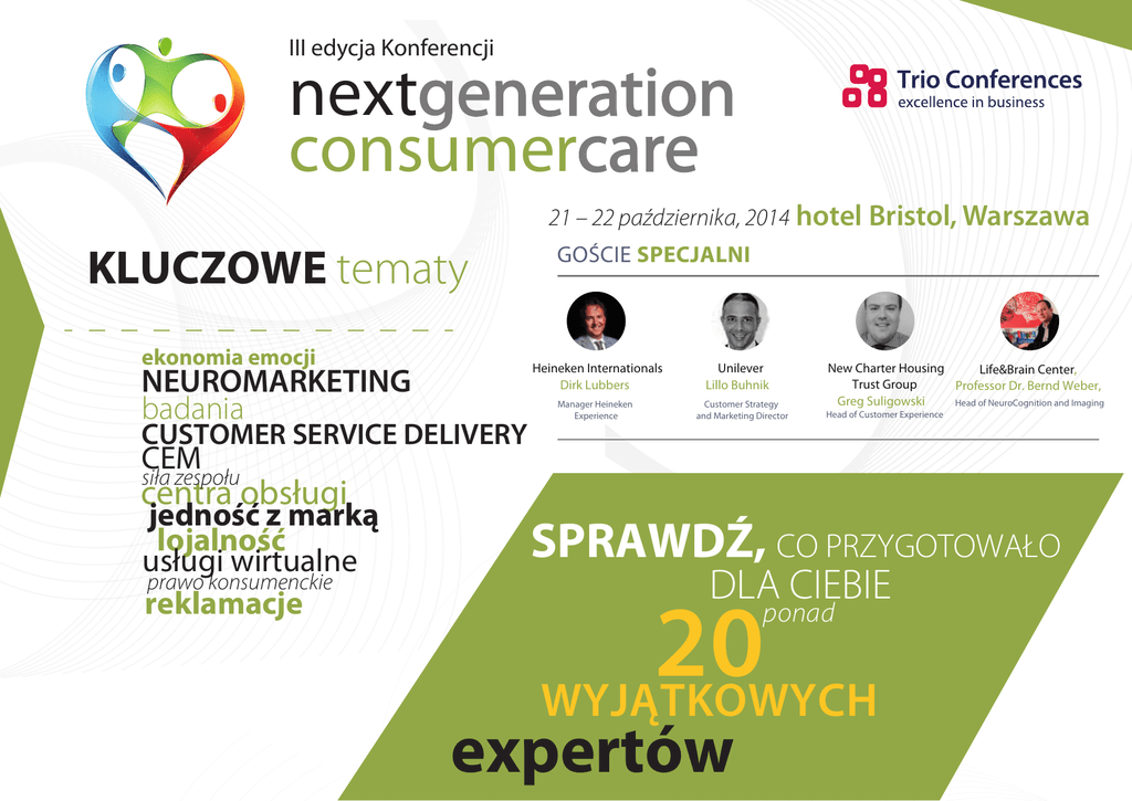 III edycja Konferencji nextgeneration consumercare 21 – 22 października, 2014 hotel Bristol, Warszawa KLUCZOWE tematy ekonomia emocji NEUROMARKETING badania Heineken Internationals Dirk Lubbers CUSTOMER SERVICE DELIVERY • CEM • siła zespołu GOŚCIE SPECJALNI Manager Heineken Experience Unilever Lillo Buhnik Customer Strategy and Marketing Director New Charter Housing Life&Brain Center, Trust Group Professor Dr. Bernd Weber, Greg Suligowski Head of NeuroCognition and Imaging Head of Customer Experience • centra obsługi • jedność z marką lojalność • usługi wirtualne prawo konsumenckie • reklamacje SPRAWDŹ, CO PRZYGOTOWAŁO DLA CIEBIE 20 WYJĄTKOWYCH ponad expertów PARTNERZY Zapraszam, Dorota Wojnar Będziesz miał poczucie doskonale wykorzystanego czasu ZAINSPIRUJEMY CIĘ OBECNOŚĆ W NOWYCH MEDIACH ZAPEWNIA I ZACHĘCIMY DO ODWAŻNYCH DZIAŁAŃ. CIEKAWE I NIECODZIENNE POMYSŁY NA MĄDRE DZANIE RELACJAMI Z KLIENTAMI. POKAŻEMY – ALE NIE NUDNE – ZARZĄ- PARTNER BĘDZIESZ MIAŁ OKAZJĘ ROZPRAWIĆ SIĘ CIĘ Z TEMATAMI, Z KTÓRYMI BORYKASZ SIĘ PRZEZ CAŁY ROK. TAK, NIE BĘDZIE W BIURZE PRZEZ DWA DNI, ALE W TYM CZASIE ZOSTANIESZ WYPOSAŻONY W WIEDZĘ I KONTAKTY, KTÓRE POMOGĄ CI LEPIEJ 363 DNI. TO DOSKONAŁA INWESTYCJA! WYKORZYSTAĆ POZOSTAŁE JESTEŚMY TWOIM Dowiesz się, jakie pomysły mają firmy spoza Polski NAJLEPSZYM WYBOREM NIE CHCEMY POWIEDZIEĆ, ŻE ZA GRANICĄ WIEDZĄ LEPIEJ. ALE PRAWDĄ JEST, ŻE ZAWSZE WARTO ZAJRZEĆ DO OGRÓDKA SĄSIADA, BY POZNAĆ INNY SPOSÓB MYŚLENIA, INNE DOŚWIADCZENIA, INNE PODEJŚCIE DO PROBLEMU. TEGO DOSTARCZĄ CI WYJĄTKOWI PRELEGENCI REPREZENTUJĄCY HEINEKENA (HOLANDIA), UNILEVER (WŁOCHY) ORAZ NEW CHARTER HOUSING TRUST GROUP I UNIWERSYTET W BONN (WIELKA BRYTANIA). Znajdziesz praktyczne rozwiązania FORMUŁA KONFERENCJI NIE WYKLUCZA TWOJEJ AKTYWNOŚCI! DAMY CI MNÓSTWO OKAZJI DO ROZMÓW, ZADAWANIA PYTAŃ I TWÓRCZEJ WYMIANY MYŚLI. Spotkasz ekspertów reprezentujących wiodące firmy i marki NIE MOŻE CIĘ ZABRAKNĄĆ W MIEJSCU, GDZIE SWOIMI DOŚWIADCZENIAMI CEM, OBSŁUGI KLIENTA, MARKETINGU, SPRZEDAŻY, ROZWOJU I KOMUNIKACJI. PRACUJĄ DLA SPÓŁEK NAJWIĘKSZYCH, ALE TEŻ TYCH MNIEJSZYCH, KTÓRE ZNALAZŁY WŁASNY KLUCZ OTWIERAJĄCY SERCA KLIENTÓW. WYMIENIAĆ SIĘ BĘDĄ WYJĄTKOWI MENEDŻEROWIE TAKICH OKAZJI SIĘ NIE PRZEPUSZCZA. Wybierzesz sesje, które najbardziej odpowiadają Twoim potrzebom OPRÓCZ UDZIAŁU W SESJACH WSPÓLNYCH DLA WSZYSTKICH UCZESTNIKÓW, BĘDZIESZ MIAŁ OKAZJĘ WYBRAĆ TAKŻE Z KILKU SESJI RÓWNOLEGŁYCH. NIEKTÓRE TEMATY ŁATWIEJ I EFEKTYWNIEJ JEST OMAWIAĆ W MNIEJSZYM GRONIE OSÓB NAJBARDZIEJ ZAINTERESOWANYCH. KONFERENCJA MA WYMAGAJĄCE GRONO SŁUCHACZY. WYDARZENIE BYŁO DLA MNIE BARDZO INTERESUJĄCE. RABEN MANAGEMENT SERVICES KLUCZOWE, ALE NIE JEDYNE, ZAGADNIENIA NASZEJ KONFERENCJI VERY PROFESSIONAL CONFERENCE. THE QUALITY OF THE SPEAKERS AND DELEGATES WAS VERY HIGH WHICH MEANT THAT THERE WERE EXCELLENT NETWORKING OPPORTUNITIES AS WELL AS SOME GOOD NEW MATERIAL SHARED WITH THIS RICH AND DIVERSE BYŁO TO DLA MNIE NIESAMOWITE GROUP OF PROFESSIONALS. DOŚWIADCZENIE. CIESZĘ SIĘ ŻE TAKA INICJATYWA ORANGE GROUP POWSTAŁA I ŻE MOGŁAM W NIEJ UCZESTNICZYĆ. Neuromarketing – skuteczna tajna broń czy koszyk pełen niewiadomych? Zamień komunikację z rynkiem na rozmowę z człowiekiem Alior Bank Ekonomia emocji – jak inwestycje w pozytywne doświadczenia klienta przekładają się na zyski firmy DZIĘKUJĘ, ŻE MOGŁAM UCZESTNICZYĆ W TAKIM WYDARZENIU. BYŁO TO DLA MNIE NIEZWYKLE PRZYDATNE. 4LIFE DIRECT Kocham transformacje – jak zaangażować pracowników w realizację strategii, sprawić, by sobie z nią radzili i ją wspierali Uczestnik wyjątkowości – daj klientowi znacznie więcej, niż tylko produkt i zaangażuj w to jego emocje Programy lojalnościowe – czy dzisiaj jest jeszcze możliwe przywiązanie do siebie klienta na dłużej? Jesteśmy tu po to, by cię uszczęśliwić – kontakt reklamacyjny to twoja szansa lub krok milowy do porażki. ZACIEKAWIONY? NIE JESTEŚMY GOŁOSŁOWNI CO MÓWIĄ O WYDARZENIU UCZESTNICY POPRZEDNICH EDYCJI? INSPIRUJĄCE SPOTKANIE. ORGANIZACJA REWELACYJNA! GRATULUJĘ PRZEDSIĘWZIĘCIA. PERSONA GLOBAL POLSKA DWA DNI PEŁNE INFORMACJI, WIEDZY I DOŚWIADCZENIA, KTÓRYM BARDZO POUCZAJĄCA I ŚWIETNIE ZORGANIZOWANA KONFERENCJA. POLSKA ORGANIZACJA FRANCZYZODAWCÓW MOGLIŚMY SIĘ WSPÓLNIE WYMIENIĆ I CHĘTNIE SIĘ DZIELILIŚMY. PLAY KONFERENCJA NAPRAWDĘ INTERESUJĄCA, KILKA WYSTĄPIEŃ SZCZERZE INSPIRUJĄCYCH I NADE WSZYSTKO SPOTKANIE ŚWIETNIE ZORGANIZOWANE. CZUŁO SIĘ RĘKĘ PROFESJONALISTY. GESSEL ATTORNEYS AT LAW ZAJRZYJ DO PROGRAMU NA KOLEJNYCH STRONACH. PIERWSZY DZIEŃ KONFERENCJI 21 PAŹDZIENIKA 8.30 9.00 REJESTRACJA, PORANNA KAWA. ROZEJRZYJ SIĘ, Z KIM SPĘDZISZ DWA NAJBLIŻSZE DNI POWITANIE UCZESTNIKÓW, ROZPOCZĘCIE KONFERENCJI TRENDY I INSPIRACJE 9.10 NEUROMARKETING – SKUTECZNA TAJNA BROŃ CZY KOSZYK PEŁEN NIEWIADOMYCH? • • • Co wiemy o sposobach podejmowania decyzji zakupowych przez naszych klientów Odczucia związane z marką a odczucia wywołane przez reklamę tej marki – kiedy emocje konsumenta popychają go do zakupów Narzędzia neuromarketingu – jak zmierzyć nieświadome reakcje emocjonalne konsumentów Professor Dr. Bernd Weber Head of NeuroCognition and Imaging, Life&Brain Center, Board of Directors, Center • for Economics and Neuroscience, University of Bonn 9.55 OCZEKIWANIA I SATYSFAKCJA KLIENTÓW W WYBRANYCH KATEGORIACH PRODUKTÓW I USŁUG – WYNIKI BADAŃ TNS POLSKA Andrzej Olękiewicz STRATEGIA CEM 11.55 POZNANIE DOŚWIADCZEŃ I POTRZEB RÓŻNYCH KLIENTÓW DROGĄ DO OPTYMALIZACJI CUSTOMER EXPERIENCE • • • • • Współczesne segmentacje marketingowe a podejście Customer Experience Mapowanie doświadczeń na drodze różnych klientów Rola emocji w kształtowaniu doświadczeń klienta Haterzy i promotorzy – jakie strategie zastosować? Zarządzanie doświadczeniami różnych klientów Marta Bryła-Gozdyra Cu