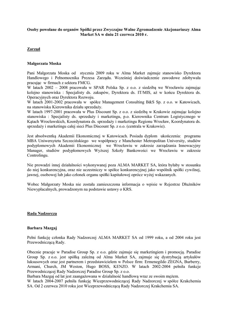 Osoby powołane do organów Spółki przez Zwyczajne Walne Zgromadzenie Akcjonariuszy Alma Market SA w dniu 21 czerwca 2010 r. Zarząd Małgorzata Moska Pani Małgorzata Moska od stycznia 2009 roku w Alma Market zajmuje stanowisko Dyrektora Handlowego i Pełnomocnika Prezesa Zarządu. Wcześniej doświadczenie zawodowe zdobywała pracując w firmach z sektora FMCG. W latach 2002 – 2008 pracowała w SPAR Polska Sp. z o.o. z siedzibą we Wrocławiu zajmując kolejno stanowiska : Specjalisty ds. zakupów, Dyrektora ds. IT/MIS, aż w końcu Dyrektora ds. Operacyjnych oraz Dyrektora Rozwoju. W latach 2001-2002 pracowała w spółce Management Consulting B&S Sp. z o.o. w Katowicach, na stanowisku Kierownika działu sprzedaży. W latach 1997-2001 pracowała w Plus Discount Sp. z o.o. z siedzibą w Krakowie zajmując kolejno stanowiska : Specjalisty ds. sprzedaży i marketingu, p.o. Kierownika Centrum Logistycznego w Kątach Wrocławskich, Koordynatora ds. sprzedaży i marketingu Regionu Wrocław, Koordynatora ds. sprzedaży i marketingu całej sieci Plus Discount Sp. z o.o. (centrala w Krakowie). Jest absolwentką Akademii Ekonomicznej w Katowicach. Posiada dyplom ukończenia: programu MBA Uniwersytetu Szczecińskiego we współpracy z Manchester Metropolitan University, studiów podyplomowych Akademii Ekonomicznej we Wrocławiu w zakresie zarządzania Innowacyjny Manager, studiów podyplomowych Wyższej Szkoły Bankowości we Wrocławiu w zakresie Controlingu. Nie prowadzi innej działalności wykonywanej poza ALMA MARKET SA, która byłaby w stosunku do niej konkurencyjna, oraz nie uczestniczy w spółce konkurencyjnej jako wspólnik spółki cywilnej, jawnej, osobowej lub jako członek organu spółki kapitałowej oprócz wyżej wskazanych. Wobec Małgorzaty Moska nie została zamieszczona informacja o wpisie w Rejestrze Dłużników Niewypłacalnych, prowadzonym na podstawie ustawy o KRS. Rada Nadzorcza Barbara Mazgaj Pełni funkcję członka Rady Nadzorczej ALMA MARKET SA od 1999 roku, a od 2004 roku jest Przewodniczącą Rady. Obecnie pracuje w Paradise Group Sp. z o.o. gdzie zajmuje się marketingiem i promocją. Paradise Group Sp. z o.o. jest spółką zależną od Alma Market SA, zajmuje się dystrybucją artykułów luksusowych oraz jest partnerem i przedstawicielem w Polsce firm: Ermenegildo ZEGNA, Burberry, Armani, Church, JM Weston, Hugo BOSS, KENZO. W latach 2002-2004 pełniła funkcje Przewodniczącej Rady Nadzorczej Paradise Group Sp. z o.o. Barbara Mazgaj od lat jest zaangażowana w działalność handlową wraz ze swoim mężem. W latach 2004-2007 pełniła funkcję Wiceprzewodniczącej Rady Nadzorczej w spółce Krakchemia SA. Od 2 czerwca 2010 roku jest Wiceprzewodniczącą Rady Nadzorczej Krakchemia SA. Posiada wykształcenie wyższe. Jest absolwentką Akademii Rolniczej w Krakowie. Nie prowadzi innej działalności wykonywanej poza ALMA MARKET SA, która byłaby w stosunku do niej konkurencyjna, oraz nie uczestniczy w spółce konkurencyjnej jako wspólnik spółki cywilnej, jawnej, osobowej lub jako członek organu spółki kapitałowej oprócz wyżej wskazanych. Wobec Barbary Mazgaj nie została zamieszczona informacja o wpisie w Rejestrze Dłużników Niewypłacalnych, prowadzonym na podstawie ustawy o KRS. Wojciech Mazgaj Od 2001 roku pełni funkcję członka Rady Nadzorczej ALMA MARKET SA, a od 2004 roku jest Wiceprzewodniczącym Rady Nadzorczej. Obecnie pracuje w spółce Argos Translations SP. z o.o. z siedzibą w Krakowie. Wcześniej był zatrudniony w spółce INGENES Sp. z o.o. z siedzibą w Krakowie. Posiada wykształcenie wyższe niepełne. Nie prowadzi innej działalności wykonywanej poza ALMA MARKET SA, która byłaby w stosunku do niej konkurencyjna, oraz nie uczestniczy w spółce konkurencyjnej jako wspólnik spółki cywilnej, jawnej, osobowej lub jako członek organu spółki kapitałowej oprócz wyżej wskazanych. Wobec Wojciecha Mazgaja nie została zamieszczona informacja o wpisie w Rejestrze Dłużników Niewypłacalnych, prowadzonym na podstawie ustawy o KRS. Gwidon Wójcik Od czerwca 2008 roku pełni funkcję członka Rady Nadzorczej w ALMA MARKET SA. Wcześniej był przewodniczącym rady nadzorczej II NFI i członkiem rady nadzorczej NFI „Hetman”. Do kwietnia 2010 w TVP. Obecnie pełni funkcje koordynatora projektów finansowanych z funduszy Unii Europejskiej. W roku 2003 był ekspertem Polskiej Konfederacji Pracodawców Prywatnych „Lewiatan”. W latach 1999-2002 pełnił funkcję prezesa Polskiej Organizacji Turystycznej. W roku 2000 pełnił funkcję podsekretarza stanu w Ministerstwie Transportu, a w latach 1997-2000 pełnił funkcję wiceprezesa w Urzędzie Kultury Fizycznej i Turystyki w Warszawie. W latach 1991-1997 był posłem na Sejm RP. Ukończył Wydział Lekarski na Akademii Medycznej w Krakowie oraz podyplomowe studium Public Relations Szkoły Głównej Handlowej w Warszawie. Posiada uprawnienia z zakresu rachunkowości. Nie prowadzi innej działalności wykonywanej poza ALMA MARKET SA, która byłaby w stosunku do niej konkurencyjna, oraz nie uczestniczy w spółce konkurencyjnej jako wspólnik spółki cywilnej, jawnej, osobowej lub jako członek organu spółki kapitałowej oprócz wyżej wskazanych. Wobec Gwidona Wójcika nie została zamieszczona informacja o wpisie w Rejestrze Dłużników Niewypłacalnych, prowadzonym na podstawie ustawy o KRS. Anna Wyroba Pani Anna Wyroba od 1995 roku pracuje w administracji publicznej. Obecnie pełni funkcję Dyrektora Urzędu Marszałkowskiego Województwa Małopolskiego. Od 2007 r. pełniła funkcję Dyrektora Departamentu Organizacyjnego w Urzędzie Marszałkowskim Województwa Małopolskiego. W latach 2000-2002 uczestniczyła w Radzie Nadzorczej Agencji Rozwoju Regionu Olkuskiego. W 20052009 r. pełniła funkcję Przewodniczącej Rady Nadzorczej Małopolskiego Biura Geodezji i Terenów Rolnych w Tarnowie. Od 2008 r. jest członkiem Rady Fundacji EkoFundusz w Warszawie. Pełni r