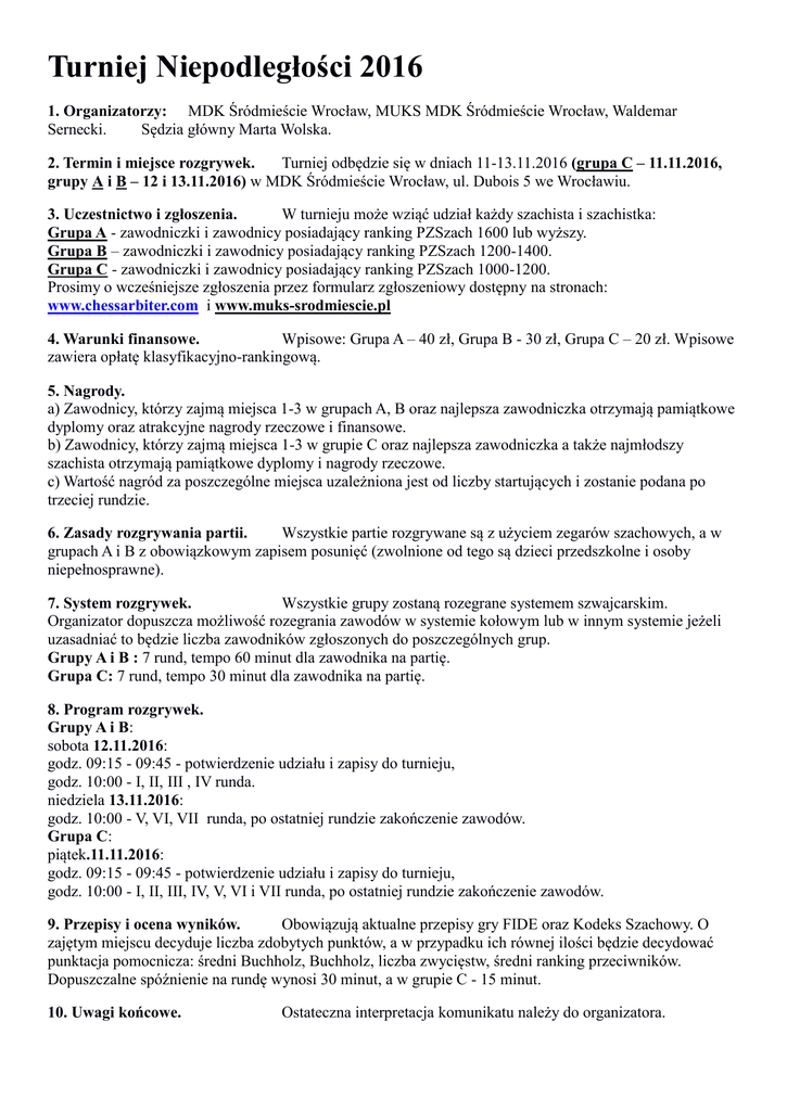 Turniej Niepodległości 2016 1. Organizatorzy: MDK Śródmieście Wrocław, MUKS MDK Śródmieście Wrocław, Waldemar Sernecki. Sędzia główny Marta Wolska. 2. Termin i miejsce rozgrywek. Turniej odbędzie się w dniach 11-13.11.2016 (grupa C – 11.11.2016, grupy A i B – 12 i 13.11.2016) w MDK Śródmieście Wrocław, ul. Dubois 5 we Wrocławiu. 3. Uczestnictwo i zgłoszenia. W turnieju może wziąć udział każdy szachista i szachistka: Grupa A - zawodniczki i zawodnicy posiadający ranking PZSzach 1600 lub wyższy. Grupa B – zawodniczki i zawodnicy posiadający ranking PZSzach 1200-1400. Grupa C - zawodniczki i zawodnicy posiadający ranking PZSzach 1000-1200. Prosimy o wcześniejsze zgłoszenia przez formularz zgłoszeniowy dostępny na stronach: www.chessarbiter.com i www.muks-srodmiescie.pl 4. Warunki finansowe. Wpisowe: Grupa A – 40 zł, Grupa B - 30 zł, Grupa C – 20 zł. Wpisowe zawiera opłatę klasyfikacyjno-rankingową. 5. Nagrody. a) Zawodnicy, którzy zajmą miejsca 1-3 w grupach A, B oraz najlepsza zawodniczka otrzymają pamiątkowe dyplomy oraz atrakcyjne nagrody rzeczowe i finansowe. b) Zawodnicy, którzy zajmą miejsca 1-3 w grupie C oraz najlepsza zawodniczka a także najmłodszy szachista otrzymają pamiątkowe dyplomy i nagrody rzeczowe. c) Wartość nagród za poszczególne miejsca uzależniona jest od liczby startujących i zostanie podana po trzeciej rundzie. 6. Zasady rozgrywania partii. Wszystkie partie rozgrywane są z użyciem zegarów szachowych, a w grupach A i B z obowiązkowym zapisem posunięć (zwolnione od tego są dzieci przedszkolne i osoby niepełnosprawne). 7. System rozgrywek. Wszystkie grupy zostaną rozegrane systemem szwajcarskim. Organizator dopuszcza możliwość rozegrania zawodów w systemie kołowym lub w innym systemie jeżeli uzasadniać to będzie liczba zawodników zgłoszonych do poszczególnych grup. Grupy A i B : 7 rund, tempo 60 minut dla zawodnika na partię. Grupa C: 7 rund, tempo 30 minut dla zawodnika na partię. 8. Program rozgrywek. Grupy A i B: sobota 12.11.2016: godz. 09:15 - 09:45 - potwierdzenie udziału i zapisy do turnieju, godz. 10:00 - I, II, III , IV runda. niedziela 13.11.2016: godz. 10:00 - V, VI, VII runda, po ostatniej rundzie zakończenie zawodów. Grupa C: piątek.11.11.2016: godz. 09:15 - 09:45 - potwierdzenie udziału i zapisy do turnieju, godz. 10:00 - I, II, III, IV, V, VI i VII runda, po ostatniej rundzie zakończenie zawodów. 9. Przepisy i ocena wyników. Obowiązują aktualne przepisy gry FIDE oraz Kodeks Szachowy. O zajętym miejscu decyduje liczba zdobytych punktów, a w przypadku ich równej ilości będzie decydować punktacja pomocnicza: średni Buchholz, Buchholz, liczba zwycięstw, średni ranking przeciwników. Dopuszczalne spóźnienie na rundę wynosi 30 minut, a w grupie C - 15 minut. 10. Uwagi końcowe. Ostateczna interpretacja komunikatu należy do organizatora.