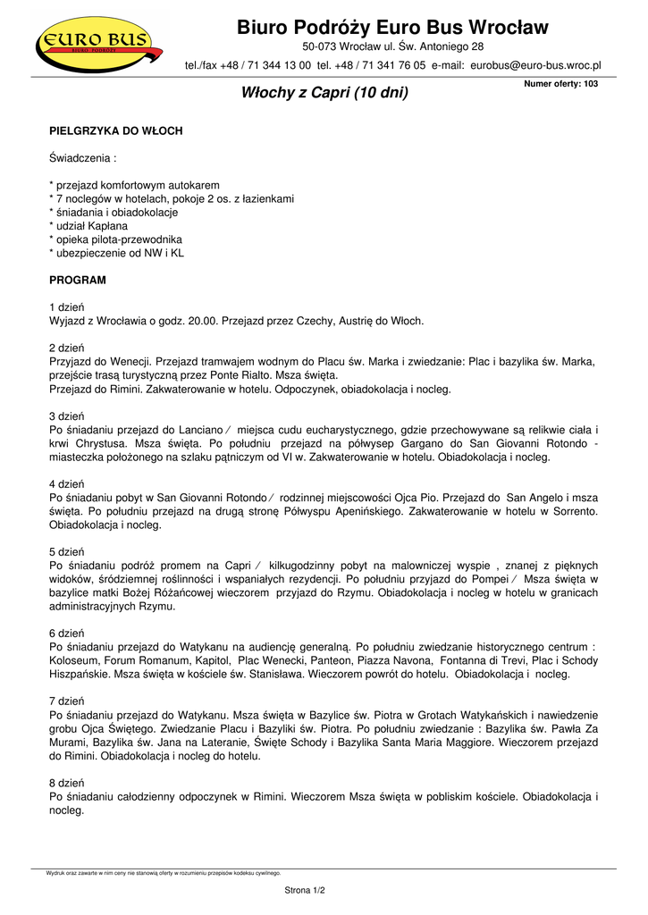Biuro Podróży Euro Bus Wrocław 50-073 Wrocław ul. Św. Antoniego 28 tel./fax +48 / 71 344 13 00 tel. +48 / 71 341 76 05 e-mail: [email protected] Włochy z Capri (10 dni) Numer oferty: 103 PIELGRZYKA DO WŁOCH Świadczenia : * przejazd komfortowym autokarem * 7 noclegów w hotelach, pokoje 2 os. z łazienkami * śniadania i obiadokolacje * udział Kapłana * opieka pilota-przewodnika * ubezpieczenie od NW i KL PROGRAM 1 dzień Wyjazd z Wrocławia o godz. 20.00. Przejazd przez Czechy, Austrię do Włoch. 2 dzień Przyjazd do Wenecji. Przejazd tramwajem wodnym do Placu św. Marka i zwiedzanie: Plac i bazylika św. Marka, przejście trasą turystyczną przez Ponte Rialto. Msza święta. Przejazd do Rimini. Zakwaterowanie w hotelu. Odpoczynek, obiadokolacja i nocleg. 3 dzień Po śniadaniu przejazd do Lanciano – miejsca cudu eucharystycznego, gdzie przechowywane są relikwie ciała i krwi Chrystusa. Msza święta. Po południu przejazd na półwysep Gargano do San Giovanni Rotondo miasteczka położonego na szlaku pątniczym od VI w. Zakwaterowanie w hotelu. Obiadokolacja i nocleg. 4 dzień Po śniadaniu pobyt w San Giovanni Rotondo – rodzinnej miejscowości Ojca Pio. Przejazd do San Angelo i msza święta. Po południu przejazd na drugą stronę Półwyspu Apenińskiego. Zakwaterowanie w hotelu w Sorrento. Obiadokolacja i nocleg. 5 dzień Po śniadaniu podróż promem na Capri – kilkugodzinny pobyt na malowniczej wyspie , znanej z pięknych widoków, śródziemnej roślinności i wspaniałych rezydencji. Po południu przyjazd do Pompei – Msza święta w bazylice matki Bożej Różańcowej wieczorem przyjazd do Rzymu. Obiadokolacja i nocleg w hotelu w granicach administracyjnych Rzymu. 6 dzień Po śniadaniu przejazd do Watykanu na audiencję generalną. Po południu zwiedzanie historycznego centrum : Koloseum, Forum Romanum, Kapitol, Plac Wenecki, Panteon, Piazza Navona, Fontanna di Trevi, Plac i Schody Hiszpańskie. Msza święta w kościele św. Stanisława. Wieczorem powrót do hotelu. Obiadokolacja i nocleg. 7 dzień Po śniadaniu przejazd do Watykanu. Msza święta w Bazylice św. Piotra w Grotach Watykańskich i nawiedzenie grobu Ojca Świętego. Zwiedzanie Placu i Bazyliki św. Piotra. Po południu zwiedzanie : Bazylika św. Pawła Za Murami, Bazylika św. Jana na Lateranie, Święte Schody i Bazylika Santa Maria Maggiore. Wieczorem przejazd do Rimini. Obiadokolacja i nocleg do hotelu. 8 dzień Po śniadaniu całodzienny odpoczynek w Rimini. Wieczorem Msza święta w pobliskim kościele. Obiadokolacja i nocleg. Wydruk oraz zawarte w nim ceny nie stanowią oferty w rozumieniu przepisów kodeksu cywilnego. Strona 1/2 Biuro Podróży Euro Bus Wrocław 50-073 Wrocław ul. Św. Antoniego 28 tel./fax +48 / 71 344 13 00 tel. +48 / 71 341 76 05 e-mail: [email protected] 9 dzień Po śniadaniu. Przejazd do Padwy. Zwiedzanie Bazyliki św. Antoniego, historyczne centrum i Piazza dell Erbe. Msza święta Po południu wyjazd do kraju. 10 dzień Powrót do Wrocławia w godzinach rannych. Cena: 1.900 zł Na wstępy, miejskich przewodników, tramwaj wodny i metro potrzeba ok.100 EURO. Wydruk oraz zawarte w nim ceny nie stanowią oferty w rozumieniu przepisów kodeksu cywilnego. Strona 2/2