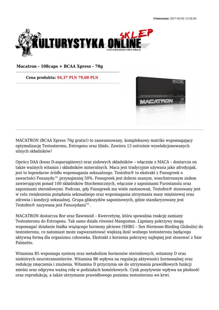 Utworzono: 2017-03-02 13:36:56 Macatron - 108caps + BCAA Xpress - 70g Cena produktu: 94,37 PLN 79,00 PLN MACATRON (BCAA Xpress 70g gratis!) to zaawansowany, kompleksowy matriks wspomagający optymalizację Testosteronu, Estrogenu oraz libido. Zawiera 13 ostrożnie wyselekcjonowanych silnych składników! Oprócz DAA (kwas D-asparaginowy) oraz ziołowych składników – włącznie z MACA – dostarcza on także ważnych witamin i składników mineralnych. Maca jest tradycyjnie używana jako afrodyzjak, jest to legendarne źródło wspomagania seksualnego. Testofen® to ekstrakt z Fanugreek o zawartości Fenusydu™ przynajmniej 50%. Fenugreek jest dobrze znanym, wsechstronnym ziołem zawierającym ponad 100 składników fitochemicznych, włącznie z saponinami Furostanolu oraz saponinami steroidowymi. Podczas, gdy Fanugreek ma wiele zastosowań, Testofen® stosowany jest w celu zwiększenia pożądania seksualnego oraz wspomagania utrzymania masy mięśniowej oraz zdrowia i kondycji seksualnej. Grupa glikozydów saponinowych, gdzie standaryzowany jest Testofen® nazywana jest Fenusydami™. MACATRON dostarcza Bor oraz flawonoid – Kwercetynę, która spowalnia reakcję zamiany Testosteronu do Estrogenu. Tak samo działa również Mangostan. Ligniany pokrzywy mogą wspomagać działanie białka wiążącego hormony płciowe (SHBG – Sex Hormone-Binding Globulin) do testosteronu, co natomiast może zagwarantować większą ilość wolnego testosteronu będącego aktywną formą dla organizmu człowieka. Ekstrakt z korzenia pokrzywy najlepiej jest stosować z Saw Palmetto. Witamina B5 wspomaga syntezę oraz metabolizm hormonów steroidowych, witaminy D oraz niektórych neurotransmiterów. Witamina B6 wpływa na regulację aktywności hormonalnej oraz redukcję zmęczenia i znużenia. Witamina D przyczynia sie do utrzymania prawidłowych funkcji mieśni oraz odgrywa ważną rolę w podziałach komórkowych. Cynk pozytywnie wpływa na płodność oraz reprodukcję, a także utrzymanie prawidłowego poziomu testosteronu we krwi. Skład: w porcji dziennej %ZDS* (4 kapsułki) Witamina B5 1.8 mg 30% Witamina B6 0.84 mg 60% Dihydrat kwercetyny 100 mg † Kompleks „MACATRON” 2400 mg † Witamina D3 5 mcg 100% Cynk 6 mg 60% Bor 3.6 mg † Dawkowanie: Spożywać 4 kapsułki dziennie (2 ze śniadaniem i 2 z kolacją). Produkt nie może być stosowany jako substytut (zamiennik) zróżnicowanej diety. Adres: http://www.ko.sklep.pl/ Telefon: kom. 782 010 880 Email: [email protected]