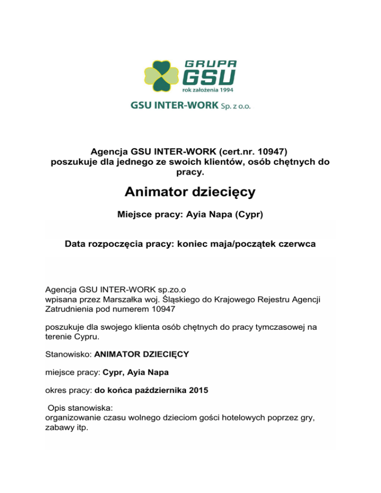 Agencja GSU INTER-WORK (cert.nr. 10947) poszukuje dla jednego ze swoich klientów, osób chętnych do pracy. Animator dziecięcy Miejsce pracy: Ayia Napa (Cypr) Data rozpoczęcia pracy: koniec maja/początek czerwca Agencja GSU INTER-WORK sp.zo.o wpisana przez Marszałka woj. Śląskiego do Krajowego Rejestru Agencji Zatrudnienia pod numerem 10947 poszukuje dla swojego klienta osób chętnych do pracy tymczasowej na terenie Cypru. Stanowisko: ANIMATOR DZIECIĘCY miejsce pracy: Cypr, Ayia Napa okres pracy: do końca października 2015 Opis stanowiska: organizowanie czasu wolnego dzieciom gości hotelowych poprzez gry, zabawy itp. Czas pracy: Praca w godzinach: 10:30-12:30; 15:00-17:00, 19:00-24:00; (6 dni w tygodniu - 1 dzień wolny) PROFIL KANDYDATA: wymagania: -bardzo dobra znajomość j. angielskiego oraz j. niemieckiego -dyspozycyjność do końca października 2015 -doświadczenie na podobnym stanowisku, kursy, szkolenia itp. -umiejętność pracy w grupie oraz łatwość nawiązywanie kontaktów - kreatywność Oferujemy: -legalną pracę u sprawdzonego pracodawcy -atrakcyjne wynagrodzenie, - nieodpłatne zakwaterowanie - nieodpłatne wyżywienie ( 3 posiłki dziennie) - zwrot za poniesione koszty przelotów (do 240 euro) - ubezpieczenie REKRUTACJA: osoby spełniające powyższe wymagania prosimy o rejestrację na: gsuinter-work.pl/formularz-rejestracyjny/6 i załącznie CV w języku polskim i angielskim lub wysłanie maila na [email protected] z dopiskiem ANIMATOR DZIECIĘCY ZASTRZEGAMY SOBIE PRAWO DO KONTAKTU Z WYBRANYMI OSOBAMI