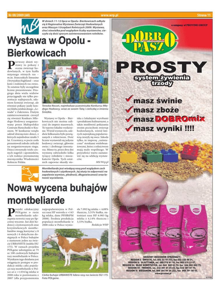 Nr 08/2009 (60) www.wrp.pl Strona 11 W dniach 11-12 lipca w Opolu- Bierkowicach odbyła się 6 Regionalna Wystawa Zwierząt Hodowlanych oraz Maszyn i Urządzeń Rolniczych 2009. Wystawa, choć niewielka pod względem liczby wystawców, cieszyła się dość sporym zainteresowaniem rolników. Wystawa w Opolu Bierkowicach P ierwszy dzień wystawy to pokazy i ocena zwierząt hodowlanych, w tym bydła mięsnego różnych ras – m.in. francuskich limusine i brytyjskiej highland – oraz koni i rodzimych ras owiec. Te ostatnie były szczególnie licznie prezentowane. Drugiego dnia wielu widzów przyciągnęły nie tylko prezentacje najlepszych, zdaniem komisji zwierząt, ale również pokazy jazdy konnej klubu jeździeckiego „Lewada” z Zakrzowa. Dużym zainteresowaniem cieszył się również Konkurs Młodego Hodowcy zorganizowany przez Małopolskie Centrum Biotechniki w Krasnem. W konkursie wzięło udział dziesięcioro dzieci, z których najmłodsze miało 5 lat. Uczestnicy, w pocie czoła prezentowali młode cieliczki na zorganizowanym ringu. Dzieci otrzymały wiele cennych nagród i upominków, a ich rodzice prenumeratę miesięcznika Wiadomości Rolnicze Polska. Tereska Nocoń, najmłodsza uczestniczka Konkursu Młodego Hodowcy, wraz ze swoim Tatą i cieliczką o imieniu Śnieżka. Wystawy w Opolu – Bierkowicach nie można zaliczyć do imprez masowych. To typowe lokalne wydarzenie. Wśród wystawców, zaledwie kilkunastu było powiązanych z rolnictwem. Dość licznie wystawiali się jedynie hodowcy zwierząt, głównie owiec i drobnego inwentarza. Mimo to, przez dwa dni wystawę odwiedziło kilka tysięcy rolników i mieszkańców Opola. Tych ostatnich zapewne skusiły sto- iska z lokalnymi wyrobami i produktami kulinarnymi, a także możliwość pokazania swoim pociechom zwierząt hodowlanych, wśród których największą popularnością cieszyły się owce. Szkoda tylko, że imprezę „zaśmiecono” stoiskami wielobranżowymi, które z rolnictwem mają mało wspólnego. W przyszłości warto zastanowić się na selekcją wystawców. MS/Wrp.pl Montbeliarde jest wiodącą rasą pod względem cech hodowlanych i użytkowych. Jej atuty to odporność na zapalenie wymion, płodność, długowieczność oraz łatwość wycielania. Nowa wycena buhajów montbeliarde P rojekt edukacyjny POLgene o rasie montbeliarde udostępnia nowości rasy po lipcowej wycenie. Już dziś hodowcy czystorasowych oraz krzyżówkowych montbeliardów mogą korzystać z 8 nowych i 6 dotychczas dostępnych w Polsce buhajów z numerem jeden na świecie URBANISTE (indeks ISU 175). W ramach projektu POLgene udostępnia aż 75 ze 100 czołowych buhajów rasy montbeliarde w Polsce. Wynikiem tego działania jest osiągnięcie postępu w produkcji mleka całej populacji rasy montbeliarde w Polsce aż o +1.034 kg mleka w 2008 roku w porównaniu z 2007 (dla przypomnienia najpopularniejsza w Polsce rasa HF wzrosła o +143 kg mleka, dane PFHBiPM 2008). Średnia produkcja populacji montbeliarde w 2008 roku w Polsce wynio- sła 7.092 kg mleka + 4,08% tłuszczu, 3,51% białka, natomiast rasa HF 6.903 kg mleka z 4,14% tłuszczu i 3,33% białka. Redakcja WRP Córka buhaja URBANISTE lidera rasy na świecie ISU 175. Foto POLgene. wr-212/08