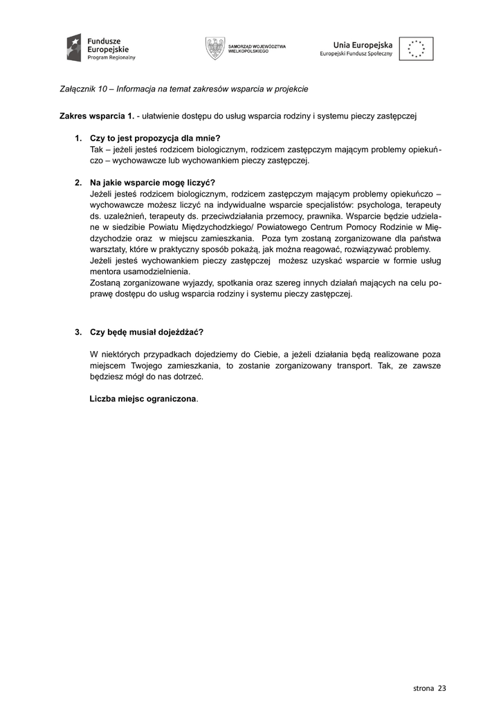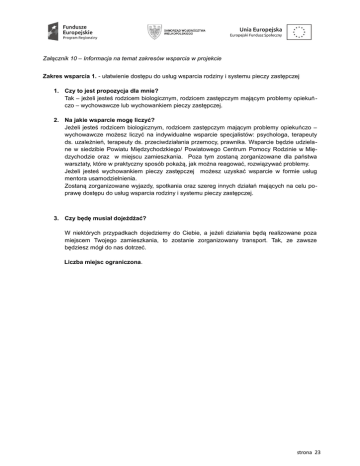 Załącznik 10 – Informacja na temat zakresów wsparcia w projekcie Zakres wsparcia 1. - ułatwienie dostępu do usług wsparcia rodziny i systemu pieczy zastępczej 1. Czy to jest propozycja dla mnie? Tak – jeżeli jesteś rodzicem biologicznym, rodzicem zastępczym mającym problemy opiekuńczo – wychowawcze lub wychowankiem pieczy zastępczej. 2. Na jakie wsparcie mogę liczyć? Jeżeli jesteś rodzicem biologicznym, rodzicem zastępczym mającym problemy opiekuńczo – wychowawcze możesz liczyć na indywidualne wsparcie specjalistów: psychologa, terapeuty ds. uzależnień, terapeuty ds. przeciwdziałania przemocy, prawnika. Wsparcie będzie udzielane w siedzibie Powiatu Międzychodzkiego/ Powiatowego Centrum Pomocy Rodzinie w Międzychodzie oraz w miejscu zamieszkania. Poza tym zostaną zorganizowane dla państwa warsztaty, które w praktyczny sposób pokażą, jak można reagować, rozwiązywać problemy. Jeżeli jesteś wychowankiem pieczy zastępczej możesz uzyskać wsparcie w formie usług mentora usamodzielnienia. Zostaną zorganizowane wyjazdy, spotkania oraz szereg innych działań mających na celu poprawę dostępu do usług wsparcia rodziny i systemu pieczy zastępczej. 3. Czy będę musiał dojeżdżać? W niektórych przypadkach dojedziemy do Ciebie, a jeżeli działania będą realizowane poza miejscem Twojego zamieszkania, to zostanie zorganizowany transport. Tak, ze zawsze będziesz mógł do nas dotrzeć. Liczba miejsc ograniczona. strona 23 Zakres wsparcia 2. - usługi asystenta rodzin będących w kryzysie Czy to jest propozycja dla mnie? Tak – jeżeli jesteś rodziną przeżywającą trudności w wypełnianiu funkcji opiekuńczo – wychowawczych. 1 Na jakie wsparcie mogę liczyć? Oferowane przez nas wsparcie asystenta rodziny jest zindywidualizowane i dostosowane do każdej osoby. Wspólnie ustalimy plan pomocy i zakres czasowy, jaki zajmie nam realizacja poszczególnych jego celów. 2 Gdzie będę musiał dojeżdżać? Nasze działania realizowane będą przede wszystkim w miejscu zamieszkania osoby przeżywającej trudności w wypełnianiu funkcji opiekuńczo – wychowawczych, jak i w siedzibie PCPR w Międzychodzie . 3 Na czym będzie polegać wsparcie asystenckie? Przez usługi asystenckie rozumie się czynności zmierzające do zmotywowania rodziny, do współpracy i działań mających na celu pokonanie problemów opiekuńczo - wychowawczych. 4 Jak będzie przebiegało wsparcie? Punktem wyjścia jest wspólne ustalenie Indywidualnego Planu Pomocy. To w nim określimy z jakich form wsparcia będziesz korzystać. Liczba miejsc ograniczona. strona 24 Zakres wsparcia 3. - usługi opiekuńcze wspomagające osoby niesamodzielne i ich opiekunów faktycznych Czy to jest propozycja dla mnie? Tak – jeżeli jesteś osobą niesamodzielną, która ze względu na wiek, stan zdrowia lub niepełnosprawność wymaga opieki lub wsparcia w związku z niemożnością samodzielnego wykonywania co najmniej jednej z podstawowych czynności dnia codziennego. Tak – jeżeli jesteś opiekunem faktycznym osoby niesamodzielnej/niepełnosprawnej. 1. Na jakie wsparcie mogę liczyć? Jeżeli jesteś osobą niesamodzielną możesz uzyskać wsparcie w formie usług trenera aktywności w miejscu zamieszkania i poza nim w zakresie: zaspokajania podstawowych potrzeb, opieki higienicznej, zaleceń lekarza, kontaktów z otoczeniem. Usługom towarzyszy budowanie sieci wsparcia społecznego. Ponadto usługi te w razie uzasadnionej potrzeby mogą być uzupełnione o wsparcie specjalistyczne, rehabilitacyjne i psychologiczne. Jeżeli jesteś opiekunem faktycznym osoby niesamodzielnej możesz zostać przeszkolony w zakresie metod przemieszczania chorych oraz prawidłowej pielęgnacji . Oferowane przez nas wsparcie asystenta osoby z niepełnosprawnością zwanego Trenerem Aktywności jest zindywidualizowane i dostosowane do każdej osoby z niepełnosprawnością/niesamodzielnej. Wspólnie ustalimy plan działania i zakres czasowy, jaki zajmie nam realizacja poszczególnych jego celów. Jako opiekun faktyczny osoby z niepełnosprawnością możesz skorzystać z szkoleń typu kurs podstawowej pierwszej pomocy przedmedycznej, kurs masażu, pakiet szkoleń: moduł 1. – Trener interpersonalny, moduł 2. – Następstwa funkcjonalne niepełnosprawności oraz savoirvivre w kontaktach z osobami z niepełnosprawnością, moduł 3. – Prawne i instytucjonalne wsparcie osób z niepełnosprawnością, moduł 4. – Wdrożenie do zagadnień Modelu Trenera Aktywności oraz etycznych aspektów pracy z osobą niesamodzielną, zapoznanie z narzędziami pracy asystentów osób z niepełnosprawnością. 2. Gdzie będę musiał dojeżdżać? Usługi opiekuńcze świadczone są w miejscu zamieszkania osoby objętej pomocą oraz poza nim. Również szkolenia dla opiekunów faktycznych będą przeprowadzane w miejscu wskazanym przez partnera projektu. Na początkowym etapie to Trener Aktywności będzie dojeżdżał do osoby z niepełnosprawnością. Szkolenia dla opiekunów faktycznych głównie odbywać się będą w Środowiskowym Domu Samopomocy w Międzychodzie. 3. Na czym będzie polegało wsparcie asystenckie Trenera Aktywności Przez usługi asystenckie rozumie się świadczenie osobistej pomocy przez Trenera Aktywności w wykonywaniu czynności, których nie jest ona w stanie wykonywać samodzielnie. Jego zadaniem jest także pomoc osobom z niepełnosprawnością w wykonaniu podjętych już przez nich działań oraz inspirowanie i zachęcanie do aktywności, doradzanie, wsparcie psychologiczne i emocjonalne. Asystent ma być towarzyszem w nawiązywaniu nowych relacji społecznych, motywacją do aktywnego korzystania z ról życia osobistego, społecznego i zawodowego. Zadaniem Trenera aktywności nie jest podejmowanie decyzji za osobę z niepełnosprawnością, a jedynie pomoc, bądź wspomaganie jej w realizacji osobistych zamiarów. Praca Trenera strona 25 polega na wykonaniu ściśle określo