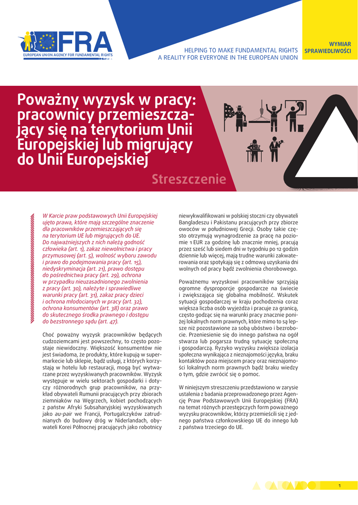 HELPING TO MAKE FUNDAMENTAL RIGHTS A REALITY FOR EVERYONE IN THE EUROPEAN UNION WYMIAR SPRAWIEDLIWOŚCI Poważny wyzysk w pracy: pracownicy przemieszczający się na terytorium Unii Europejskiej lub migrujący do Unii Europejskiej Streszczenie W Karcie praw podstawowych Unii Europejskiej ujęto prawa, które mają szczególne znaczenie dla pracowników przemieszczających się na terytorium UE lub migrujących do UE. Do najważniejszych z nich należą godność człowieka (art. 1), zakaz niewolnictwa i pracy przymusowej (art. 5), wolność wyboru zawodu i prawo do podejmowania pracy (art. 15), niedyskryminacja (art. 21), prawo dostępu do pośrednictwa pracy (art. 29), ochrona w przypadku nieuzasadnionego zwolnienia z pracy (art. 30), należyte i sprawiedliwe warunki pracy (art. 31), zakaz pracy dzieci i ochrona młodocianych w pracy (art. 32), ochrona konsumentów (art. 38) oraz prawo do skutecznego środka prawnego i dostępu do bezstronnego sądu (art. 47). Choć poważny wyzysk pracowników będących cudzoziemcami jest powszechny, to często pozo staje niewidoczny. Większość konsumentów nie jest świadoma, że produkty, które kupują w super markecie lub sklepie, bądź usługi, z których korzy stają w hotelu lub restauracji, mogą być wytwa rzane przez wyzyskiwanych pracowników. Wyzysk występuje w wielu sektorach gospodarki i doty czy różnorodnych grup pracowników, na przy kład obywateli Rumunii pracujących przy zbiorach ziemniaków na Węgrzech, kobiet pochodzących z państw Afryki Subsaharyjskiej wyzyskiwanych jako au‑pair we Francji, Portugalczyków zatrud nianych do budowy dróg w Niderlandach, oby wateli Korei Północnej pracujących jako robotnicy niewykwalifikowani w polskiej stoczni czy obywateli Bangladeszu i Pakistanu pracujących przy zbiorze owoców w południowej Grecji. Osoby takie czę sto otrzymują wynagrodzenie za pracę na pozio mie 1 EUR za godzinę lub znacznie mniej, pracują przez sześć lub siedem dni w tygodniu po 12 godzin dziennie lub więcej, mają trudne warunki zakwate rowania oraz spotykają się z odmową uzyskania dni wolnych od pracy bądź zwolnienia chorobowego. Poważnemu wyzyskowi pracowników sprzyjają ogromne dysproporcje gospodarcze na świecie i zwiększająca się globalna mobilność. Wskutek sytuacji gospodarczej w kraju pochodzenia coraz większa liczba osób wyjeżdża i pracuje za granicą, często godząc się na warunki pracy znacznie poni żej lokalnych norm prawnych, które mimo to są lep sze niż pozostawione za sobą ubóstwo i bezrobo cie. Przeniesienie się do innego państwa na ogół stwarza lub pogarsza trudną sytuację społeczną i gospodarczą. Ryzyko wyzysku zwiększa izolacja społeczna wynikająca z nieznajomości języka, braku kontaktów poza miejscem pracy oraz nieznajomo ści lokalnych norm prawnych bądź braku wiedzy o tym, gdzie zwrócić się o pomoc. W niniejszym streszczeniu przedstawiono w zarysie ustalenia z badania przeprowadzonego przez Agen cję Praw Podstawowych Unii Europejskiej (FRA) na temat różnych przestępczych form poważnego wyzysku pracowników, którzy przemieścili się z jed nego państwa członkowskiego UE do innego lub z państwa trzeciego do UE. 1 Poważny wyzysk w pracy: pracownicy przemieszczający się na terytorium Unii Europejskiej lub migrujący do Unii Europejskiej Poważny wyzysk pracowników w kontekście przepisów prawa Poważny wyzysk pracowników dotyczy zarówno obywateli UE, jak i obywateli państw trzecich. Prawo do należytych i sprawiedliwych warunków pracy wynikające z art. 31 Karty praw podstawowych Unii Europejskiej przysługuje zarówno obywatelom UE, jak i obywatelom państw trzecich, niezależnie od tego, czy pracownik posiada uregulowany czy nie uregulowany status pobytu. „Poważny wyzysk pracowników” odnosi się do wszelkich form wyzysku w pracy, które mają charakter przestępczy w świetle ustawodawstwa państwa członkowskiego UE, w którym wyzysk ma miejsce. W opisywanym badaniu skoncentrowano się na wyzysku w pracy oraz związanych z nim zagrożeniach. Nie dokonano analizy procesu przemieszczania się lub przesiedlania pracowników z krajów pochodzenia do miejsc, w których są wyzyskiwani. Poważny wyzysk pracowników nie zawsze jest konsekwencją handlu ludźmi, który polega na podej mowaniu pewnych działań przy użyciu nielegalnych środków w celu wyzysku. Niekoniecznie też ofiary takiego wyzysku są zmuszane do pracy; są ofia rami takiego wyzysku, ponieważ wykonują pracę w warunkach, które są znacznie poniżej poziomu uznanego w prawie za dopuszczalny. STUDIUM PRZYPADKU WYBRANE PRZEZ FRA Dostęp do wymiaru sprawiedliwości Para z Bułgarii zbierała owoce i warzywa w gospodarstwie rolnym we Francji. Zostali oddelegowani do pracy i legalnie zatrudnieni przez bułgarskiego pracodawcę na podstawie umowy o pracę sporządzonej w ich ojczystym języku oraz posiadali prawo legalnego pobytu i legalnej pracy we Francji. Mimo to żyli i pra cowali w warunkach skrajnego wyzysku oraz otrzymali wynagrodzenie jedynie za sześć ty godni, pomimo że pracowali przez 15–16 go dzin na dobę przez pięć miesięcy (oprócz tego z pensji potrącono im cenę ich powrotnych bi letów lotniczych). Zgłosili sprawę do Krajowej Komisji ds. Zwalczania Handlu Ludźmi, która zwróciła się do miejscowego oddziału Central nego Biura ds. Zwalczania Przestępczości Zor ganizowanej w celu zbadania i zapobieżenia w przyszłości wyzyskowi pracowników przez bułgarskiego pracodawcę. 2 Wyzyskiem pracowników są zarówno poważne nadużycia, takie jak niewolnictwo, jak i czyny, które nie wypełniają znamion przestępstw i poważnego wyzysku w pracy. „Poważny wyzysk pracowników” obejmuje również sytuacje, o których mowa w art. 9 ust. 1 dyrektywy w sprawie kar wobec pracodaw ców (2009/52/WE), mianowicie zatrudnianie pra cownika o nieuregulowanym statusie „w warunkach szczególnego wyzysku”. Zgodnie z art. 2 powyższ