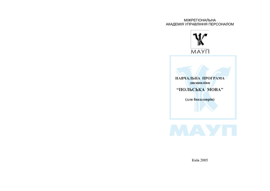 МІЖРЕГІОНАЛЬНА АКАДЕМІЯ УПРАВЛІННЯ ПЕРСОНАЛОМ НАВЧАЛЬНА ПРОГРАМА дисципліни “ПОЛЬСЬКА МОВА” (для бакалаврів) Київ 2005 Підготовлено викладачем Л. А. Медведенко Затверджено на засіданні кафедри слов’янських мов (протокол № 8 від 28.03.05) Схвалено Вченою радою Міжрегіональної Академії управління персоналом Медведенко Л. А. Навчальна програма дисципліни “Польська мова” (для бакалаврів). — К.: МАУП, 2005. — 26 с. Навчальна програма містить пояснювальну записку, навчально-тематичний план, програмний матеріал до вивчення дисципліни “Польська мова”, вказівки до виконання самостійної роботи студентів, форми поточного та підсумкового контролю, вимоги до заліків та іспитів, питання для самоконтролю, контрольні завдання, а також список рекомендованої літератури. © Міжрегіональна Академія управління персоналом (МАУП), 2005 2 ПОЯСНЮВАЛЬНА ЗАПИСКА Мета вивчення дисципліни “Польська мова” як курсу практики усного та писемного мовлення — практичне засвоєння студентами польської мови та нормативної бази її функціонування в комунікативномовленнєвих ситуаціях у різних сферах професійної діяльності та побуту, формування у студентів лінгвокраїнознавчої компетенції. Практична та фахова мета курсу — опанування студентами вмінь і навичок всіх видів вільної мовленнєвої діяльності в межах програмної тематики. В основу курсу покладено принципи системності, комунікативної спрямованості навчання, порівняння мовних систем рідної й іноземної мов. Завдання вивчення дисципліни полягають у формуванні у студентів умінь і навичок аудіювання, усного та писемного монологічного та діалогічного мовлення відповідно до тематичного та граматичного мінімумів запропонованого курсу. Засвоєння структури мови відбувається в типових комунікативних контекстах і основних видах мовленнєвої діяльності (слуханні, говорінні, читанні, письмі). Слухання дає змогу сформувати навички та вміння сприймати монологічне й діалогічне мовлення викладача, студентів і носія мови (в аудіозапису), а також активізувати навички сприйняття на слух лексичного матеріалу, текстів у поданні викладача й аудіозапису за тематикою курсу. Говоріння сприяє формуванню та розвитку навичок розмовного мовлення в монологічній і діалогічній формі за темами згідно з програмою курсу. Студенти повинні оволодіти лексичним матеріалом і використовувати його в розмові, враховуючи фонетичні та граматичні особливості польської мови. Компетенція усного мовлення на початковому рівні включає підготовлене монологічне мовлення у формі опису та діалогічне мовлення у формі бесіди. Навички та вміння читання формуються на базі вправ і текстів. Разом із навичками розуміння прочитаного формуються та розвиваються навички і вміння правильно вимовляти звуки як ізольовано, так і в мовленнєвому потоці. Читаючи вголос, студенти мають дотримуватися правил вимови, темпу та мелодики звучання, близьких до вимови й темпу носіїв мови. Під час самостійного читання студенти мають швидко сприймати й засвоювати інформацію, уміти виокремлювати основну думку, розбивати текст на змістові частини, складати план. 3 Письмо сприяє формуванню навичок правопису окремих лексичних одиниць, граматично оформлених речень і самостійних висловлювань відповідно до запропонованої мовної ситуації. Навчати студентів усіх вид