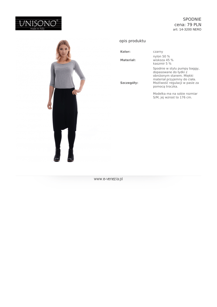 SPODNIE cena: 79 PLN art: 14-3200 NERO opis produktu Kolor: czarny Materiał: nylon 50 % wiskoza 45 % kaszmir 5 % Szczegóły: Spodnie w stylu pumpy baggy, dopasowane do łydki z obniżonym stanem. Miękki materiał przyjemny do ciała. Możliwość regulacji w pasie za pomocą troczka. Modelka ma na sobie rozmiar S/M, jej wzrost to 176 cm.