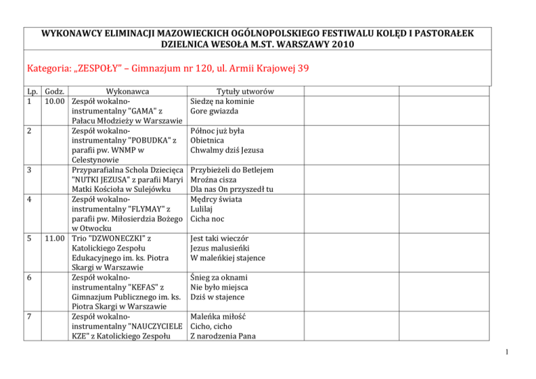 WYKONAWCY ELIMINACJI MAZOWIECKICH OGÓLNOPOLSKIEGO FESTIWALU KOLĘD I PASTORAŁEK DZIELNICA WESOŁA M.ST. WARSZAWY 2010 Kategoria: „ZESPOŁY” – Gimnazjum nr 120, ul. Armii Krajowej 39 Lp. Godz. Wykonawca 1 10.00 Zespół wokalnoinstrumentalny "GAMA" z Pałacu Młodzieży w Warszawie 2 Zespół wokalnoinstrumentalny "POBUDKA" z parafii pw. WNMP w Celestynowie 3 Przyparafialna Schola Dziecięca "NUTKI JEZUSA" z parafii Maryi Matki Kościoła w Sulejówku 4 Zespół wokalnoinstrumentalny "FLYMAY" z parafii pw. Miłosierdzia Bożego w Otwocku 5 11.00 Trio "DZWONECZKI" z Katolickiego Zespołu Edukacyjnego im. ks. Piotra Skargi w Warszawie 6 Zespół wokalnoinstrumentalny "KEFAS" z Gimnazjum Publicznego im. ks. Piotra Skargi w Warszawie 7 Zespół wokalnoinstrumentalny "NAUCZYCIELE KZE" z Katolickiego Zespołu Tytuły utworów Siedzę na kominie Gore gwiazda Północ już była Obietnica Chwalmy dziś Jezusa Przybieżeli do Betlejem Mroźna cisza Dla nas On przyszedł tu Mędrcy świata Lulilaj Cicha noc Jest taki wieczór Jezus malusieńki W maleńkiej stajence Śnieg za oknami Nie było miejsca Dziś w stajence Maleńka miłość Cicho, cicho Z narodzenia Pana 1 Edukacyjnego im. ks. Piotra Skargi w Warszawie 8 Zespół "SERAFINKI" z Katolickiej Szkoły Podstawowej im. ks. Piotra Skargi w Warszawie 9 12.00 Zespół wokalnoinstrumentalny w składzie: Karolina, Julian i Marcin z Warszawy 10 Rodzinny Zespół Muzyczny "AKORD-G" z Domu Kultury w Kałuszynie 11 Zespół wokalnoinstrumentalny "PIASTOWIANKA" z Gimnazjum nr 1 im. Z. Gęsickiego "Juno" w Piastowie 12. Zespół kameralny "ARDENTIS" z Wieliszewa 13 14 15 16 Chwała Bogu na wysokości Gloria Lulajże Jezuniu The Pretenders "2000 Miles" Mizerna cicha O gwiazdo betlejemska Nie było miejsca dla Ciebie Do szopy hej pasterze Wśród nocnej ciszy Jest taki dzień Przybieżeli do Betlejem Gdy się Chrystus rodzi Zaśnij Dzieciątko Psalite/Singt und klingt 13.00 Kwartet wokalny z Gminnego Cicha noc Ośrodka Kulury w Radzanowie Maleńki Jezu Zespół "CANTO" z Zespołu Świąteczna noc Szkół Samorządowych w Gdy się Chrystus rodzi Rościszewie Pastorałka Zespół "NUTKI" z Zespołu Dzisiaj w Betlejem Szkół Samorządowych w W grudniowe noce Rościszewie Bosy pastuszek Zespół wokalny Wyższej Szkoły O gloriosa Domina Administracji Publicznej im. Videntes stellam Stanisława Staszica w Bracia patrzcie jeno 2 17 Białymstoku 14.00 Zespół wokalny "WYDŹWIĘK" z Pałacu Młodzieży w Warszawie Idzie kolęda Oh Nappy Day 14.15-14.45 przerwa Kategoria: „CHÓRY” – Gimnazjum nr 120, ul. Armii Krajowej 39 1. 2. 3 4 5 6 14.45 Chór "CANZONE" z Pałacu Młodzieży w Warszawie Chór dziecięcy "STRUMYCZEK" ze Szkoły Podstawowej z Oddziałami Integracyjnymi nr 342 w Warszawie Chór "MAESTRO" ze Szkoły Muzycznej I st Chór Miasta Siedlce Sekcji Dziecięcej i Młodzieżowej 15.45 Chór Publicznego Gimnazjum w Kadzidle Chór mieszany "CANTUS CORDIS" z parafii pw. św. Szymona i św. Heleny w Mińsku na Białorusi Pokłon Jezusowi White Christmas Kolęda góralska Cóż to za dziecię Dzisiaj w Betlejem Przybieżeli do Betlejem Narodził się nam Zbawiciel Ding dong Merryli on High Dzieciątko się narodziło Dzisiaj w Betlejem Joy to the World A cóż z tą Dzieciną Gdy się Chrystus rodzi Wigilia Zaśpiewajmy kolędę Jezusowi Kolęda Białoruska Adeste fideles Mizerna cicha 3 7 8 9 10 11 12 Chór "LIRA" z parafii pw. Wśród nocnej ciszy Wincentego a'Paulo w Otwocku Silent Night Z Narodzenia Pana Chór Miejski "CANTUS CORDIS" Z narodzenia Pana z Miejskiego Ośrodka Kultury Wśród nocnej ciszy w Wołominie Judzka Kraina 16.45 Chór parafialny "ACCENTUS" z Angels We Have Heard on High parafii św. Huberta w Zalesiu A cóż z tą dzieciną Górnym Paśli pasterze woły Chór Integracji Tam dnieje Międzypokoleniowej z O Józefie Gminnego Ośrodka Kultury w Dnia jednego o północy Siennie Chór Akademicki Politechniki Hola, hola, pasterze z pola Warszawskiej Jam jest dudka Niemowlątko na słomie Chór "GOD'SPELL" z Warszawy Dzisiaj w Betlejem Angels We Have Heard on High Przybieżeli do Betlejem 17.45 obrady jury 18.30 ogłoszenie wyników oraz wręczenie nagród 19.00 koncert Krystyny Giżowskiej 4 Kategoria: „SOLIŚCI/DUETY” – Ośrodek Kultury w Dzielnicy Wesoła m.st. Warszawy, ul. Starzyńskiego 21 Lp. Godz. Wykonawca 1 8.00 Duet Dominik Olszewski i Czesław Wiechowski z Domu Kultury Praga Północ w Warszawie 2 Duet Dominik Olszewski i Józef Kaszczyszyn z Domu Kultury Praga Północ w Warszawie 3 Solista Marian Kirpluk z Domu Kultury Praga Północ w Warszawie 4 Solistka Katarzyna Kwiatkowska z Domu Kultury Praga Północ w Warszawie 5 8.30 Solistka Roma Kwiatkowska z Domu Kultury Praga Północ w Warszawie 6 Solistka Adrianna Rozbicka z Warszawy - Wesołej 7 Solista Mateusz Kurdej z Celestynowa 8 Solista Michał Gosławski z Konstancina-Jeziornej 9 9.00 Solista Karol Jasiński z Warszawy 10 Solistka Agnieszka Świstak z ODT "Pogodna" w WarszawieWesołej Repertuar Pójdźmy wszyscy do stajenki Kolęda powstańcza Oj maluśki Wigilia w stepie Wesołą nowinę Cztery lata zawszem pasał Silent night Wykrzyknijmy Wiwat Gdy śliczna panna Mizerna cicha O gwiazdo Betlejemska Jezus malusieńki W żłobie leży Kolęda dla Piotra Lulejże Mi Lulej Cicha noc Kolęda dla nieobecnych Mizerna cicha Małe Betlejem W żłobie leży 5 11 12 13 14 15 16 17 18 19 20 21 22 Solistka Anastazja Karolewska z Warszawy Solistka Łucja Świstak z ODT "Pogodna" w WarszawieWesołej 9.30 Solistka Klaudia Milczarczyk z Warszawy-Wesołej Solistka Klaudia Sobotka z Warszawy Solista Krzyś Wąsik z Domu Kultury Praga Północ w Warszawie Solista Staś Wąsik z Domu Kultury Praga Północ w Warszawie 10.00 Solistka Angela Rańda z Domu Kultury Praga Północ w Warszawie Solistka Dominika Kazimierska z Domu Kultury Praga Północ w Warszawie Solistka Julia Gąsiorkiewicz z Domu Kultury Praga Północ w Warszawie Solistka Monika Kisiel z Domu Kultury Praga 