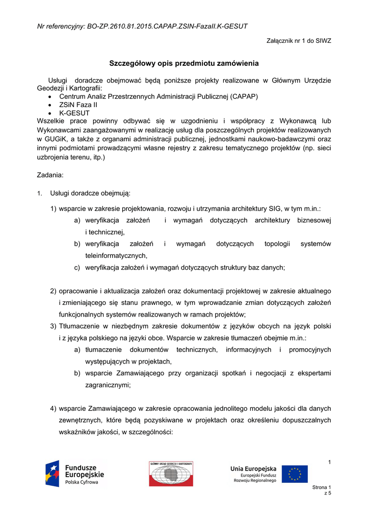 Nr referencyjny: BO-ZP.2610.81.2015.CAPAP.ZSIN-FazaII.K-GESUT Załącznik nr 1 do SIWZ Szczegółowy opis przedmiotu zamówienia Usługi doradcze obejmować będą poniższe projekty realizowane w Głównym Urzędzie Geodezji i Kartografii: Centrum Analiz Przestrzennych Administracji Publicznej (CAPAP) ZSiN Faza II K-GESUT Wszelkie prace powinny odbywać się w uzgodnieniu i współpracy z Wykonawcą lub Wykonawcami zaangażowanymi w realizację usług dla poszczególnych projektów realizowanych w GUGiK, a także z organami administracji publicznej, jednostkami naukowo-badawczymi oraz innymi podmiotami prowadzącymi własne rejestry z zakresu tematycznego projektów (np. sieci uzbrojenia terenu, itp.) Zadania: 1. Usługi doradcze obejmują: 1) wsparcie w zakresie projektowania, rozwoju i utrzymania architektury SIG, w tym m.in.: a) weryfikacja założeń i wymagań dotyczących architektury biznesowej topologii systemów i technicznej, b) weryfikacja założeń i wymagań dotyczących teleinformatycznych, c) weryfikacja założeń i wymagań dotyczących struktury baz danych; 2) opracowanie i aktualizacja założeń oraz dokumentacji projektowej w zakresie aktualnego i zmieniającego się stanu prawnego, w tym wprowadzanie zmian dotyczących założeń funkcjonalnych systemów realizowanych w ramach projektów; 3) Ttłumaczenie w niezbędnym zakresie dokumentów z języków obcych na język polski i z języka polskiego na języki obce. Wsparcie w zakresie tłumaczeń obejmie m.in.: a) tłumaczenie dokumentów technicznych, informacyjnych i promocyjnych występujących w projektach, b) wsparcie Zamawiającego przy organizacji spotkań i negocjacji z ekspertami zagranicznymi; 4) wsparcie Zamawiającego w zakresie opracowania jednolitego modelu jakości dla danych zewnętrznych, które będą pozyskiwane w projektach oraz określeniu dopuszczalnych wskaźników jakości, w szczególności: 1 Strona 1 z5 Nr referencyjny: BO-ZP.2610.81.2015.CAPAP.ZSIN-FazaII.K-GESUT a) wybór elementów zbiorów danych i cech tych elementów, dla których należy szacować jakość, b) określenie procedur próbkowania zbiorów danych, c) przygotowanie zestawów procedur kontrolnych, d) określenie miar jakości, e) określenie dopuszczalnych wskaźników jakości, f) przygotowanie metodyki raportowania jakości zbiorów danych, g) przygotowanie ekspertyz i analiz dotyczących wytworzenia, weryfikacji oraz wtórnego wykorzystania produktów projektów, w szczególności danych przestrzennych; 5) wsparcie w zakresie organizacji przedsięwzięć, w szczególności wsparcie w: a) opracowaniu dokumentacji przedsięwzięć w tym m.in.: planu realizacji Dokumentacji Inicjującej Projekt (DIP) oraz innych, zgodnie z metodyką stosowaną przez Wykonawcę, b) ciągłej współpracy z osobami odpowiedzialnymi za realizację projektów, c) opracowaniu i aktualizacji harmonogramu projektów oraz prowadzenie go w narzędziu informatycznym, d) nadzorze nad przygotowaniem materiałów dotyczących promocji projektów oraz przebiegiem akcji promocyjnej, e) nadzorze nad przygotowaniem materiałów dot. szkoleń z zakresu projektów, w tym m.in. opracowanie planu szkoleń, redagowaniu materiałów szkoleniowych, pracach związanych z odbiorami, f) identyfikacji ryzyk projektowych wraz z raportowaniem o zauważonych nieprawidłowościach, które mogłyby by wpływać na realizację projektów lub powodować nieprawidłowy odbiór lub wdrożenie produktów projektów, g) monitoringu realizacji zakresu rzeczowego i finansowego wraz z analizą i kontrolą dokumentów niezbędnych do prawidłowego rozliczania projektów, h) prowadzeniu rozliczeń w projektach zgodnie z wymaganiami Instytucji Zarządzających i Pośredniczących, w również w przygotowaniu wniosków o płatność, i) pracach związanych z zamknięciem projektów, w tym z przygotowaniem raportu końcowego z realizacji projektów; 2 Strona 2 z5 Nr referencyjny: BO-ZP.2610.81.2015.CAPAP.ZSIN-FazaII.K-GESUT 6) wsparcie w zakresie przeprowadzenia postępowań przetargowych, w tym m.in. dotyczących budowy i modyfikacji systemów oraz pozyskania, weryfikacji i konwersji danych przestrzennych i opisowych oraz narzędzi do kontroli jakości, które obejmie m.in.: a) zapewnienie wsparciea w przygotowaniu dokumentów, wymaganych i określonych odpowiednimi trybami postępowania, w szczególności elementów Specyfikacji Istotnych Warunków Zamówienia dotyczących wymagań dla planowanych do realizacji produktów, specyfikacji wymagań technicznych oraz kryteriów odbioru produktów, b) wsparcie w realizacji procedur przetargowych i zawieraniu umów z wykonawcami; 7) wsparcie w zakresie nadzoru nad realizacją i wdrożeniem produktów projektów w tym m.in. dotyczących modyfikacji istniejących systemów informatycznych, narzędzi do dot. metadanych, systemów zarządzania danymi oraz narzędzi do kontroli jakości - tj. m.in.: a) wsparcie w bezpośredniej współpracy z wykonawcami zgodnie z zasadami wynikającymi z planu realizacji przedsięwzięcia, b) przygotowania specyfikacji technicznych dla planowanych do realizacji produktów, c) uczestnictwo w spotkaniach analitycznych, d) ocena oraz sformułowanie wniosków i rekomendacji w odniesieniu do produktów projektów pod kątem ich zgodności z obecnym stanem wiedzy, prawem polskim i UE oraz normami jakościowymi, ich jakości i funkcjonalności, kompleksowości i spójności rozwiązania, e) udział w testach i odbiorach produktów zrealizowanych przez wykonawców zgodnie z zasadami określonymi w planie realizacji przedsięwzięcia, f) monitorowanie i kontrola postępu realizacji projektów wraz z raportowaniem ustalonym zgodnie z planem realizacji przedsięwzięcia (dotyczy: produktów, czasu i budżetu, ryzyk itp.), g) wsparcie przy wdrażaniu produktów, h) wsparcie w komunikacji, budowaniu relacji i współpracy m.in. w zakresie zbierania wymagań dotyczących produktów projektów i wykorzystania produktów proj