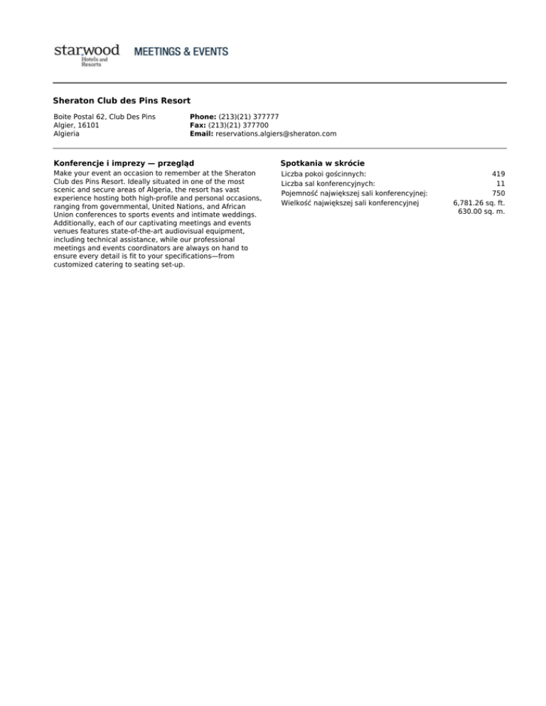 Sheraton Club des Pins Resort Boite Postal 62, Club Des Pins Algier, 16101 Algieria Phone: (213)(21) 377777 Fax: (213)(21) 377700 Email: [email protected] Konferencje i imprezy — przegląd Spotkania w skrócie Make your event an occasion to remember at the Sheraton Club des Pins Resort. Ideally situated in one of the most scenic and secure areas of Algeria, the resort has vast experience hosting both high-profile and personal occasions, ranging from governmental, United Nations, and African Union conferences to sports events and intimate weddings. Additionally, each of our captivating meetings and events venues features state-of-the-art audiovisual equipment, including technical assistance, while our professional meetings and events coordinators are always on hand to ensure every detail is fit to your specifications—from customized catering to seating set-up. Liczba pokoi gościnnych: Liczba sal konferencyjnych: Pojemność największej sali konferencyjnej: Wielkość największej sali konferencyjnej 419 11 750 6,781.26 sq. ft. 630.00 sq. m. Sheraton Club des Pins Resort Boite Postal 62, Club Des Pins Algier, 16101 Algieria Phone: (213)(21) 377777 Fax: (213)(21) 377700 Email: [email protected] Specyfikacja szczegółowa Nieruchomości Typ obiektu Resort Liczba sal konferencyjnych 11 Rok budowy 1999 Całkowita wielkość sal konferencyjnych 3,771.00 sq. m. 40,590.71 sq. ft. Liczba budynków 1 Wielkość największej sali konferencyjnej 630.00 sq. m. 6,781.26 sq. ft. Liczba pięter 8 Pojemność największej sali konferencyjnej 750 Pojemność najmniejszej sali konferencyjnej 20.00 sq. m. Dedykowany hall wystawowy 215.28 sq. ft. Pojemność najmniejszej sali konferencyjnej 10 1 Pokoje gościnne Data zameldowania 3:00 PM Internet w pokoju Bezprzewodowy szybki dostęp do Internetu Bezprzewodowy szybki dostęp do Internetu Bezprzewodowy szybki dostęp do Internetu Bezprzewodowy szybki dostęp do Internetu Data wymeldowania 12:00 PM Liczba pokoi gościnnych 419 Udogodnienia Basen Yes Nazwa basenu Indoor Lap Pool Children's Pool Outdoor Pool Lokalne & atrakcje Strefa czasowa C Pobliskie lotniska Houari Boumediene Airport Kod lotniska ALG Odległość od lotniska 30.58 Kilometers 19.00 Miles Conveniently situated on the western tip of Algiers, the capital of Algeria, the Sheraton Club des Pins Resort is just 12 kilometers from one of the country’s most historic buildings: The Casbah. A walled citadel located on the ruins of old Icosium, it invites you to discover a rare combination of past and present, Turkish and Arab, while contemplating the rich interiors that form an atrium around the central square court. Obszar lokalny For a second, equally engaging glimpse into history, venture out to the town of Tipaza, 60 kilometers from the resort. Nestled at the foot of Mount Chenoua, the meeting of mountain and sea forms an archaeological park home to ancient ruins and Roman monuments. Explore closer to home in downtown Algiers, just 24 kilometers away. Here, iconic buildings—Ketchaoua Mosques, the Roman Catholic cathedral of Notre Dame d'Afrique, and more—reside alongside rare museums, ranging from the Bardo Museum and Museum of Fine Arts to the Popular Arts Museum. Afterwards, share a scenic stroll in the Dessai Botanical Gardens and Arcades Forest. No matter your interest, Algiers presents memories in the making. Transport & parkowanie Dowóz na lotnisko i z lotniska Advance Search: There is an Airport Shuttle service on-site from the hotel to the nearest airport. Consider only courtesy shuttle services. Environmental Practices Energy & Water Conservation: • High-efficiency lighting in guest rooms • High-efficiency lighting in public areas • Water conserving fixtures • Smart irrigation practices • Regular preventive maintenance • Make A Green Choice program rewards guests for choosing to conserve natural resources in their guest room Waste Minimization & Environmentally Responsible Purchasing: • Recycling • Elimination of styrofoam packaging Raising Awareness: • Property-level Green Council Opłaty & podatki Waluta lokalna Euro Algeria Dinars Kod waluty EUR DZD Lista opłat i podatków : $0.00 : $0.00 : $0.00 : $0.00 : $0.00 Metody płatności • AMEX / OPTIMA • MASTER CARD • VISA Sheraton Club des Pins Resort Boite Postal 62, Club Des Pins Algier, 16101 Algieria Phone: (213)(21) 377777 Fax: (213)(21) 377700 Email: [email protected] Capacity Charts Room Name Key Dim. (l x w) Area Height Banq. Thtr. Auditorium - 30.00 m. x 21.00 m.98.43 ft. x 68.90 ft. 630.00 sq. m. 6,781.26 sq. ft. 6.40 m. 21.00 ft. - 700 Casino - 25.00 m. x 14.00 m.82.02 ft. x 45.93 ft. 350.00 sq. m. 3,767.37 sq. ft. 4.00 m. 13.12 ft. 150 200 Chapiteau - 45.00 m. x 20.00 m.147.64 ft. x 65.62 ft. 900.00 sq. m. 9,687.52 sq. ft. 5.00 m. 16.40 ft. 500 700 Jupiter - 30.00 m. x 21.00 m.98.43 ft. x 68.90 ft. 643.00 sq. m. 6,921.19 sq. ft. 3.80 m. 12.47 ft. 300 400 Kheima - 30.00 m. x 20.00 m.98.43 ft. x 65.62 ft. 600.00 sq. m. 6,458.35 sq. ft. 5.00 m. 16.40 ft. 300 450 Mars Meeting Room 2 - 6.50 m. x 4.00 m.21.33 ft. x 13.12 ft. 25.00 sq. m. 269.10 sq. ft. 3.80 m. 12.47 ft. 10 20 Mars Room 1 - 6.50 m. x 4.00 m.21.33 ft. x 13.12 ft. 25.00 sq. m. 269.10 sq. ft. 6.50 m. 21.33 ft. 10 20 Neptune - 20.00 m. x 13.50 m.65.62 ft. x 44.29 ft. 270.00 sq. m. 2,906.26 sq. ft. 3.80 m. 12.47 ft. 100 150 Tour Sud 3 VIP - 22.50 m. x 4.00 m.73.82 ft. x 13.12 ft. 90.00 sq. m. 968.75 sq. ft. 3.80 m. 12.47 ft. - 40 Uranus - 9.50 m. x 9.50 m.31.17 ft. x 31.17 ft. 91.00 sq. m. 979.52 sq. ft. 3.80 m. 12.47 ft. 30 40 Venus A - 15.00 m. x 9.10 m.49.21 ft. x 29.86 ft. 137.00 sq. m. 1,474.66 sq. ft. 3.80 m. 12.47 ft. 80 120 Room Name Conf. Rec. Class U-Shp. H. Sq. Dinner Dance Venus A 700 - - - - - Venus A 200 250 100 40 50 120 Venus A 700 800 500 - 500 550 Venus A 300 400 200 80 80 270 Venus A 450 400 150 80 100 250 Venus A 20 15 10 15 18 10 Venus A 20 15 10 15 18 10 Venus A 150 150 80 40 45 80 Venus A 40 - 20 30 34 - Venus A 40 4