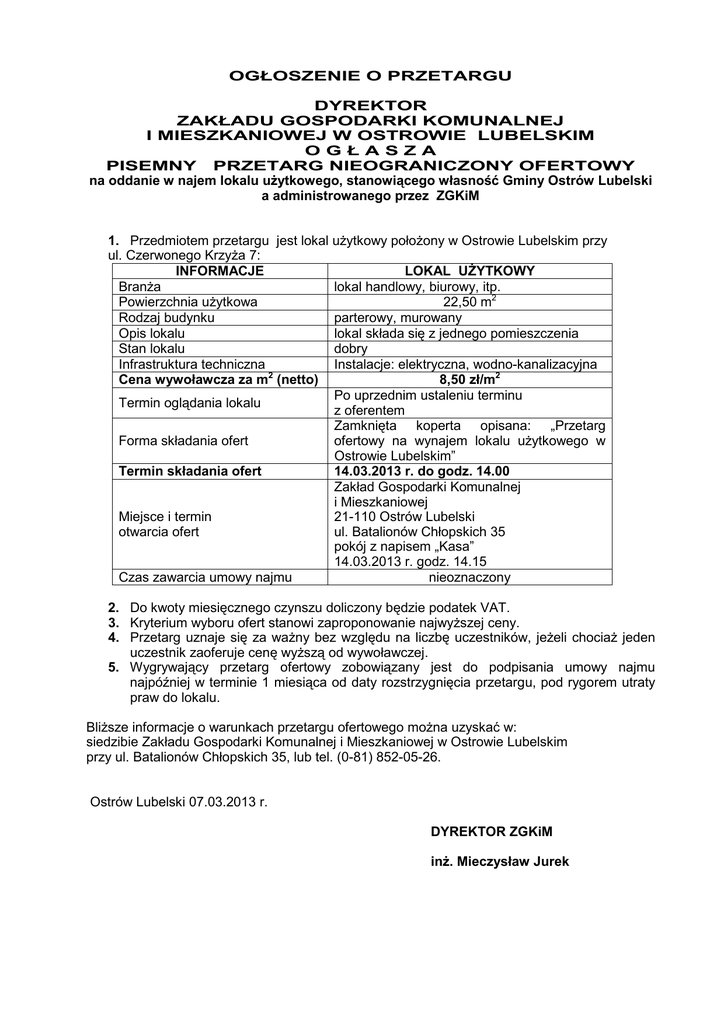 OGŁOSZENIE O PRZETARGU DYREKTOR ZAKŁADU GOSPODARKI KOMUNALNEJ I MIESZKANIOWEJ W OSTROWIE LUBELSKIM O G Ł A S Z A PISEMNY PRZETARG NIEOGRANICZONY OFERTOWY na oddanie w najem lokalu użytkowego, stanowiącego własność Gminy Ostrów Lubelski a administrowanego przez ZGKiM 1. Przedmiotem przetargu jest lokal użytkowy położony w Ostrowie Lubelskim przy ul. Czerwonego Krzyża 7: INFORMACJE LOKAL UŻYTKOWY Branża lokal handlowy, biurowy, itp. Powierzchnia użytkowa 22,50 m2 Rodzaj budynku parterowy, murowany Opis lokalu lokal składa się z jednego pomieszczenia Stan lokalu dobry Infrastruktura techniczna Instalacje: elektryczna, wodno-kanalizacyjna 2 Cena wywoławcza za m (netto) 8,50 zł/m2 Po uprzednim ustaleniu terminu Termin oglądania lokalu z oferentem Zamknięta koperta opisana: „Przetarg Forma składania ofert ofertowy na wynajem lokalu użytkowego w Ostrowie Lubelskim” Termin składania ofert 14.03.2013 r. do godz. 14.00 Zakład Gospodarki Komunalnej i Mieszkaniowej Miejsce i termin 21-110 Ostrów Lubelski otwarcia ofert ul. Batalionów Chłopskich 35 pokój z napisem „Kasa” 14.03.2013 r. godz. 14.15 Czas zawarcia umowy najmu nieoznaczony 2. Do kwoty miesięcznego czynszu doliczony będzie podatek VAT. 3. Kryterium wyboru ofert stanowi zaproponowanie najwyższej ceny. 4. Przetarg uznaje się za ważny bez względu na liczbę uczestników, jeżeli chociaż jeden uczestnik zaoferuje cenę wyższą od wywoławczej. 5. Wygrywający przetarg ofertowy zobowiązany jest do podpisania umowy najmu najpóźniej w terminie 1 miesiąca od daty rozstrzygnięcia przetargu, pod rygorem utraty praw do lokalu. Bliższe informacje o warunkach przetargu ofertowego można uzyskać w: siedzibie Zakładu Gospodarki Komunalnej i Mieszkaniowej w Ostrowie Lubelskim przy ul. Batalionów Chłopskich 35, lub tel. (0-81) 852-05-26. Ostrów Lubelski 07.03.2013 r. DYREKTOR ZGKiM inż. Mieczysław Jurek