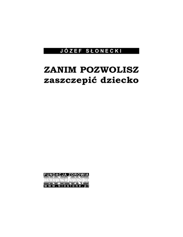 JÓZEF SŁONECKI ZANIM POZWOLISZ zaszczepić dziecko Wszelkie prawa zastrzeżone © 2012 Józef Słonecki Wydanie I Wydano w październiku 2012 Publikacja nieodpłatna finansowana przez Fundację Biosłone Nakład: 5.000 egzemplarzy Okładka, łamanie, układ graficzny, przygotowanie do druku Józef Słonecki Korekta Kasia Karczmarczyk, Aneta Filipek, Michał Trociński ISBN: 978-83-935981-0-6 Wydawnictwo BIOSŁONE ul. Kościuszki 6 47-100 Strzelce Opolskie telefon: 77 461 89 64 [email protected] www.bioslone.pl Drukarnia PHU SONYA ul. 11- go Listopada 93/97 95-070 Aleksandrów Łódzki Rodzaje i kryteria rozpoznawania niepożądanych odczynów poszczepiennych na potrzeby nadzoru epidemiologicznego* zgodnie z załącznikiem do Rozporządzenia Ministra Zdrowia z dnia 21 grudnia 2010 r. (poz. 1711) I. Ogólne rodzaje i kryteria niepożądanych odczynów poszczepiennych na potrzeby nadzoru epidemiologicznego 1. Jako ciężki niepożądany odczyn poszczepienny kwalifikuje się niepożądany odczyn poszczepienny, który zagraża życiu i może: wymagać hospitalizacji w celu ratowania zdrowia, prowadzić do trwałego ubytku sprawności fizycznej lub umysłowej, kończyć się śmiercią. 2. Jako poważny niepożądany odczyn poszczepienny kwalifikuje się niepożądany odczyn poszczepienny, który charakteryzuje się dużym nasileniem objawów w postaci znacznego obrzęku kończyny, silnego jej zaczerwienienia, wysokiej gorączki, ale: nie wymaga zwykle hospitalizacji w celu ratowania zdrowia, nie prowadzi do trwałego uszczerbku dla zdrowia, nie stanowi zagrożenia dla życia. 3. Jako łagodny niepożądany odczyn poszczepienny kwalifikuje się niepożądany odczyn poszczepienny, który nie ma szczególnie dużego nasilenia, a charakteryzuje się występowaniem: miejscowego obrzęku kończyny, silnego miejscowego zaczerwienienia, gorączki. * Jeśli nie podano inaczej i z wyjątkiem odczynów po szczepieniu BCG, za związane czasowo ze szczepieniem uznaje się zaburzenia stanu zdrowia, które wystąpiły w okresie 4 tygodni po podaniu szczepionki. Mogą one być wynikiem: 1. indywidualnej reakcji organizmu człowieka szczepionego na podanie szczepionki, 2. błędu wykonania szczepionki lub błędu podania szczepionki, 3. zjawisk od szczepienia niezależnych, a tylko przypadkowo pojawiających się po szczepieniu. 3 II. Szczegółowe rodzaje i kryteria niepożądanych odczynów poszczepiennych na potrzeby nadzoru epidemiologicznego 1. Odczyny miejscowe, w tym odczyny miejscowe po szczepieniu BCG: obrzęk, powiększenie węzłów chłonnych, ropień w miejscu wstrzyknięcia. 2. Niepożądane odczyny poszczepienne ze strony ośrodkowego układu nerwowego (OUN): encefalopatia, drgawki gorączkowe, drgawki niegorączkowe, porażenie wiotkie wywołane wirusem szczepionkowym, zapalenie mózgu, zapalenie opon mózgowo-rdzeniowych, zespół Guillaina-Barrégo. 3. Inne niepożądane odczyny poszczepienne: bóle stawowe, epizod hipotensyjno-hiporeaktywny, gorączka powyżej 39°C, małopłytkowość, nieutulony ciągły płacz, posocznica, w tym wstrząs septyczny, reakcja anafilaktyczna, reakcje alergiczne, uogólnione zakażenie BCG, wstrząs anafilaktyczny, zapalenie jąder, zapalenie ślinianek, porażenie splotu barkowego, inne poważne odczyny występujące do 4 tygodni po szczepieniu. 4 Rozdział 1 Różnica między profilaktyką a prewencją P rofilaktyka to postępowanie mające na celu zapobieganie zagrożeniu, zaś prewencja to postępowanie w sytuacji zagrożenia, mające na celu zapobieganie szkodom spowodowanym owym zagrożeniem. Inaczej mówiąc: postępowanie prewencyjne jest wdrażane wówczas, gdy zawiodło postępowanie profilaktyczne. Z potrzeby postępowania prewencyjnego można wyciągnąć tylko jeden wniosek: brakło postępowania profilaktycznego, bądź było ono nieskuteczne. W przeciwnym bowiem razie nie zaszłaby potrzeba postępowania prewencyjnego. 1. Wschodnia tradycja profilaktyki zdrowotnej Profilaktyka zdrowotna to zapobieganie chorobom i – co za tym idzie – potrzebie leczenia. Profilaktyka zdrowotna jest więc konkurencją dla medycyny, ale nie zawsze tak było. W czasach Hipokratesa (460 p.n.e. - 370 p.n.e.) w Chinach popularny był nurt medycyny taoistycznej, który zakładał, że natura jest doskonała, więc niczego nie należy poprawiać. Wystarczy przestrzegać jej praw, bowiem to właśnie naruszenie odwiecznych praw natury jest przyczyną utraty zdrowia. Lekarz medycyny taoistycznej to nade wszystko nauczyciel uczący ludzi jak nie chorować, interweniujący tylko w nagłych i nieprzewidzianych wypadkach. Taoiści wymieniają 6 przyczyn utraty zdrowia: 1. Nieprawidłowe odżywianie 2. Niedostateczna ilość snu i odpoczynku 3. Nieprawidłowa ilość i jakość ruchu fizycznego 4. Niewłaściwy stan emocjonalny 5. Działanie medycyny objawowej 6. Zagrożenia wynikające ze zmian środowiskowych Lekarze medycyny taoistycznej wynagradzani byli tylko wówczas, gdy ich pacjenci byli zdrowi, natomiast gdy któryś z nich zachorował – lekarz nie dość, że nie otrzymywał zapłaty, to jeszcze musiał leczyć go na własny koszt. 5 Posada lekarza chińskiej rodziny cesarskiej była kusząca ze względu na sowite wynagrodzenie, ale też jego odpowiedzialność była współmierna do tegoż wynagrodzenia. W razie choroby któregoś z członków rodziny cesarskiej opiekujący się nim lekarz nie tylko tracił wynagrodzenie, ale na dodatek był karany chłostą, natomiast w razie choroby samego cesarza mógł stracić nawet życie. W Chinach medycyna taoistyczna nie zdała egzaminu, bowiem szybko doprowadziła do przeludnienia. Obecnie chińska medycyna jest tak samo objawowa, a więc biznesowa, jak zachodnia, tyle że oparta jest na lekach pochodzenia naturalnego. 2. Zachodnia tradycja profilaktyki zdrowotnej Prekursorem zachodniej profilaktyki zdrowotnej jest Hipokrates, który był lekarzem, ale to mu nie przeszkodziło udzielić ludziom następującej rady: 