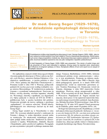 CHILD NEUROLOGY NEUROLOGIA DZIECIĘCA PRACA POGLĄDOWA/REVIEW PAPER Vol. 14/2005 Nr 28 Dr med. Georg Seger (1629–1678), pionier w dziedzinie epileptologii dziecięcej w Toruniu Dr med. Georg Seger (1629–1678), pioneerin the field of child epileptology in Toruń Marian Łysiak Komisja Historyczna Kujawsko-Pomorskiej Okręgowej Izby Lekarskiej w Toruniu Przewodniczący: dr n. med. Marian Łysiak Streszczenie Słowa kluczowe: historia padaczki w XVII w. Przedstawiono krótką notę biograficzną dotyczącą dr med. Georga Segera (1629–1688). Jako lekarz nadworny królów polskich oraz fizyk miejski w Toruniu interesował się padaczką. Wśród opisanych przez niego przypadków znalazły się: obserwacja dotycząca wpływu padaczki u ciężarnej na płód, lecznicze działanie oparzenia oraz zez jako następstwo napadów padaczkowych. Abstract Key words: history of epilepsy in 17th century A brief biography of Georg Seger (1629–1688) was presented. This doctor of polish kings and city physician of Torun was interested in epilepsy. Among cases he reported were: observation of influence of pregnant epilepsy on fetus, therapeutic effects of bum and squint as an sequel of epileptic seizures. Do najbardziej znanych źródeł dotyczących kliniki i leczenia padaczki dziecięcej w Polsce zalicza się Zielnik, czyli Herbarz, autorstwa Stefana Falimirza z Ciechanowca, opublikowany w języku polskim w roku 1534. Nieco później Jan Hieronim Chróściejowski z Poznania wydał w roku 1583 w Wenecji, podręcznik pediatrii De morbus puerorum według wykładów swego mistrza Mercurialiego. W średniowieczu padaczkę wiązano z czynnikami nadnaturalnymi. Nazywano ją Polsce: wie1ką chorobą, wie1kim napadem, chorobą św. Wa1entego, chorobą z upadkami, czy drgawkami [1]. Opisy padaczki w okresie od XVI do XVIII w. publikowane były w języku łacińskim lub polskim. Ostatecznie przyjęła się nazwa: epilepsja z greckiego „epilambanei”, co oznacza schwytać. Wśród lekarzy pub1ikujących swe obserwacje zna1azł się dr med. Georg Seger. Georg Seger urodził się w Norynberdze w roku 1629. We wczesnej młodości przybył z rodzicami do Torunia i dlatego w wieku dojrzałym uważał siebie za toruńczyka. Po ukończeniu toruńskiego gimnazjum podjął studia medyczne. Studiował na uniwersytetach w Lipsku, Wittenberdze, Altdorfie, Bazylei i Kopenhadze, gdzie przebywał najdłużej. Pociągnęła go tam asystentura i przyjaźń wybitnego anatoma duńVol. 14/2005, Nr 28 skiego Tomasza Bartholinusa (1616–1680), któremu zawdzięczał później swoje zainteresowania i sukcesy w tym przedmiocie. Promocję na doktora medycyny i filozofii uzyskał w roku 1660 w Bazylei. Jego talent pedagogiczny sprawił, że w latach 1650–1652 zaangażowany został na stanowisko guwernera synów Teodora Potockiego [2]. Ostatecznie wrócił do Torunia, obejmując w roku 1663 stanowisko fizyka miejskiego. Pierwszą sekcję przeprowadził w roku 1666, 70 lat wcześniej niż dr med. Henryk Leelhöffe1 w Warszawie. Popularność dr. Segera musiała być znaczna, skoro przez 12 lat zajmował stanowisko lekarza nadwornego trzech królów polskich: Jana Kazimierza, Michała Korybuta Wiśniowieckiego i Jana III Sobieskiego [3]. W roku 1675 opuścił Toruń przenosząc się do Gdańska, gdzie zmarł 19 grudnia 1678 r. [4]. Dr Seger był autorem przeszło 30 publikacji, a wśród nich pięciu dotyczących padaczki: Epilepsja ex incauto usu olei Iuniperini [5], De caecitate post epilepsiam in parturiente [6], De epilepsia gravidam eiusgue embryonem per XXV hebdomadas infestante [7], Epilepsja igne curata [8], De strabismo ex epilepsia [9]. A oto ostatnie trzy, dotyczące płodu i dzieci w tłumaczeniu z oryginału łacińskiego mgr Hanny Nowakowskiej. 59 Marian Łysiak Ryc. 1. Dr med. Georg Seger (1629–1678) Obserwacja CIIX O epilepsji dręczącej ciężarną i jej płód przez 25 tygodni Żona introligatora Fryderyka Waltera, naszego krajana, o sangwinicznym temperamencie, mająca około 30 lat, gdy w dniu 9 marca 1665 roku była już w czwartym miesiącu ciąży, zaczęła skarżyć się rano na ból w lewej łopatce, podejrzewała jednak, że przed kilkoma dniami nadwerężyła ją w wypadku w piwnicy. Od południa nie spodziewając się niczego niepomyślnego bardzo cierpiała z powodu konwulsji epileptycznych, które rozpoczęły dwudniową afonię, wielką słabość i inne paroksyzmy epileptyczne. Przepisywałem wtedy różne lekarstwa przeciwpadaczkowe, ale im więcej ich używała, tym liczniejsze były ataki. To także spotkało ją po zjedzeniu polewek i innego pożywienia. Potem odmawiała jedzenia przez całe osiem dni, ledwie zjadła jedną lub dwie łyżki jakiejś polewki, jednak bardzo niechętnie, ciągle nadchodził bowiem jakiś paroksyzm. One jednak chociaż niczego nie przyjmowała, były dla niej dość przykre. Dnia 16 marca wypłynął z jej narządów rodnych białawy i lepki płyn, któremu towarzyszył wstrętny zapach, ogarnął ją strach i bardzo ciężkie bóle w pachwinach, całkowite 60 opadnięcie z sił, tak że ledwie była zdolna do ruchu nadgarstkami. Poleciłem użycie kordiałów wzmacniających matkę i płód, ale na próżno. Powstało wtedy podejrzenie, że płód jest obumarły, które to podejrzenie stawało się z dnia na dzień poważniejsze, czuła także pochodzący z dolnych części brzucha smród, a także zbliżający się atak epilepsji, powiększył się ruch embrionu, czego matka nie czuła od początku choroby, oziębienie wewnętrznych części brzucha i jakąś ociężałość. I ponieważ nie było żadnych korzyści ze stosowania środków zewnętrznych, które kobiety mają zwyczaj przykładać w celu pobudzenia siły płodu, wszyscy twierdzili, że płód jest obumarły i namawiali mnie do spędzenia płodu, sama chora była temu przeciwna. Ja chociaż do części z tych objawów podszedłem niechętnie, ledwie jednak mogłem po wielu perswazjach uzyskać od c