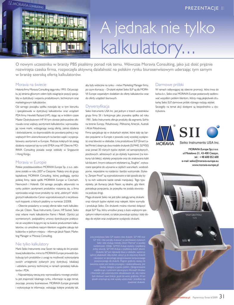 PREZENTACJE A jednak nie tylko kalkulatory... O nowym uczestniku w bran˝y PBS pisaliÊmy ponad rok temu. Wówczas Moravia Consulting, jako ju˝ doÊç pr´˝nie rozwini´ta czeska firma, rozpocz´∏a aktywnà dzia∏alnoÊç na polskim rynku biuroserwisowym uderzajàc tym samym w bran˝´ szerokà ofertà kalkulatorów. Moravia na Êwiecie Historia firmy Moravia Consulting si´ga roku 1993. Od poczàtku jej istnienia g∏ównym celem by∏o osiagni´cie pozycji specjalisty w dystrybucji i wsparciu produktowym, technicznym oraz marketingowym kalkulatorów. Od samego poczàtku spó∏ka rozwija∏a si´ w tym kierunku i specjalizowa∏a w dystrybucji kalkulatorów oraz urzàdzeƒ PDA firmy Hewlett Packard (HP), stajàc si´ w krótkim czasie Master Dystrybutorem HP. W tym okresie jednoczeÊnie oferowa∏a coraz wi´kszy asortyment kalkulatorów, wprowadzajàc nowe marki, wzbogacajàc swojà ofert´, zakres dzia∏ania i doÊwiadczenie, co doprowadzi∏o do powstania jednej z najwi´kszych firm ukierunkowanych na bardzo wàski i wyspecjalizowany asortyment w Europie. Podczas kolejnych lat zasi´g dzia∏ania rozszerzy∏ si´ na rynki EMEA oraz AP. Obecnie MORAVIA Consulting posiada swoje oddzia∏y w Singapurze i Hong Kongu. Moravia w Europie Polskie przedstawicielstwo MORAVIA Europe Sp. z o.o. za∏o˝one zosta∏o w roku 2007 w Cieszynie. Nale˝y ono do grupy kapita∏owej MORAVIA Consulting, której podlegajà, oprócz polskiej firmy, tak˝e spó∏ki MORAVIA Europe w Czechach, Niemczech i Holandii. Od samego poczàtku aktywnoÊci na rynku polskim asortyment produktów rozszerza si´, a firma wprowadza wcià˝ nowe produkty np. seri´ „zielonych” ekologicznych kalkulatorów Canon wyprodukowanych z recyklowanych kopiarek, o których pisaliÊmy w numerze 2/2008. – Obecnie posiadamy w swojej ofercie takie marki kalkulatorów jak: Citizen, Texas Instruments, Canon, HP, Socket, Seiko oraz w∏asne marki kalkulatorów Fiamo i Rebell. Oprócz ju˝ wymienionych, podpisaliÊmy umowy dystrybucyjne praktycznie ze wszystkimi liczàcymi si´ na Êwiecie producentami kalkulatorów, co umo˝liwia naszym klientom wygodne zakupy kalkulatorów w jednym miejscu – informuje Jakub Nassir, Marketing Manager w Moravia Consulting. Nie tylko kalkulatory Marki Seiko Instruments oraz Socet nie nale˝à do lini produktowej kalkulatorów, mimo to MORAVIA Europe prowadzi dystrybucj´ tych produktów z uwagi na mo˝liwoÊç wykorzystania swoich umiej´tnoÊci zyskanych przy dystrybucji, lokalizacji i udzielaniu pomocy technicznej w ramach sprzeda˝y kalkulatorów i PDA. – Najwa˝niejszà rzeczà przy wprowadzaniu nowego produktu jest znajomoÊç lokalnego rynku, informacje na jego temat, zwyczaje, procesy businessowe. MORAVIA Europe gromadzi i wykorzystuje te informacje, wdra˝ajàc kolejne produkty tak, aby by∏y widoczne na rynku – mówi Marketing Manager firmy, po czym t∏umaczy – Drukarki etykiet Seiko SLP sà dla MORAVII Europe wspania∏ym dodatkien do oferty kalkulatorów oraz do oferty urzàdzeƒ biurowych. Dywersyfikacja Seiko Instruments USA Inc. jest jednym z trzech uczestników grupy firmy SII i funkcjonuje jako prywatna spó∏ka od roku 1981. Seiko Instruments oferuje produkty dla segmentu SoHo na terenie Europy, Po∏udniowej i Pó∏nocnej Ameryki, Australii i Afryki Po∏udniowej. Firma specjalizuje si´ w drukarkach etykiet, które sta∏y si´ bardzo popularne w Europie z powodu swej wysokiej wydajnoÊci oraz ∏atwoÊci w obs∏udze. Linia produktowa SLP (Smart Label Printer) obejmuje dwa modele drukarek (SLP440, SLP450) oraz ponad 30 ró˝nych typów etykiet: od samoprzylepnych, pocztowych, adresowych a˝ po etykiety kuponowe (na konkursy lub bilety), etykiety przejrzyste oraz do znakowania kabli lub bi˝uterii. Innymi ciekawymi etykietami sà „Toughie”, wytwarzane specjalnie do u˝ywania w ci´˝kich warunkach, wodoodporne, niepodatne na rozdarcia i bardzo wytrzyma∏e. Etykiety „Tamper Proof” sà wyprodukowane w taki sposób aby by∏y na nich widoczne ka˝de oznaki manipulacji. Tego typu etykiety, jak t∏umaczy Jakub Nassir, sà idealne, gdy klient potrzebuje por´czenia, ˝e przesy∏ka nie zosta∏a otworzona podczas drogi. Magia drukarek Seiko nie jest tylko zas∏ugà samej drukarki oraz ró˝nych typów etykiet oraz nalepek, które wymyÊla i produkuje Seiko. Do drukarek mo˝na równie˝ do∏àczyç stojak SLP Tray, który umo˝liwi prac´ z du˝o wi´kszymi specjalnymi rolkami erykiet, co tak˝e powoduje szybszy i sta∏y dost´p do etykiet oraz zwi´kszenie wydajnoÊci drukarki. Darmowe próbki W ramach odbywajàcej si´ obecnie promocji, która trwa do koƒca b.r., Seiko oraz MORAVIA Europe postanowi∏y zaoferowaç wszystkim polskim klientom, którzy majà jakàkolwiek drukark´ Seiko SLP, darmowe próbki ró˝nego rodzaju etykiet. Szczegó∏y na temat akcji dost´pne sà bezpoÊrednio u dystrybutora. MORAVIA Europe Sp.z o.o. ul.Motelowa 21, 43-400 Cieszyn, tel.: +48 608 052 600 e-mail: [email protected] www.moravia-europe.pl Linia produktowa Seiko SLP zawiera dwie drukarki: SLP 440 oraz SLP 450. Obie potrafià drukowaç na jakichkolwiek etykietach Seiko i obie drukujà metodà „Direct Thermal” w wysokiej rozdzielczoÊci 300dpi. SLP450 drukuje etykiet´ z pr´dkoÊcià jednej sekundy, SLP 440 drukuje z pr´dkoÊcià dwóch sekund. Drukarka SLP jest naprawd´ ∏atwa w obs∏udze, wystarczy wybraç jakàkolwiek rolk´ etykiet, w∏o˝yç jà do w∏àczonej drukarki i skorzystaç ze specjalnego oprogramowania komputerowego przeznaczonego dla drukarki. Program graficzny s∏u˝àcy do tworzenia etykiet jest bardzo przyst´pny i nieskomplikowany. Jest równie˝ dost´pny w j´zyku polskim. Oprogramowanie wspó∏pracuje z systemami operacyjnymi Microsoft Windows i Macintosh, jest systematycznie aktualizowane tak, aby mo˝na by∏o dodawaç nowe funkcje, j´zyki lub wzory graficzne. W ten sposób utrzymuje si´ stale wysokà u˝ytecznoÊç i przed∏u˝a s