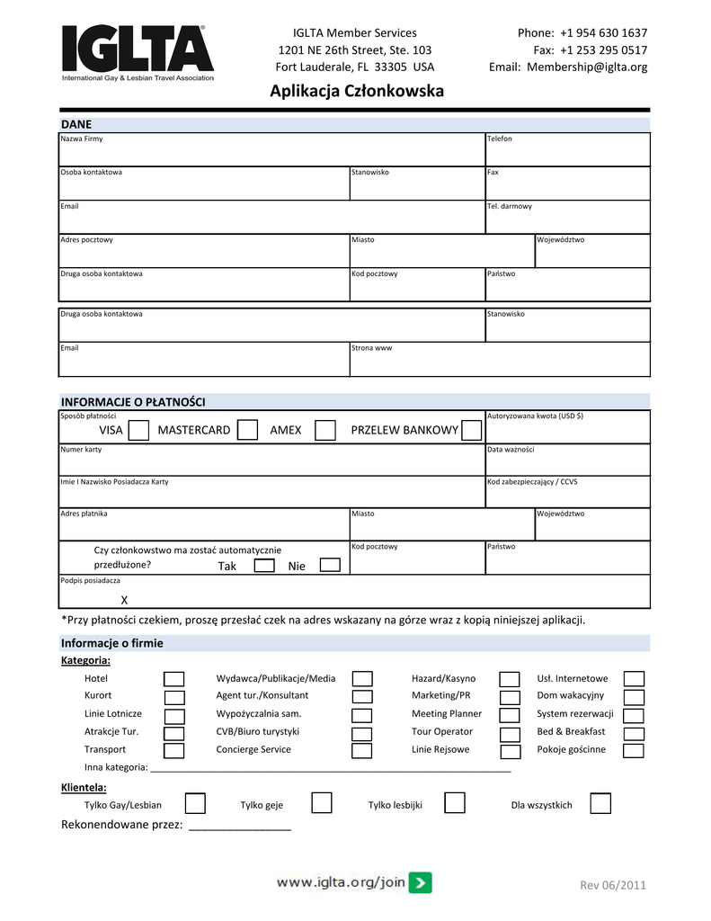 IGLTA Member Services 1201 NE 26th Street, Ste. 103 Fort Lauderale, FL 33305 USA Phone: +1 954 630 1637 Fax: +1 253 295 0517 Email: [email protected] Aplikacja Członkowska DANE Nazwa Firmy Telefon Osoba kontaktowa Stanowisko Fax Email Tel. darmowy Adres pocztowy Miasto Druga osoba kontaktowa Kod pocztowy Województwo Państwo Druga osoba kontaktowa Stanowisko Email Strona www INFORMACJE O PŁATNOŚCI Sposób płatności Autoryzowana kwota (USD $) VISA MASTERCARD AMEX PRZELEW BANKOWY Numer karty Data ważności Imie I Nazwisko Posiadacza Karty Kod zabezpieczający / CCVS Adres płatnika Miasto Czy członkowstwo ma zostać automatycznie przedłużone? Tak Województwo Kod pocztowy Państwo Nie Podpis posiadacza X *Przy płatności czekiem, proszę przesłać czek na adres wskazany na górze wraz z kopią niniejszej aplikacji. Informacje o firmie Kategoria: Hotel Wydawca/Publikacje/Media Hazard/Kasyno Usł. Internetowe Kurort Agent tur./Konsultant Marketing/PR Dom wakacyjny Linie Lotnicze Wypożyczalnia sam. Meeting Planner System rezerwacji Atrakcje Tur. CVB/Biuro turystyki Tour Operator Bed & Breakfast Transport Concierge Service Linie Rejsowe Pokoje gościnne Inna kategoria: ______________________________________________________________________ Klientela: Tylko Gay/Lesbian Tylko geje Tylko lesbijki Dla wszystkich Rekonendowane przez: ________________ Rev 06/2011 IGLTA Member Services 1201 NE 26th Street, Ste. 103 Fort Lauderale, FL 33305 USA Phone: +1 954 630 1637 Fax: +1 253 295 0517 Email: [email protected] Aplikacja Członkowska Członkowstwo w IGLTA jest otwarte dla wszystkich firm prywatnych, stowarzyszeń, korporacji lub spółek bezpośrednio lub pośrednio związanych z segmentem turystyki przeznaczonym dla gejów i lesbijek. Podstawowe członkostwo Zawiera pełne prawo do głosowania i ubiegania się o pozycje w Radzie Nadzorczej. Jest przewidziane dla agentów turystycznych, touroperatorów/hurtowników usług turystycznych, hotelarzy, oraz dostawców takich jak: linie lotnicze, wypożyczalnie samochodów, wydawnictwa, etc. Opłaty za członkowstwo: • Firmy zatrudniające 1-50 pracowników: 300 rocznie oraz jednorazowa opłata 100 USD • Firmy zatrudniające 51-200 pracowników: 660 USD rocznie oraz jednorazowa opłata 100 USD • Firmy zatrudniające 200 + pracowników 960 USD rocznie plus jednorazowa opłata 100 USD • Agencje turystyczne: 210 USD rocznie I opłata jednorazowa 50 USD Członkostwo PREMIUM (opcjonalnie) Członkowie IGLTA mają możliwość rozszerzyć członkowstwo do wariantu „Premium” za 295 USD dodatkowej opłaty rocznie. Wasza firmy stanie się jeszcze bardziej widoczna po prawej stronie wyszukiwarki w zakładce „Members Showcase”. Członkowie posiadający status „Premium” są widoczni w tym samym miejscu przy różnych wyszukiwaniach. Na stronie naszej wyszukiwarki, członkowie „Premium” pokazują się zawsze na górze swojej kategorii. Dodatkowo, dzięki możliwości załadowania wielu zdjęć w kilku albumach, które będą się wyświetlały na dole opisu. Wszystkie ceny zostały podane w Dolarach Amerykańskich (USD). Więcej informacji na temat korzyści wynikających z przynależności do IGLTA oraz pozostałe informacje dostępne są na stronie www.iglta.org. Wszystkie opłaty są ważne na okres jednego roku kalendarzowego od dnia przystąpienia do IGLTA. Po upływie roku należy odnowić swoje członkowstwo aby pozostać aktywnym współpracownikiem IGLTA. Uwaga! IGLTA, Inc. wraz z Radą Nadzorczą nie ponoszą odpowiedzialności za żadne produkty lub usługi dostarczane przez swoich członków. Możliwe są następujące warianty płatności: American Express, Mastercard, Visa, czek lub przelew bankowy. Przy płatności przelewem bankowym proszę skontaktować się z Ambasadorem IGLTA na terenie swojego kraju lub z działem obsługi +1 954 630 1652 po dodatkowe informacje. Przy płatności przelewem bankowym wymagana jest dodatkowa opłata 20 USD z tytułu kosztów manipulacyjnych. Jeżeli płatność dokonywana jest czekiem, jako beneficjenta należy wpisać: IGLTA i przesłać czek na adres: 1201 NE 26 Street, Ste. 103, Fort Lauderdale, FL 33305 USA W ciągu 72 godzin od przyjęcia aplikacji i płatności zostanie przesłany login I hasło dostępu do naszej strony www. W trakcie pierwszego logowania można wprowadzić opis firmy, wydarzenia w naszym światowym kalendarzu i skorzystać z innych dostępnych funkcji. For questions or comments, please contact: Piotr Wojcik, Ambassador t: +48.501.515.501 e: [email protected] Rev 06/2011