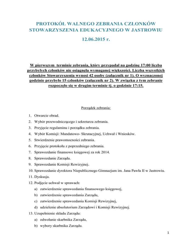 PROTOKÓŁ WALNEGO ZEBRANIA CZŁONKÓW STOWARZYSZENIA EDUKACYJNEGO W JASTROWIU 12.06.2015 r. W pierwszym terminie zebrania, który przypadał na godzinę 17:00 liczba przybyłych członków nie osiągnęła wymaganej większości. Liczba wszystkich członków Stowarzyszenia wynosi 42 osoby (załącznik nr 1). O wyznaczonej godzinie przybyło 15 członków (załącznik nr 2). W związku z tym zebranie rozpoczęło się w drugim terminie tj. o godzinie 17:15. Porządek zebrania: 1. Otwarcie obrad. 2. Wybór przewodniczącego i sekretarza zebrania. 3. Przyjęcie regulaminu i porządku zebrania. 4. Wybór Komisji: Mandatowo- Skrutacyjnej, Uchwał i Wniosków. 5. Stwierdzenie prawomocności zebrania. 6. Przyjęcie protokołu z poprzedniego zebrania. 7. Sprawozdanie finansowe księgowej za rok 2014. 8. Sprawozdanie Zarządu. 9. Sprawozdanie Komisji Rewizyjnej. 10. Sprawozdanie dyrektora Niepublicznego Gimnazjum im. Jana Pawła II w Jastrowiu. 11. Dyskusja. 12. Podjęcie uchwał w sprawach: a) zatwierdzenie sprawozdania finansowego księgowej, b) zatwierdzenie sprawozdania Zarządu, c) zatwierdzenie sprawozdania Komisji Rewizyjnej, d) udzielenie absolutorium Zarządowi i Komisji Rewizyjnej. 13. Uzupełnienie składu Zarządu: a) odwołanie skarbnika Zarządu, b) wybory skarbnika Zarządu. 1 14. Uzupełnienie składu Komisji Rewizyjnej: a) odwołanie członka Komisji Rewizyjnej, b) wybory członka Komisji Rewizyjnej. 15. Podjęcie uchwał. 16. Wolne wnioski. 17. Zakończenie zebrania. Ad.1. Prezes powitał przybyłych członków, po czym poprosił wszystkich o powstanie w celu uczczenia minutą ciszy pamięci niedawno zmarłego członka Stowarzyszenia- ś.p. Zdzisława Pasymowskiego. Następnie p. Mińko wspomniał o nowych członkach Stowarzyszenia, panie Krzysztofie Nowiku i panie Bartłomieju Czajce, którzy nie mogli z przyczyn osobistych wziąć udziału w posiedzeniu. Ad.2. Pan Stanisław Mińko zaproponował na przewodniczącego zebrania pana Krzysztofa Frankowskiego, który wyraził zgodę na objęcie tej funkcji. Nie podano innych kandydatur. Odbyło się głosowanie, w którym 15 osób opowiedziało się za tą kandydaturą. – UCHWAŁA NR 1. Na sekretarza obrad Stanisław Mińko zaproponował dwie kandydatury: Joanny Wójcik i Joanny Lipińskiej, które wyraziły zgodę na protokołowanie. Odbyło się głosowanie, w którym 15 osób opowiedziało się za tymi kandydaturami– UCHWAŁA NR 2. Dalszą część zebrania poprowadził pan Krzysztof Frankowski. Ad.3. Przewodniczący zebrania odczytał regulamin Walnego Zebrania i przeprowadził głosowanie celem jego przyjęcia. Regulamin przyjęto jednogłośnie – UCHWAŁA NR 3 Przewodniczący po upewnieniu się, że zgromadzeni nie mają uwag co do zamieszczonego w zaproszeniach porządku obrad, przeprowadził głosowanie w celu jego zatwierdzenia. Porządek przyjęto jednogłośnie- UCHWAŁA NR 4. Ad.4. Prezes zaproponował panów Adama Kisiela i Adama Chamier- Ciemińskiego do Komisji Mandatowo-Skrutacyjnej. Kandydaci wyrazili zgodę, a przewodniczący przeprowadził głosowanie, w wyniku którego wszyscy członkowie opowiedzieli się za kandydatamiUCHWAŁA NR 5. 2 Przewodniczący zwrócił się do zebranych o podanie kandydatów do Komisji Uchwał i Wniosków. Pan Mińko zaproponował panią Teresę Pachocką i panią Małgorzatę Gnieździńską. Pani Gnieździńska zgodziła się, natomiast pani Pachocka zaproponowała na swoje miejsce mężapana Wiesława Pachockiego, który wyraził zgodę. Przewodniczący przystąpił do głosowania, w którym jednogłośnie przyjęto wybrane osoby do Komisji Uchwał i Wniosków.- UCHWAŁA NR 6. Ad.5. Głos zabrał pan Adam Chamier- Ciemiński, który poinformował, że liczba zgromadzonych członków w pierwszym terminie była niewystarczająca, by zebranie miało charakter prawomocny (35,7% obecnych), lecz zgodnie z pkt. 3 regulaminu zebranie członków organizowane w drugim terminie może podejmować uchwały, zgłaszać wnioski i przeprowadzać wybory bez względu na liczbę członków. W związku z powyższym stwierdził prawomocność zebrania – UCHWAŁA NR 7. Ad.6. Prezes przypomniał, że protokół z poprzedniego Walnego Zebrania został zamieszczony na stronie internetowej, a przewodniczący w związku z brakiem uwag przeprowadził głosowanie w celu przyjęcia tego protokołu. Za przyjęciem głosowało 15 osób- UCHWAŁA NR 8. Ad.7. Z uwagi na nieobecność księgowej sprawozdanie finansowe odczytał pan Stanisław Mińko (załącznik nr 3). Ad.8. Prezes Stowarzyszenie odczytał sprawozdanie z pracy Zarządu (załącznik nr 4). Ad.9. Członek Komisji Rewizyjnej- pani Weronika Baum odczytała sprawozdanie z pracy komisji (załącznik nr 5). Następnie p. Baum poprosiła o udzielenie absolutorium Zarządowi. Ad.10. Sprawozdanie dotyczące Niepublicznego Gimnazjum w Jastrowiu odczytała dyrektorka NGpani Teresa Pachocka (załącznik nr 6). Ad.11. Pani Teresa Pachocka w nawiązaniu do swojego sprawozdania zarysowała problem związany z małym naborem do gimnazjum na rok szkolny 2015/2016 i poprosiła o rady, które mogłyby pomóc w tej trudnej sytuacji. 3 Pani Joanna Wójcik spytała o trudną sytuację szkoły ponadgimnazjalnej w Jastrowiu, której niepewny byt może wpływać na niski nabór do gimnazjum. Pani Teresa Pachocka wyraziła niepewność co do istnienia tej placówki. Pani Małgorzata Gnieździńska wspomniała, że jednym z powodów takiej sytuacji jest niż demograficzny. Pan Adam Kisiel wskazał na lęk uczniów, którzy myślą, że nie poradzą sobie z nauką w Niepublicznym Gimnazjum w Jastrowiu. Pan Adam Chamier- Ciemiński zaproponował, by dać sygnał uczniom, że w szkole mogą liczyć na „blok wsparcia” ze strony nauczyciela, aby uczeń wiedział, że nauczyciel mu pomoże w problemach z nauką nawet na zasadzie wolontariatu. Pani Małgorzata Gnieździńska wskazała na problem z placówką publiczną, która werbując uczniów wyraża negatywne opinie n