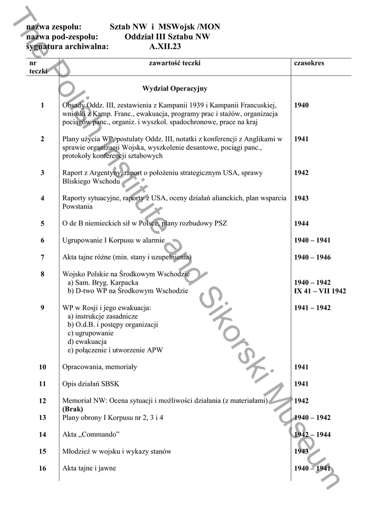 Th eP nazwa zespołu: Sztab NW i MSWojsk /MON nazwa pod-zespołu: Oddział III Sztabu NW sygnatura archiwalna: A.XII.23 zawartość teczki nr teczki czasokres s oli Wydział Operacyjny 1940 2 Plany użycia WP, postulaty Oddz. III, notatki z konferencji z Anglikami w sprawie organizacji Wojska, wyszkolenie desantowe, pociągi panc., protokoły konferencji sztabowych 1941 3 Raport z Argentyny, raport o położeniu strategicznym USA, sprawy Bliskiego Wschodu 1942 4 Raporty sytuacyjne, raporty z USA, oceny działań alianckich, plan wsparcia Powstania 1943 5 O de B niemieckich sił w Polsce, plany rozbudowy PSZ 1944 6 Ugrupowanie I Korpusu w alarmie 1940 – 1941 7 Akta tajne różne (min. stany i uzupełnienia) 1940 – 1946 8 Wojsko Polskie na Środkowym Wschodzie a) Sam. Bryg. Karpacka b) D-two WP na Środkowym Wschodzie 1940 – 1942 IX 41 – VII 1942 te titu ns hI Obsady Oddz. III, zestawienia z Kampanii 1939 i Kampanii Francuskiej, wnioski z Kamp. Franc., ewakuacja, programy prac i stażów, organizacja pociągów panc., organiz. i wyszkol. spadochronowe, prace na kraj 1 dS an 1941 – 1942 WP w Rosji i jego ewakuacja: a) instrukcje zasadnicze b) O.d.B. i postępy organizacji c) ugrupowanie d) ewakuacja e) połączenie i utworzenie APW 10 Opracowania, memoriały 11 Opis działań SBSK 12 1942 13 Memoriał NW: Ocena sytuacji i możliwości działania (z materiałami) (Brak) Plany obrony I Korpusu nr 2, 3 i 4 14 Akta „Commando” 1942 – 1944 15 Młodzież w wojsku i wykazy stanów 16 Akta tajne i jawne iko 9 rsk 1941 1940 – 1942 eu us iM 1941 1943 m 1940 – 1941 Th eP nazwa zespołu: Sztab NW i MSWojsk /MON nazwa pod-zespołu: Oddział III Sztabu NW sygnatura archiwalna: A.XII.23 nr teczki 17 zawartość teczki czasokres Wytyczne i kursy wyszkoleniowe APW 1943 s oli Akta dotyczące wyszkolenia w I Korpusie. Wizyta fabryk samolotów w USA 1942 19 Działania aliantów, notatki dla NW do rozmów z Churchilem, wykazy kursów i stażów, sprawy II Korpusu, depesze Andersa, sprawy 2 DSP 1943 20 Staże w Armii USA i angielskiej, wyszkolenie Samodzielnej Brygady Spadochronowej 1944 21 Wyszkolenie, raporty i wytyczne. Sprawozdania 2 Korpusu. 1945 22 Wytyczne i kursy wyszkoleniowe APW i II Korpusu titu ns hI 18 1943 Wydział Broni Pancernej te 23 Wytyczne wyszkoleniowe, reorganizacja broni pancernej, tabele i wykazy stanów wojennych dyw. panc. 24 Projekty stworzenia wojskowej jednostki pancernej, wyszkolenie, notatki służbowe, pociągi pancerne 1941 25 Organizacyjne i wyszkoleniowe I Dyw. Panc., CW Broni Pancernej, typy alianckich czołgów, sprawozdania z stanów w brytyjskich woj. jed. panc., sprzęt I Dyw. Panc., charakterystyka polskiego sprzętu panc. sprzed 1939, uwagi o sojuszniczym sprzęcie 1942 26 Centrum Wyszkolenia Broni Pancernej (CWBP) 1943 27 Szefostwo Piechoty Akta wyszkoleniowe, organizacja naczelnych władz PSZ 1945 28 Akta wyszkoleniowe 1940 dS an iko rsk Szefostwo Saperów Raporty bojowe 1 Dyw. Panc. 31 Meldunki sytuacyjne JWŚW 32 Zarządzenia okupacyjne dla 1 Sam. Bryg. Spad. 33 Referaty 3 DSK dla NW VIII.44 -III.1945 XII.44 –IV.1946 X 1945 28 III 1944 m 30 IV 44 – I 1946 eu Sprawozdania z działalności bojowej II Korpusu us 29 iM Wydział Operacyjno – Wyszkoleniowy 1945 Th eP nazwa zespołu: Sztab NW i MSWojsk /MON nazwa pod-zespołu: Oddział III Sztabu NW sygnatura archiwalna: A.XII.23 nr teczki 34 zawartość teczki czasokres Referaty 5 KDP dla NW 2 IV 1944 1945 – 1947 36 Akta organizacyjne różne 1943 – 1945 37 Wytyczne wyszkolenia II Korpus 1945 – 1946 37 Centra Wyszk. Wojsk. 1945 – 1946 39 Szkolenie zawodowe 1945 – 1946 40 Akta wyszkolenia – różne 1941 – 1946 41 Likwidacja, demobilizacja 1945 titu ns Akta Sekcji Studiów hI s oli 35 te Wydział operacyjny 42 3-cia podróż NW do USA: a) zagadnienia zasadnicze b) szyfry otrzymane c) szyfry wysłane 43 Sprawy krajowe 44 Protokóły z konferencji w sprawie przygotowania wsparcia dla powstania III.42 – X.1942 45 Konferencja w sprawie sytuacji w Kraju I.43 – II.1944 46 Notatki płk Mareckiego 47 Notatki ppłk Piotrowskiego 48 Zagadnienie granic Polski 49 Instrukcje, wytyczne 50 APW: a) dokumenty b) O.d.B. c) meldunki sytuacyjne d) fotografie i dyslokacja e) komunikacje na Śr. Wschodzie 51 Zasadnicze opracowania Oddziału III 52 Dyslokacja oddziałów XII.42 – I.1943 dS an 1943 – 1944 iko 1942 – 1943 rsk 1942 – 1943 1940 – 1945 1946 eu us iM 1943 – 1944 1942 m 1941 – 1942 Th eP nazwa zespołu: Sztab NW i MSWojsk /MON nazwa pod-zespołu: Oddział III Sztabu NW sygnatura archiwalna: A.XII.23 nr teczki 53 zawartość teczki czasokres Referaty o organizacji władz naczelnych PSZ 1941 – 1942 s oli 54 Komitet Studiów nad organizacją władz naczelnych 55 WP w WB: a) akta zasadnicze b) raporty stanów c) materiały og – org. d) I Korpus Panc.- Mot. e) 1Dyw. Pancerna f) 1 Samodzielna Brygada Spadochronowa g) różne materiały organizacyjne h) referat dla NW o APW i II Korpusie 56 Wyższa Szkoła Wojenna 1940 – 1946 57 Instytut Psychodemografii 1944 – 1946 58 Wykazy kursów 1945 – 1946 59 Wytyczne wyszkolenia I sprawozdania 1945 60 Sprawozdania ze stażów 1940 – 1945 61 Komisja Doświadczalna WPŚW 1942 62 Sprawozdania Komisji Regulaminowej 1944 – 1947 63 Sprawozdanie Komisji Wyszkoleniowo – Wydawniczej D-twa APW XII.42 – II.43 64 Ocena sytuacji niemieckiej na froncie wschodnim 1943 65 Działania bojowe i straty PSZ 66 Projekt organizacji wywiadu 67 Komisja Doświadczalna D-twa WPŚW 68 Komisja Doświadczalna D-twa WPŚW 69 Centrum Wyszkolenia Panc. i Techn. 70 Operacja „Market Garden” (Arnhem) tłumaczenie z angielskiego 71 Raport operacyjny kpt. J.Rostworowskiego o Arnhem 72 Użycie Sam. Bryg. Spad. 1940 – 1945 te titu ns hI dS an iko rsk 1944 – 1945 1943 IX.42 – I.1943 1940 – 1945 us iM VI 1942 1955 eu IX.1942 ? m 1942 – 1945 Th eP nazwa zespołu: Sztab NW i MSWojsk /MON nazwa pod-zespołu: Oddział III Sztabu NW sygnatura archiwalna: A.XII.23