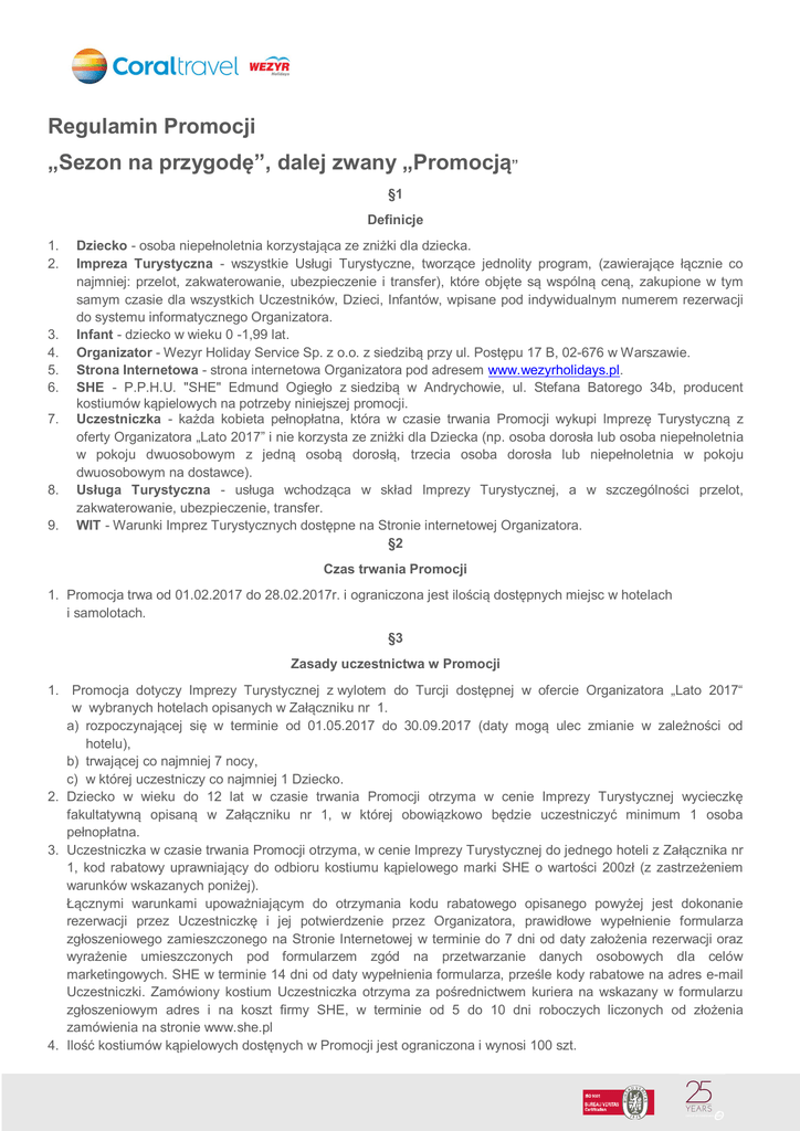 Regulamin Promocji „Sezon na przygodę”, dalej zwany „Promocją” §1 Definicje 1. 2. 3. 4. 5. 6. 7. 8. 9. Dziecko - osoba niepełnoletnia korzystająca ze zniżki dla dziecka. Impreza Turystyczna - wszystkie Usługi Turystyczne, tworzące jednolity program, (zawierające łącznie co najmniej: przelot, zakwaterowanie, ubezpieczenie i transfer), które objęte są wspólną ceną, zakupione w tym samym czasie dla wszystkich Uczestników, Dzieci, Infantów, wpisane pod indywidualnym numerem rezerwacji do systemu informatycznego Organizatora. Infant - dziecko w wieku 0 -1,99 lat. Organizator - Wezyr Holiday Service Sp. z o.o. z siedzibą przy ul. Postępu 17 B, 02-676 w Warszawie. Strona Internetowa - strona internetowa Organizatora pod adresem www.wezyrholidays.pl. SHE - P.P.H.U. "SHE" Edmund Ogiegło z siedzibą w Andrychowie, ul. Stefana Batorego 34b, producent kostiumów kąpielowych na potrzeby niniejszej promocji. Uczestniczka - każda kobieta pełnopłatna, która w czasie trwania Promocji wykupi Imprezę Turystyczną z oferty Organizatora „Lato 2017” i nie korzysta ze zniżki dla Dziecka (np. osoba dorosła lub osoba niepełnoletnia w pokoju dwuosobowym z jedną osobą dorosłą, trzecia osoba dorosła lub niepełnoletnia w pokoju dwuosobowym na dostawce). Usługa Turystyczna - usługa wchodząca w skład Imprezy Turystycznej, a w szczególności przelot, zakwaterowanie, ubezpieczenie, transfer. WIT - Warunki Imprez Turystycznych dostępne na Stronie internetowej Organizatora. §2 Czas trwania Promocji 1. Promocja trwa od 01.02.2017 do 28.02.2017r. i ograniczona jest ilością dostępnych miejsc w hotelach i samolotach. §3 Zasady uczestnictwa w Promocji 1. Promocja dotyczy Imprezy Turystycznej z wylotem do Turcji dostępnej w ofercie Organizatora „Lato 2017“ w wybranych hotelach opisanych w Załączniku nr 1. a) rozpoczynającej się w terminie od 01.05.2017 do 30.09.2017 (daty mogą ulec zmianie w zależności od hotelu), b) trwającej co najmniej 7 nocy, c) w której uczestniczy co najmniej 1 Dziecko. 2. Dziecko w wieku do 12 lat w czasie trwania Promocji otrzyma w cenie Imprezy Turystycznej wycieczkę fakultatywną opisaną w Załączniku nr 1, w której obowiązkowo będzie uczestniczyć minimum 1 osoba pełnopłatna. 3. Uczestniczka w czasie trwania Promocji otrzyma, w cenie Imprezy Turystycznej do jednego hoteli z Załącznika nr 1, kod rabatowy uprawniający do odbioru kostiumu kąpielowego marki SHE o wartości 200zł (z zastrzeżeniem warunków wskazanych poniżej). Łącznymi warunkami upoważniającym do otrzymania kodu rabatowego opisanego powyżej jest dokonanie rezerwacji przez Uczestniczkę i jej potwierdzenie przez Organizatora, prawidłowe wypełnienie formularza zgłoszeniowego zamieszczonego na Stronie Internetowej w terminie do 7 dni od daty założenia rezerwacji oraz wyrażenie umieszczonych pod formularzem zgód na przetwarzanie danych osobowych dla celów marketingowych. SHE w terminie 14 dni od daty wypełnienia formularza, prześle kody rabatowe na adres e-mail Uczestniczki. Zamówiony kostium Uczestniczka otrzyma za pośrednictwem kuriera na wskazany w formularzu zgłoszeniowym adres i na koszt firmy SHE, w terminie od 5 do 10 dni roboczych liczonych od złożenia zamówienia na stronie www.she.pl 4. Ilość kostiumów kąpielowych dostęnych w Promocji jest ograniczona i wynosi 100 szt. §4 Płatności 1. Uczestniczka zobowiązuje się uiścić opłatę ceny Imprezy Turystycznej zgodnie z pkt. 3 WIT. §5 Rezygnacja lub zmiana Imprezy Turystycznej 1. W przypadku rezygnacji z Imprezy Turystycznej lub dokonywania zmian w Imprezie Turystycznej przez Uczestnika, zastosowanie mają WIT, dostępne w siedzibie lub na Stronie internetowej Organizatora. 2. W przypadku rezygnacji lub w sytuacji gdy Impreza Turystyczna zostanie odwołana z winy Organizatora, a klientka nie wybierze alternatywnej Imprezy Turystycznej, to jest ona zobowiązana do zwrócenia równowartości 200 zł za kostium kąpielowy na numer rachunku bankowego wskazany przez Organizatora w ciągu 14 dni od daty rezygnacji. §6 Reklamacje 1. Reklamację, roszczenie, uwagi i zastrzeżenie związane z uczestnictwem w Promocji, Uczestnik może składać pisemnie, pod rygorem nieważności, na adres siedziby Organizatora. 2. Reklamację należy składać niezwłocznie po zaistnieniu zdarzenia budzącego zastrzeżenia Uczestnika Promocji. 3. Reklamacja powinna zawierać: a) numer rezerwacji, b) imię i nazwisko Uczestnika, c) adres do korespondencji, d) opis zarzutów stanowiących podstawę reklamacji, e) oczekiwania Uczestnika Promocji dotyczące sposobu naprawy szkody, f) podpis Uczestnika Promocji. 4. Postępowanie reklamacyjne prowadzone jest przez Organizatora, który dokłada wszelkich starań, aby obsługa reklamacji była dokonana z należytą starannością, wnikliwie i terminowo z uwzględnieniem wszystkich okoliczności sprawy. §7 Postanowienia końcowe 1. Treść niniejszego regulaminu dostępna jest na Stronie Internetowej. 2. Przystępując do Promocji każdy Uczestnik oświadcza, iż otrzymał, zapoznał się i akceptuje treść niniejszego regulaminu i jego postanowień. 3. Prawem właściwym dla wykładni i stosowania Promocji jest prawo polskie. 4. W zakresie nieuregulowanym Promocją stosuje się obowiązujące WIT w dniu zawarcia umowy. 5. Organizator zastrzega sobie prawo do odwołania Promocji, bez konieczności podawania przyczyn, z zastrzeżeniem, że odwołanie nie wpłynie na prawa i obowiązki uprzednio nabyte przez Uczestnika, który dokonał zakupu Imprezy Turystycznej przed odwołaniem. Informacja o odwołaniu Promocji zostanie opublikowana na Stronie internetowej lub w inny sposób podana do wiadomości publicznej. 6. Promocja „Sezon na przygodę” łączy się z innymi promocjami. Załącznik nr 1 1. Lista hoteli biorących udział w Promocji wraz wycieczkami fakultatywnymi. a) Rejs jachtem - Eftalia Village, - Eftalia Aqua, - Eftalia Splash, - Eftalia