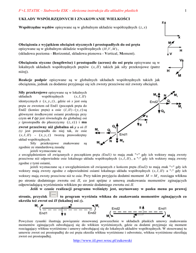 F+L STATIK – Stabwerke ESK – skrócona instrukcja dla układów płaskich 1 UKŁADY WSPÓŁRZĘDNYCH I ZNAKOWANIE WIELKOŚCI z Współrzędne węzłów opisywane są w globalnym układzie współrzędnych ( z , x) x M Obciążenia z wyjątkiem obciążeń stycznych i prostopadłych do osi pręta opisywane są w globalnym układzie współrzędnych ( H , V , M ) , (składowa pozioma - Horizontal, składowa pionowa - Vertical, Moment). H V Obciążenia styczne (lengthwise) i prostopadłe (across) do osi pręta opisywane są w lokalnych układach współrzędnych prętów ( x, II ) takich jak siły przekrojowe (patrz niżej). V H M Reakcje podpór opisywane są w globalnych układach współrzędnych takich jak obciążenia, jednak za dodatnie przyjmuje się ich zwroty przeciwne niż zwroty obciążeń. Siły przekrojowe opisywane są w lokalnych MII Mt N układach współrzędnych ( x, I , II ) QI identycznych z ( x, y, z ) , gdzie oś x jest osią End2 pręta ze zwrotem od End1 (początek pręta do MI End2 (koniec pręta) a osie ( I , II ) - ( y, z ) są QII głównymi środkowymi osiami przekroju przy x czym oś I (y) jest równoległa do globalnej osi y (prostopadła do płaszczyzny ( z , x) ) i ma I II QII zwrot przeciwny niż globalna oś y a oś II MI QI (z) jest prostopadła do niej tak, że osie End1 ( x, I , II ) - ( x, y, z ) tworzą prawoskrętny układ współrzędnych. MII N Mt Siły przekrojowe znakowane są zgodnie ze standardową zasadą: jeżeli wyznaczane są z uwzględnieniem sił związanych z początkiem pręta (End1) to mają znak "+" gdy ich wektory mają zwroty przeciwne niż odpowiednie osie lokalnego układu współrzędnych ( x, I , II ) , a "-" gdy ich wektory mają zwroty zgodne z tymi osiami, jeżeli wyznaczane są z uwzględnieniem sił związanych z końcem pręta (End2) to mają znak "+" gdy ich wektory mają zwroty zgodne z odpowiednimi osiami lokalnego układu współrzędnych ( x, I , II ) a "-" gdy ich wektory mają zwroty przeciwne niż te osie. Przy takim przyjęciu dodatni moment M = M I rozciąga włókna po stronie dodatniego zwrotu osi II, co jest spójne z umową znakowania momentów zginających odpowiadającą wyróżnieniu włókien po stronie dodatniego zwrotu osi II. Jeśli w czasie realizacji programu wciśnięty jest, usytuowany w pasku menu po prawej stronie, przycisk to program wyróżnia włókna do znakowania momentów zginających co określa też zwrot osi II (lokalnej osi z). II End2 End1 End2 MI x End1 MI II x MI MI Powyższe rysunki ilustrują powiązanie stosowanej powszechnie w układach płaskich umowy znakowania momentów zginających odwołującej się do włókien wyróżnionych, gdzie za dodatni przyjmuje się moment rozciągający włókna wyróżnione i umowy odwołującej się do lokalnych układów współrzędnych. W stosowanej tu umowie zwrot osi prostopadłej do osi pręta określa włókna wyróżnione i odwrotnie, włókna wyróżnione określają zwrot osi prostopadłej. http://www.iil.pwr.wroc.pl/zukowski F+L STATIK – Stabwerke ESK – skrócona instrukcja dla układów płaskich ABY URUCHOMIĆ PROGRAM klikamy dwukrotnie w ikonę następnie WYBIERAMY kolejno: Układy prętowe 2 F+L STATIK.lnk Płaskie ESK1 Ebenes Stabwerk.lnk układy prętowe Rozwiązywane mogą być układy standardowe to jest takie, których opis zawarty jest w bazie programu (ramy ortogonalne i określone typy kratownic) oraz układy, których opis wprowadzany jest w całości przez użytkownika. Jeśli rozwiązywany jest układ standardowy można przejść do punktu menu Standard systems. Komentarze Dodatkowe parametry prętów Węzły sprężyste Podpory Pręty Współrzędne węzłów Przekroje prętów Parametry materiału W przeciwnym razie rozpoczynamy od punktu menu System input - dane dotyczące konstrukcji. Dane dotyczące konstrukcji wprowadzane są w tabeli wielozakładkowej, której nagłówek przedstawiono obok. Klikając w określony przycisk uaktywnia się wprowadzanie odpowiadających mu danych. To samo uzyskuje się przez użycie przycisków: Akceptacja , Kontynuacja . UWAGA: Dane w tabelach wprowadzane są w wierszach aktywnych (podświetlonych na żółto). Dodawanie wierszy aktywnych i usuwanie umożliwiają przyciski: Dodanie aktywnego wiersza (podświetlonego na żółto) , Usunięcie aktywnego wiersza wraz z danymi , Usunięcie wszystkich danych z aktywnej tabeli . Pod większością tabel wyświetlana jest czerwona strzałka , po której wyświetlane są informacje jakie wartości należy w wpisywać w pole tabeli, w którym aktualnie usytuowany jest kursor. Wprowadzając dane i odczytując wyniki należy zwracać uwagę na jednostki: siły-kN, momenty-kNm, wymiary globalne–m, charakterystyki przekrojów-cm, właściwości fizyczne- kN i cm, przemieszczenia-cm. Wprowadzanie danych rozpoczynamy od wybrania materiału. Gdy wybierzemy jeden z materiałów standardowych: Reinforcet concrete, Steel, Aluminium, Wood Materiał zostaną wyświetlone stałe materiałowe E-mod.-moduł Younga, Beton G-mod.-moduł Kirchoffa, Stal (tu także można wybrać User defined) Alpha-współczynnik rozszerzalności termicznej, Aluminium BetaS/fyk-wytrzymałość charakterystyczna, Drewno Gamma-masa objętościowa. Materiał definiowany Gdy wybierzemy User defined - materiał definiowany można wprowadzić własne stałe materiałowe (w analizie statycznej wystarczy E-mod., w przypadku uwzględniania odkształceń postaciowych G-mod. i w przypadku obciążeń termicznych Alpha, można też wprowadzić w żółtym polu kolumny Materials własną nazwę definiowanego materiału). Jeśli sztywności giętne prętów wyrażamy przez wartość porównawczą EI w postaci αEI , wygodnie jest przyjąć (ze względu na jednostki) E = 10 000 kN / cm 2 . W kratownicach gdy sztywności podłużne przedstawiamy w postaci αEA przyjmujemy E = 1 kN / cm 2 . Kontynuacja Akceptacja Cross sections - przekroje (pojawia się tabela, której fragmenty p