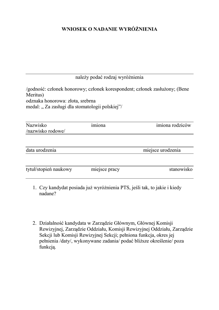 WNIOSEK O NADANIE WYRÓśNIENIA naleŜy podać rodzaj wyróŜnienia /godność: członek honorowy; członek korespondent; członek zasłuŜony; (Bene Meritus) odznaka honorowa: złota, srebrna medal: „ Za zasługi dla stomatologii polskiej”/ Nazwisko /nazwisko rodowe/ imiona data urodzenia tytuł/stopień naukowy imiona rodziców miejsce urodzenia miejsce pracy stanowisko 1. Czy kandydat posiada juŜ wyróŜnienia PTS, jeśli tak, to jakie i kiedy nadane? 2. Działalność kandydata w Zarządzie Głównym, Głównej Komisji Rewizyjnej, Zarządzie Oddziału, Komisji Rewizyjnej Oddziału, Zarządzie Sekcji lub Komisji Rewizyjnej Sekcji; pełniona funkcja, okres jej pełnienia /daty/, wykonywane zadania/ podać bliŜsze określenie/ poza funkcją. 3. Działalność kandydata w Głównym Sądzie KoleŜeńskim lub Sądzie KoleŜeńskim Oddziału, pełniona funkcja, okres jej pełnienia /daty/, liczba rozpatrywanych spraw. 4. Działalność kandydata w Kole Terenowym lub Kole Sekcji, pełniona funkcja, okres jej sprawowania /dokładne daty/, liczba zorganizowanych zebrań, inne konkretne formy działania 5. Działalność naukowo-szkoleniowa kandydata, podać tytuły, daty i miejsca wygłoszenia referatu. 6. Działalność w wydawnictwach Towarzystwa, pełniona funkcja, okres jej sprawowania, inne formy udziału w pracy wydawniczej. 7. Praca społeczna przy organizowaniu zjazdów, konferencji, sympozjów naukowych PTS. Podać bliŜsze dane. 8. Inne zasługi kandydata w realizacji statutowych zadań Polskiego Towarzystwa Stomatologicznego /statut PTS, rozdział II, paragrafy 5 i 6/ podać konkretne dokonania.