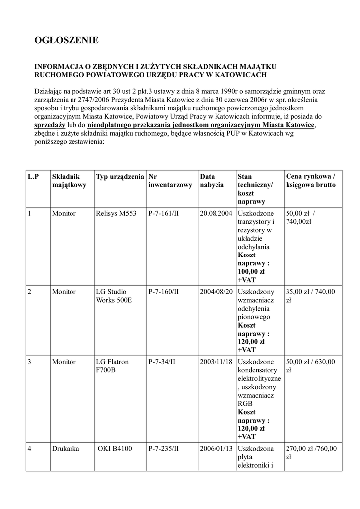 OG OSZENIE INFORMACJA O ZB DNYCH I ZU YTYCH SK ADNIKACH MAJ TKU RUCHOMEGO POWIATOWEGO URZ DU PRACY W KATOWICACH Dzia aj c na podstawie art 30 ust 2 pkt.3 ustawy z dnia 8 marca 1990r o samorz dzie gminnym oraz zarz dzenia nr 2747/2006 Prezydenta Miasta Katowice z dnia 30 czerwca 2006r w spr. okre lenia sposobu i trybu gospodarowania sk adnikami maj tku ruchomego powierzonego jednostkom organizacyjnym Miasta Katowice, Powiatowy Urz d Pracy w Katowicach informuje, i posiada do sprzeda y lub do nieodp atnego przekazania jednostkom organizacyjnym Miasta Katowice, zb dne i zu yte sk adniki maj tku ruchomego, b ce w asno ci PUP w Katowicach wg poni szego zestawienia: Stan techniczny/ koszt naprawy Cena rynkowa / ksi gowa brutto L.P Sk adnik maj tkowy Typ urz dzenia Nr inwentarzowy Data nabycia 1 Monitor Relisys M553 P-7-161/II 20.08.2004 Uszkodzone tranzystory i rezystory w uk adzie odchylania Koszt naprawy : 100,00 z +VAT 50,00 z / 740,00z 2 Monitor LG Studio Works 500E P-7-160/II 2004/08/20 Uszkodzony wzmacniacz odchylenia pionowego Koszt naprawy : 120,00 z +VAT 35,00 z / 740,00 3 Monitor LG Flatron F700B P-7-34/II 50,00 z / 630,00 2003/11/18 Uszkodzone kondensatory elektrolityczne , uszkodzony wzmacniacz RGB Koszt naprawy : 120,00 z +VAT 4 Drukarka OKI B4100 P-7-235/II 2006/01/13 Uszkodzona yta elektroniki i 270,00 z /760,00 zasilacza, uszkodzony zespó rolek po rednich w torze przesuwu papieru Koszt naprawy: 170,00 z +VAT 5 Drukarka OKI ML 3320 P-7-13/II/8 300,00 z / 2001/12/28 Uszkodzony 1560,00 z uk ad scalonego sterownika portu LPT na ycie g ównej, uszkodzona ga ka Koszt naprawy: 180,00 z +VAT 6 Komputer PC P-7-279/II 100,00 z / 2007/12/19 Uszkodzona pami RAM, 1200,00 z uszkodzona karta grafiki, uszkodzona yta g ówna kondensatory Koszt naprawy: 285,00 z +VAT 7 Komputer PC P-7-37/II 2003/11/18 Uszkodzona yta g ówna Koszt naprawy: 150,00 z + VAT 100,00 z / 2900,00 z 8 Komputer PC P-7-16/II/8 2002/12/22 Uszkodzony zasilacz Koszt naprawy: 200,00 z + VAT 80,00 z / 2475,00 9 Komputer PC P-7-155/II 2004/08/13 Uszkodzony zasilacz Koszt naprawy: 100,00 z / 865,00 200,00 z + VAT 10 Komputer PC P-7-16/II/3 2002/12/22 Uszkodzony zasilacz Koszt naprawy: 200,00 z + VAT 100,00 z / 2 475,00 z 11 Komputer PC P-7-265/II 2006/08/25 Uszkodzony zasilacz, potrzeba regeneracji uk adu ch odzenia Koszt naprawy: 220,00 z + VAT 100,00 z /873,83 12 Komputer PC P-7-268/II 2007/12/19 Uszkodzona yta g ówna potrzeba regeneracji uk adu ch odzenia Koszt naprawy: 220,00 z + VAT 100,00 z / 1200,00z 13 Komputer PC P-7-73/I 100,00 z / 2003/12/23 Uszkodzony zasilacz, karta 3460,01 z grafiki, przycisk sieciowy Koszt naprawy: 180,00 z + VAT Sprz t którego naprawa nie jest uzasadniona technicznie i ekonomicznie. L.p Sk adnik maj tkowy Typ urz dzenia Nr inwentarzo wy Data nabycia Usterki Cena ksi gowa brutto 1 Monitor Siemens P-7-78/II 23.12.2003 Uszkodzona 790,00 z yta elektroniki 2 Monitor LG Studioworks 500E P-7-18-3/II 17.12.2002 Uszkodzona 740,00 z yta elektroniki 3 Monitor LG Studioworks 560N T-2-67/I 17.12.2002 Uszkodzona 740,00 z yta elektroniki 4 Monitor Samsung SyncMaster 753DX P-7-18/II/2 17.12.2002 Uszkodzona 600,00 z yta elektroniki 5 Monitor Siemens Nixdorf MCM 1507 P-7-25/II 30.07.2003 Uszkodzona 650,00 z (zwarta) yta g ówna 6 Monitor LG Studioworks 500E P-7-23/II 30.07.2003 Uszkodzona 740,00 z yta elektroniki 8 Switch Request Nr 1502 Uszkodzona 30,00 z yta elektroniki 9 Switch Request 805SX Nr 1666 Uszkodzona 35,00 z yta elektroniki 10 Komputer PC T-2-70/I 4.06.2001 Uszkodzony 1 540,00 z procesor pami zasilacz Koszt naprawy komputera ok. 800,00 z +VAT 11 Komputer PC P-7-157/II 13.08.2004 Uszkodzony 1265,01 procesor pami zasilacz Koszt naprawy komputera ok. 800,00 z +VAT 12 Komputer PC P-7-280/II 19.12.2007 Uszkodzony 1793,4 procesor pami zasilacz Koszt naprawy komputera ok. 800,00 z +VAT 13 Komputer PC T-2-71/I 4.06.2001 Uszkodzony 1 940,00 z procesor pami zasilacz Koszt naprawy komputera ok. 800,00 z +VAT 14 Komputer PC P-7-157/II 13.08.2004 Uszkodzony 1265,01 procesor pami zasilacz Koszt naprawy komputera ok. 800,00 z +VAT 15 Komputer PC P-7-280/II 19.12.2007 Uszkodzony 1 793,40 z procesor pami zasilacz Koszt naprawy komputera ok. 800,00 z +VAT 16 Komputer PC P-7-242/II 13.01.2006 Uszkodzony 2 949,98 z procesor pami zasilacz Koszt naprawy komputera ok. 800,00 z +VAT 17 Klawiatury (35 sztuk) Siemens Nixdorf, Siemens Nixdorf, BTC, BTC, BTC BTC, BTC, BTC, BTC, Standard, Keybord Tracer, Panaview, Panaview, Panaview, Soft, Soft, Samsung, Chi-Com, ChiCom, DTK, Bez nazwy, Bez nazwy Wearnus, Bez, nazwy, Model K-6, Soft, DTK, DTK Przekazanie sk adnika w formie sprzeda y nast puje na podstawie umowy kupna-sprzeda y oraz protoko u odbioru (za . nr 12 do Zarz. nr 37/2008 z dnia 08.08 2008 – w za czeniu poni ej) Przekazanie sk adnika jednostce organizacyjnej Miasta Katowice nast puje na wniosek o nieodp atne przekazanie, kierowany do Dyrektora PUP w Katowicach (za . nr 6 do Zarz. nr 37/2008 z dnia 08.08 2008 – w za czeniu poni ej) Odbiór sk adnika maj tku ruchomego nast puje na koszt podmiotu, któremu sprzedano lub przekazano ten sk adnik maj tku. Wnioski prosimy przesy do 17 kwietnia 2009 r. na adres: POWIATOWY URZ D PRACY 40-852 Katowice, ul. Po piecha 14 z dopiskiem: mienie zb dne i zu yte W przypadku niejasno ci pytania prosimy kierowa do Referatu ds. organizacyjno – administracyjnych – p. S. Grzegorczyk pod. tel.: 32 2588-549, wew. 416 e-mail: [email protected] Dyrektor Barbara Zaj c