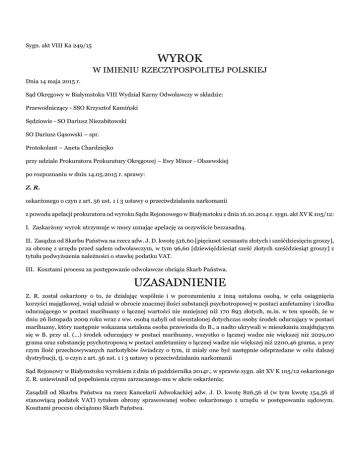 Sygn. akt VIII Ka 249/15 WYROK W IMIENIU RZECZYPOSPOLITEJ POLSKIEJ Dnia 14 maja 2015 r. Sąd Okręgowy w Białymstoku VIII Wydział Karny Odwoławczy w składzie: Przewodniczący - SSO Krzysztof Kamiński Sędziowie - SO Dariusz Niezabitowski SO Dariusz Gąsowski – spr. Protokolant – Aneta Chardziejko przy udziale Prokuratora Prokuratury Okręgowej – Ewy Minor - Olszewskiej po rozpoznaniu w dniu 14.05.2015 r. sprawy: Z. R. oskarżonego o czyn z art. 56 ust. 1 i 3 ustawy o przeciwdziałaniu narkomanii z powodu apelacji prokuratora od wyroku Sądu Rejonowego w Białymstoku z dnia 16.10.2014 r. sygn. akt XV K 105/12: I. Zaskarżony wyrok utrzymuje w mocy uznając apelację za oczywiście bezzasadną. II. Zasądza od Skarbu Państwa na rzecz adw. J. D. kwotę 516,60 [pięciuset szesnastu złotych i sześćdziesięciu groszy], za obronę z urzędu przed sądem odwoławczym, w tym 96,60 [dziewięćdziesiąt sześć złotych sześćdziesiąt groszy] z tytułu podwyższenia należności o stawkę podatku VAT. III. Kosztami procesu za postępowanie odwoławcze obciąża Skarb Państwa. UZASADNIENIE Z. R. został oskarżony o to, że działając wspólnie i w porozumieniu z inną ustalona osobą, w celu osiągnięcia korzyści majątkowej, wziął udział w obrocie znacznej ilości substancji psychotropowej w postaci amfetaminy i środka odurzającego w postaci marihuany o łącznej wartości nie mniejszej niż 170 893 złotych, m.in. w ten sposób, że w dniu 26 listopada 2009 roku wraz z ww. osobą nabyli od nieustalonej dotychczas osoby środek odurzający w postaci marihuany, który następnie wskazana ustalona osoba przewiozła do B., a nadto ukrywali w mieszkaniu znajdującym się w B. przy ul. (...) środek odurzający w postaci marihuany, wszystko o łącznej wadze nie większej niż 2029,00 grama oraz substancję psychotropową w postaci amfetaminy o łącznej wadze nie większej niż 2200,46 grama, a przy czym ilość przechowywanych narkotyków świadczy o tym, iż miały one być następnie odsprzedane w celu dalszej dystrybucji, tj. o czyn z art. 56 ust. 1 i 3 ustawy o przeciwdziałaniu narkomanii Sąd Rejonowy w Białymstoku wyrokiem z dnia 16 października 2014r., w sprawie sygn. akt XV K 105/12 oskarżonego Z. R. uniewinnił od popełnienia czynu zarzucanego mu w akcie oskarżenia; Zasądził od Skarbu Państwa na rzecz Kancelarii Adwokackiej adw. J. D. kwotę 826,56 zł (w tym kwotę 154,56 zł stanowiącą podatek VAT) tytułem obrony sprawowanej wobec oskarżonego z urzędu w postępowaniu sądowym. Kosztami procesu obciążono Skarb Państwa. Na zasadzie art.425§1 i 2 kpk i art. 444 kpk zaskarżył wyrok w całości na niekorzyść oskarżonego prokurator. Powołując się na treść art. 427§1 i 2 kpk, art. 437§1 i 2 kpk i art. 438 pkt 2 i 3 kpk zarzucił orzeczeniu obrazę przepisów postępowania mającą wpływ na treść orzeczenia, a mianowicie: - art. 366 § kpk i art. 167 kpk polegającą na nie dążeniu przez Sąd do wyjaśnienia wszelkich okoliczności sprawy nie podjęciu inicjatywy dowodowej z urzędu w zakresie, w jakim w sprawie tej pojawiły się wątpliwości dające rozstrzygnąć się w zakresie tego, czy oskarżony Z. R. zamieszkiwał w okresie objętym zarzutem w mieszkaniu znajdującym się na ul. (...) poprzez przesłuchanie w charakterze świadka (...) ówczesnej dziewczyny Z. R. na okoliczności tego, gdzie wówczas oskarżony zamieszkiwał i jak często przebywał i odwiedzał ją w jej mieszkaniu znajdującym na ul. (...) w B., a więc w bardzo bliskiej odległości od mieszkania ojca oskarżonego (to samo osiedle), - art. 7 kpk poprzez ocenę zebranego w sprawie materiału dowodowego w sposób całkowicie dowolny, wbrew zasadom prawidłowego rozumowania oraz wskazań wiedzy i doświadczenia życiowego w szczególności: • analizy kryminalnej dotyczącej połączeń telefonicznych uzyskaną na etapie postępowania przygotowawczego oraz opinii biegłego nr (...) z zakresu analizy kryminalnej uzyskanej przez skład orzekający w trakcie postępowania sądowego co do okoliczności związanych z ilością logowań w poszczególnych miejscach telefonu komórkowego użytkowanego przez Z. R. oraz zawarcie w uzasadnieniu wyroku analizy opinii biegłego nr (...), która w sposób oczywisty pozostaje w sprzeczności z wnioskami biegłego zawartymi w ekspertyzie sporządzonej na wniosek Sądu, • przyjęcie, iż zeznania A. S. (1) potwierdzają, iż oskarżony we wskazanym okresie czasu wykonywał prace dorywcze w rejonie ul. (...) w B., podczas gdy zeznania te w żaden sposób na to nie wskazują, • poprzez ocenę wyjaśnień oskarżonego w sposób całkowicie dowolny, wbrew zasadom prawidłowego rozumowania oraz wskazań wiedzy i doświadczenia życiowego w szczególności, poprzez bezpodstawne danie im wiary w zakresie zamieszkiwania Z. R. z ojcem w mieszkaniu na ul. (...) w B., wykonywania prac dorywczych w centrum miasta w okresie objętym zarzutem oraz tego, iż oskarżony nie uczestniczył w obrocie narkotykami wspólnie i w porozumieniu ze swoim bratem, w sytuacji zanegowania przez Sąd właściwie całej pozostałej treści wyjaśnień oskarżonego i wskazanie, iż są one niekonsekwentne i nielogiczne, - art. 4 kpk i art. 410 kpk poprzez nieuwzględnieniem przy wydaniu wyroku wszystkich okoliczności przemawiających na niekorzyść oskarżonego, a w szczególności: • treści analizy kryminalnej dotyczącej miejsca logowań telefonu komórkowego, którym posługiwał się oskarżony w okresie objętym zarzutem, z której jednoznacznie wynika, iż Z. R. przebywał w mieszkaniu przy ul. (...) w nocy z 25/26 listopada 2009 roku, kiedy to zgodnie z ustaleniami Policji, porcjowana i "rozrabiana" była amfetamina przywieziona przez D. R. (1) (ostanie logowania telefonu o godzinie 00:53:14), • treści opinii biegłego nr (...) z zakresu analizy kryminalnej, z której jednoznacznie wynika, iż co najmniej w okresie od 23 października 2009 r