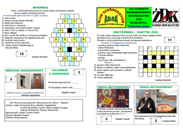WIRÓWKA Litery z niebieskich pól czytane po skosie dadzą rozwiązanie zadania: nazwę zespołu i tytuł jego utworu. Prawoskrętnie (pierwsza litera w polu z kreską): 1) ruda cynku. 2) historyczna prowincja Irlandii. 1 2 3) glinka porcelanowa. 4) cela karna w więzieniu. 5) tajemnicza wiara ludów Haiti w duchy. 6) stan w USA ze stolicą w Carson City. 3 7) łgarz, blagier. 8) gra w karty lub władca w starożytnym Egipcie. 9) jednostka monetarna Portugalii przed euro. 5 6 7 10) zawisak, motyl nocny. 11) właściwie to Korzeniowski. 12) rodzaj sztyletu nakładanego na lufę karabinu. 9 XIV OTWARTE SZARADZIARSKIE MISTRZOSTWA ŻAR 06.06.2015.r. Pierwsza runda 4 KRZYŻÓWKA – ZABYTKI ŻAR 8 10 12 Czesław Krasiński REBUSIK ANAGRAMOWY 11 12 KALAMBUR Z HOMONIMEM 1) 2) 3) 3 3 Dwuznak siepaczowi łzy _ _ _ _ W niej klejnot, dolary lub... _ _ _ _ Jednowyrazowy, o początkowej literze R. Zdzisław Jagodziński 4) 5) W rzędy należy wpisać po dwa wyrazy, które nie mają wspólnych liter, ale kończą się i zaczynają w kolorowych kratkach. Właśnie w tych kratkach powstanie rozwiązanie dodatkowe. 11 Poziomo (w kolejności przypadkowej): - dawniej regatowa łódź wioślarska. - stolica Piemontu. 1 2 3 4 5 - przenośnik czerpakowy. - potrawa z jaj z dodatkiem mąki usmażona w formie placka. - pożoga. - turystyczny lub samochodowy. Pionowo: pasożyt roślin zbożowych. miasto w Indiach, stolica stanu Radżastan. poeta włoski, autor poematu „Orland szalony”. na nosie Hilarego. wariat, obłąkany. Czesław Krasiński -------------------------------------------------------------------------------------------------------------------------- REBUS METAGRAMOWY REBUS METAGRAMOWY Bogdan Tropak XIV Otwarte Szaradziarskie Mistrzostwa Żar 2015.r. – Runda 1 Autorzy zadań: Franciszek Bors, Zdzisław Jagodziński , Czesław Krasiński, Czesław Piwko, Bogdan Tropak, Andrzej Wiśniewski, Tomasz Wiśniewski. Opracowanie i skład: Czesław Piwko Korekta: Bogdan Tropak Nakład: 40 egzemplarzy W każdym członie zmienić jedną literę i odczytać dwuwyrazowe rozwiązanie o początkowych literach: Ż . C. 3 Bogdan Tropak Rozwiązaniem jest tytuł popularnej piosenki biesiadnej. Czesław Piwko 2 NA BANK ! JOLKA W dwuwyrazowych hasłach poziomych ujawniono BANK. Litery w polach ponumerowanych w prawym dolnym rogu, napisane od 1 do 17, utworzą rozwiązanie. 1 2 3 4 6 7 16 15 9 A 2 K 5 3 2 H 1 A N R R 13 N 4 K 12 B B A 8 N 14 11 10 K 6 17 3 4 5 6 7 8 9 10 11 12 13 14 15 16 17 ------------------------------------------------------------------------------------------------------------------------------------------------------ LOGOGRYF 2 3 4 5 6 R 31 Pionowo: 1) zwierzę roślinożerne, często szkodnik, odżywiające się żywymi lub martwymi częściami roślin. 2) związek chemiczny powstający głównie przez utlenianie lub odwadnianie alkoholi. 3) pachnący olejek używany jako dodatek do potraw, zwłaszcza do ciast. 4) krótki, obcisły płaszcz noszony w XVII - XIX w. 11 5) pracownik obsługujący pasażerów na statku lub w samolocie. 6) ogrom, mnóstwo, nawał, napływ czegoś. 7) jadalna drobna ryba o wrzecionowatym kształcie, skojarz z powiedzeniem. 8) bohater „Potopu”. Tomasz Wiśniewski 1 R Litery z kolorowej kolumny dadzą rozwiązanie dodatkowe: imię i nazwisko znanej osoby. 5 7 8 B 1 W diagramie ujawniono wszystkie w nim występujące litery H i R. Znaczenia wyrazów: 1 - obiekt zainteresowania Wojskiego na grzybobraniu. 2 - marnują się tworząc z kwasami estry. 3 - ptaki barwiące pióra spożywanymi krabami. Podpowiedź- czerwonaki. 4 - owad z gatunku hypocera albo pogardliwie o zepsutym owocu. 5 - uczta rozbierańców, popularna w starożytnym Rzymie. 6 - wkłada w interes, niestety, pieniądze. 6 Bogdan Tropak W kolejności alfabetycznej: R H - ryba z rodziny śledziowatych. - poemat prozą Juliusza Słowackiego. - trójkątna chusta noszona na szyi. - sklep z lekami. - stolica stanu Georgia. - część żołądka u przeżuwaczy. - jej szyfr został złamany przez polskich matematyków. - Krzysztof „wiecznie młody" prezenter telewizyjny. - rodzaj kindżału. - obchodzi jakąś rocznicę. - budka dla ptaków zrobiona przez człowieka. - brukiew. - przebita opona. - David, amerykański reżyser („Dzikość serca”). - obława uliczna podczas okupacji. - reperacja, remont. - wynalazca dynamitu. - cienkie i mocne pończochy ze sztucznego włókna. - wolna godzina w planie lekcyjnym. - człowiek wszechwiedzący. - ptak z rodziny drozdowatych. - wypłata pensji. - rozwój, doskonalenie się. - roślina dla panny. - zdrowa roślina warzywna. - „ płuca” ryb. - łączna lub tłuszczowa. - zadanie szaradziarskie. - septyczny lub tektoniczny. - sokoli lub krótki. - Walenty, były polski hokeista lodowy. Czesław Krasiński DWA ZA JEDNO METAGRAMOWA – SZYFR Wszystkie odgadywane hasła składają się z dwóch wyrazów. Litery w polach z kropką, czytane rzędami oraz ponumerowane od 1 do 12 utworzą rozwiązanie - słowo oraz jego dwuwyrazowe znaczenie. 1 2 5 3 Do diagramu wpisujemy metagramy odgadniętych wyrazów. Litery czytane kolejno od 1 do 21 dadzą rozwiązanie – nazwę rośliny. Poziomo: 18) „forsiasty” bramkarz? 4) napój z chininą. 8) Woody, znany reżyser 18 9 6 21 19 1 2 i aktor. 4 12 1) Galapagos. 2) budżet. 3) głupiec. 4) sus. 5) cyferblat. 6) kocioł. 7) paragon. 8) tykanie. 9) miłek. 10) Ameryka. 5 2 6 7 9 7 1 8 10 3 11 6 Pionowo: 18) bój, walka. 6) odmiana węgla kamiennego. 19) duży mięsisty nochal. 10 4 2 15 1 8 20 7 5 12 3 11 6 3 4 17 5 6 7 8 14 9 10 11 12 13 13 14 15 16 16 17 18 19 20 21 Czesław Krasiński ---------------------------------------------------------------------------------------------------------------------------------------------- SAMOSIA Z MISTRZEM OLIMPIJSKIM Wolne pola diagramu należy uzupełnić literami występującymi w nazwisku polskiego mistrza olimpijskiego, które ujawniono w diagramie (każdą raz), tak aby po