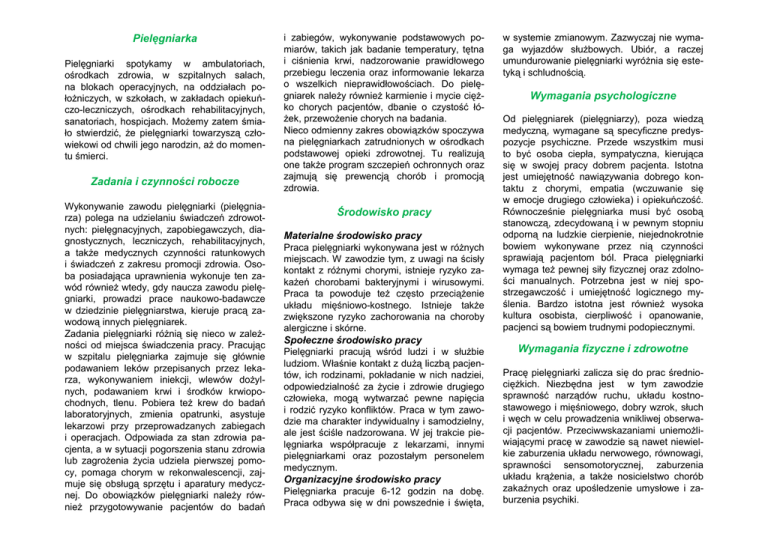 Pielęgniarka Zadania i czynności robocze Środowisko pracy