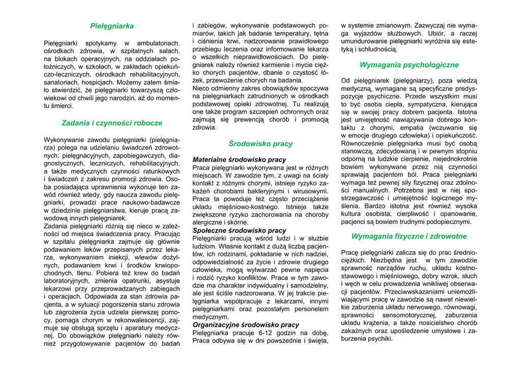 Pielęgniarka Pielęgniarki spotykamy w ambulatoriach, ośrodkach zdrowia, w szpitalnych salach, na blokach operacyjnych, na oddziałach położniczych, w szkołach, w zakładach opiekuńczo-leczniczych, ośrodkach rehabilitacyjnych, sanatoriach, hospicjach. Możemy zatem śmiało stwierdzić, że pielęgniarki towarzyszą człowiekowi od chwili jego narodzin, aż do momentu śmierci. Zadania i czynności robocze Wykonywanie zawodu pielęgniarki (pielęgniarza) polega na udzielaniu świadczeń zdrowotnych: pielęgnacyjnych, zapobiegawczych, diagnostycznych, leczniczych, rehabilitacyjnych, a także medycznych czynności ratunkowych i świadczeń z zakresu promocji zdrowia. Osoba posiadająca uprawnienia wykonuje ten zawód również wtedy, gdy naucza zawodu pielęgniarki, prowadzi prace naukowo-badawcze w dziedzinie pielęgniarstwa, kieruje pracą zawodową innych pielęgniarek. Zadania pielęgniarki różnią się nieco w zależności od miejsca świadczenia pracy. Pracując w szpitalu pielęgniarka zajmuje się głównie podawaniem leków przepisanych przez lekarza, wykonywaniem iniekcji, wlewów dożylnych, podawaniem krwi i środków krwiopochodnych, tlenu. Pobiera też krew do badań laboratoryjnych, zmienia opatrunki, asystuje lekarzowi przy przeprowadzanych zabiegach i operacjach. Odpowiada za stan zdrowia pacjenta, a w sytuacji pogorszenia stanu zdrowia lub zagrożenia życia udziela pierwszej pomocy, pomaga chorym w rekonwalescencji, zajmuje się obsługą sprzętu i aparatury medycznej. Do obowiązków pielęgniarki należy również przygotowywanie pacjentów do badań i zabiegów, wykonywanie podstawowych pomiarów, takich jak badanie temperatury, tętna i ciśnienia krwi, nadzorowanie prawidłowego przebiegu leczenia oraz informowanie lekarza o wszelkich nieprawidłowościach. Do pielęgniarek należy również karmienie i mycie ciężko chorych pacjentów, dbanie o czystość łóżek, przewożenie chorych na badania. Nieco odmienny zakres obowiązków spoczywa na pielęgniarkach zatrudnionych w ośrodkach podstawowej opieki zdrowotnej. Tu realizują one także program szczepień ochronnych oraz zajmują się prewencją chorób i promocją zdrowia. Środowisko pracy Materialne środowisko pracy Praca pielęgniarki wykonywana jest w różnych miejscach. W zawodzie tym, z uwagi na ścisły kontakt z różnymi chorymi, istnieje ryzyko zakażeń chorobami bakteryjnymi i wirusowymi. Praca ta powoduje też często przeciążenie układu mięśniowo-kostnego. Istnieje także zwiększone ryzyko zachorowania na choroby alergiczne i skórne. Społeczne środowisko pracy Pielęgniarki pracują wśród ludzi i w służbie ludziom. Właśnie kontakt z dużą liczbą pacjentów, ich rodzinami, pokładanie w nich nadziei, odpowiedzialność za życie i zdrowie drugiego człowieka, mogą wytwarzać pewne napięcia i rodzić ryzyko konfliktów. Praca w tym zawodzie ma charakter indywidualny i samodzielny, ale jest ściśle nadzorowana. W jej trakcie pielęgniarka współpracuje z lekarzami, innymi pielęgniarkami oraz pozostałym personelem medycznym. Organizacyjne środowisko pracy Pielęgniarka pracuje 6-12 godzin na dobę. Praca odbywa się w dni powszednie i święta, w systemie zmianowym. Zazwyczaj nie wymaga wyjazdów służbowych. Ubiór, a raczej umundurowanie pielęgniarki wyróżnia się estetyką i schludnością. Wymagania psychologiczne Od pielęgniarek (pielęgniarzy), poza wiedzą medyczną, wymagane są specyficzne predyspozycje psychiczne. Przede wszystkim musi to być osoba ciepła, sympatyczna, kierująca się w swojej pracy dobrem pacjenta. Istotna jest umiejętność nawiązywania dobrego kontaktu z chorymi, empatia (wczuwanie się w emocje drugiego człowieka) i opiekuńczość. Równocześnie pielęgniarka musi być osobą stanowczą, zdecydowaną i w pewnym stopniu odporną na ludzkie cierpienie, niejednokrotnie bowiem wykonywane przez nią czynności sprawiają pacjentom ból. Praca pielęgniarki wymaga też pewnej siły fizycznej oraz zdolności manualnych. Potrzebna jest w niej spostrzegawczość i umiejętność logicznego myślenia. Bardzo istotna jest również wysoka kultura osobista, cierpliwość i opanowanie, pacjenci są bowiem trudnymi podopiecznymi. Wymagania fizyczne i zdrowotne Pracę pielęgniarki zalicza się do prac średniociężkich. Niezbędna jest w tym zawodzie sprawność narządów ruchu, układu kostnostawowego i mięśniowego, dobry wzrok, słuch i węch w celu prowadzenia wnikliwej obserwacji pacjentów. Przeciwwskazaniami uniemożliwiającymi pracę w zawodzie są nawet niewielkie zaburzenia układu nerwowego, równowagi, sprawności sensomotorycznej, zaburzenia układu krążenia, a także nosicielstwo chorób zakaźnych oraz upośledzenie umysłowe i zaburzenia psychiki. Wymagany poziom kwalifikacji i ścieżka kształcenia w zawodzie Obecnie, w nowym systemie kształcenia, jedynym sposobem uzyskania kwalifikacji pielęgniarki jest ukończenie uczelni wyższej na kierunku pielęgniarskim, w trybie dwustopniowym, dziennym lub zaocznym. Studia I stopnia trwają 3 lata i kończą się uzyskaniem tytułu licencjata pielęgniarstwa, natomiast studia II stopnia trwają 2 lata i kończą się uzyskaniem tytułu magistra pielęgniarstwa. Po ukończeniu studiów i uzyskaniu dyplomu uzyskuje się prawo wykonywania zawodu, wydawane przez Okręgową Radę Pielęgniarek i Położnych. W celu poszerzania swoich uprawnień zawodowych, dyplomowane pielęgniarki, posiadające co najmniej 2-letni staż pracy w zawodzie, mają możliwość odbycia szkoleń specjalizacyjnych, kończących się złożeniem egzaminu. Pielęgniarka otrzymuje wówczas tytuł specjalisty w danej dziedzinie, np. pielęgniarstwa chirurgicznego, diabetologicznego, kardiologicznego, opieki paliatywnej itp. Dodatkowo pielęgniarki mogą uczestniczyć także w kursach kwalifikacyjnych, specjalistycznych i dokształcających. Znowelizowane w 2015 r. przepisy prawne nadały pielęgniark