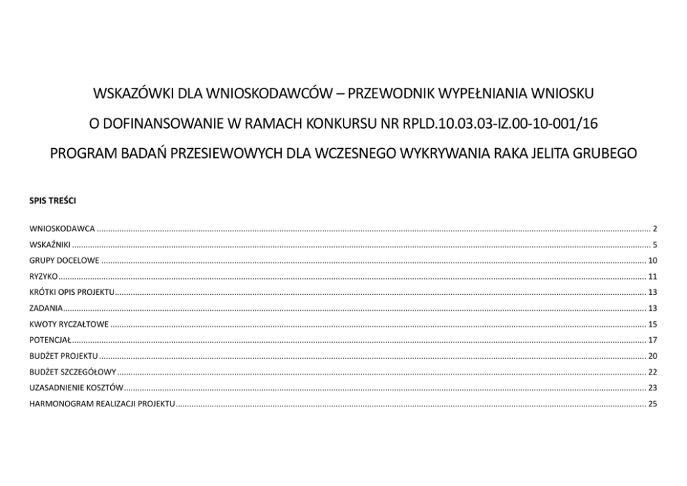WSKAZÓWKI DLA WNIOSKODAWCÓW – PRZEWODNIK WYPEŁNIANIA WNIOSKU O DOFINANSOWANIE W RAMACH KONKURSU NR RPLD.10.03.03-IZ.00-10-001/16 PROGRAM BADAŃ PRZESIEWOWYCH DLA WCZESNEGO WYKRYWANIA RAKA JELITA GRUBEGO SPIS TREŚCI WNIOSKODAWCA ...................................................................................................................................................................................................................................................... 2 WSKAŹNIKI ................................................................................................................................................................................................................................................................. 5 GRUPY DOCELOWE .................................................................................................................................................................................................................................................. 10 RYZYKO ..................................................................................................................................................................................................................................................................... 11 KRÓTKI OPIS PROJEKTU............................................................................................................................................................................................................................................ 13 ZADANIA ................................................................................................................................................................................................................................................................... 13 KWOTY RYCZAŁTOWE .............................................................................................................................................................................................................................................. 15 POTENCJAŁ ............................................................................................................................................................................................................................................................... 17 BUDŻET PROJEKTU ................................................................................................................................................................................................................................................... 20 BUDŻET SZCZEGÓŁOWY ........................................................................................................................................................................................................................................... 22 UZASADNIENIE KOSZTÓW ........................................................................................................................................................................................................................................ 23 HARMONOGRAM REALIZACJI PROJEKTU ................................................................................................................................................................................................................. 25 WNIOSKODAWCA Wniosek o dofinansowanie projektu konkursowego współfinansowanego ze środków Europejskiego Funduszu Społecznego w ramach Regionalnego Programu Operacyjnego Województwa Łódzkiego na lata 2014-2020 Informacje wypełniane przez instytucję przyjmującą wniosek Data przyjęcia wniosku: Numer wniosku: Numer wniosku w centralnym systemie teleinformatycznym SL2014: Imię i nazwisko osoby przyjmującej wniosek: I. Informacje o projekcie 1.1 Numer i nazwa Osi priorytetowej: X Adaptacyjność pracowników i przedsiębiorstw w regionie 1.2 Numer i nazwa Działania dla Osi: X.3 Ochrona utrzymanie i przywrócenie zdrowia 1.3 Numer i nazwa Poddziałania: X.3.3 Działania uzupełniające populacyjne programy profilaktyczne w kierunku wczesnego wykrywania nowotworu jelita grubego, piersi i szyjki macicy. 1.4 Instytucja, w której wniosek zostanie złożony: Urząd Marszałkowski Województwa Łódzkiego 1.5 Numer konkursu/naboru: 1.6 Tytuł projektu: 1.7 Okres realizacji projektu: RPLD-10.03.03-IZ.00-10-001/16 Podaj tytuł projektu, który: nie może być tożsamy z nazwą RPO WŁ, ani z nazwami Osi priorytetowych, Działań i Poddziałań RPO WŁ; nie może liczyć więcej niż 1000 znaków i powinien zaczynać się od litery albo cyfry arabskiej; nie zaczynaj od innych znaków takich jak cudzysłów, myślnik, nawias, itp., ani znaków specjalnych takich jak #, &, $, <, itp.; powinien być zwięzły i nawiązywać do typu projektu, realizowanych zadań i grupy docelowej, która zostanie objęta wsparciem. Wskaż datę rozpoczęcia projektu w formacie Wskaż datę zakończenia projektu w formacie od: do: „RRRR-MM-DD” „RRRR-MM-DD” Wypełnienie okresu realizacji projektu jest niezbędne do dalszej edycji wniosku - na podstawie dat wpisanych, jako okres realizacji projektu, automatycznie opisywane są kolumny w ramach Budżetu i Szczegółowego budżetu projektu (rok kalendarzowy) oraz kolumny w ramach Harmonogramu realizacji projektu (odpowiednia liczba, zakres i oznaczenie kolumn dla pierwszych dwunastu miesięcy realizacji projektu i kolejnych kwartałów realizacji projektu). Okres realizacji projektu obejmuje realizację w sensie rzeczowym (działania), jak i finansowym (wydatki). Data rozpoczęcia projektu nie może być wcześniejsza niż 1.01.2014 r., a data jego zakończenia późniejsza niż 31.12.2023 r. Końcowa data realizacji projektu nie uwzględnia czasu na złożenie końcowego wniosku o płatność i finalne rozliczenie projektu, w tym dokonywanie ostatecznych płatności związanych z realizacją projektu. 2 1.8 Obszar realizacji projektu: Wojew