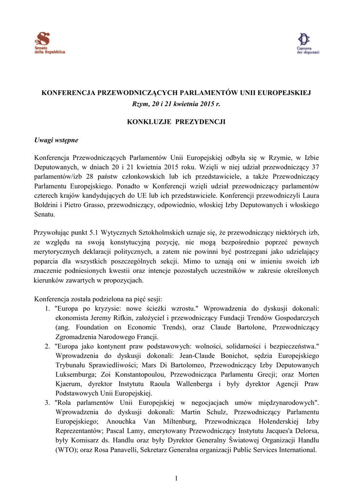 KONFERENCJA PRZEWODNICZĄCYCH PARLAMENTÓW UNII EUROPEJSKIEJ Rzym, 20 i 21 kwietnia 2015 r. KONKLUZJE PREZYDENCJI Uwagi wstępne Konferencja Przewodniczących Parlamentów Unii Europejskiej odbyła się w Rzymie, w Izbie Deputowanych, w dniach 20 i 21 kwietnia 2015 roku. Wzięli w niej udział przewodniczący 37 parlamentów/izb 28 państw członkowskich lub ich przedstawiciele, a także Przewodniczący Parlamentu Europejskiego. Ponadto w Konferencji wzięli udział przewodniczący parlamentów czterech krajów kandydujących do UE lub ich przedstawiciele. Konferencji przewodniczyli Laura Boldrini i Pietro Grasso, przewodniczący, odpowiednio, włoskiej Izby Deputowanych i włoskiego Senatu. Przywołując punkt 5.1 Wytycznych Sztokholmskich uznaje się, że przewodniczący niektórych izb, ze względu na swoją konstytucyjną pozycję, nie mogą bezpośrednio poprzeć pewnych merytorycznych deklaracji politycznych, a zatem nie powinni być postrzegani jako udzielający poparcia dla wszystkich poszczególnych sekcji. Mimo to uznają oni w imieniu swoich izb znaczenie podniesionych kwestii oraz intencje pozostałych uczestników w zakresie określonych kierunków zawartych w propozycjach. Konferencja została podzielona na pięć sesji: 1. "Europa po kryzysie: nowe ścieżki wzrostu." Wprowadzenia do dyskusji dokonali: ekonomista Jeremy Rifkin, założyciel i przewodniczący Fundacji Trendów Gospodarczych (ang. Foundation on Economic Trends), oraz Claude Bartolone, Przewodniczący Zgromadzenia Narodowego Francji. 2. "Europa jako kontynent praw podstawowych: wolności, solidarności i bezpieczeństwa." Wprowadzenia do dyskusji dokonali: Jean-Claude Bonichot, sędzia Europejskiego Trybunału Sprawiedliwości; Mars Di Bartolomeo, Przewodniczący Izby Deputowanych Luksemburga; Zoi Konstantopoulou, Przewodnicząca Parlamentu Grecji; oraz Morten Kjaerum, dyrektor Instytutu Raoula Wallenberga i były dyrektor Agencji Praw Podstawowych Unii Europejskiej. 3. "Rola parlamentów Unii Europejskiej w negocjacjach umów międzynarodowych". Wprowadzenia do dyskusji dokonali: Martin Schulz, Przewodniczący Parlamentu Europejskiego; Anouchka Van Miltenburg, Przewodnicząca Holenderskiej Izby Reprezentantów; Pascal Lamy, emerytowany Przewodniczący Instytutu Jacques'a Delorsa, były Komisarz ds. Handlu oraz były Dyrektor Generalny Światowej Organizacji Handlu (WTO); oraz Rosa Panavelli, Sekretarz Generalna organizacji Public Services International. 1 4. "Omówienie i zatwierdzenie zasad Regulaminu Konferencji z art. 13 Traktatu o stabilności, koordynacji i zarządzaniu w Unii Gospodarczej i Walutowej oraz omówienie i zatwierdzenie zmian w Regulaminie Konferencji ds. WPZiB i WPBiO". 5. "Wzmocnienie dialogu politycznego". Sesja rozpoczęła się prezentacją wygłoszoną przez Loretę Grauziniene, Przewodniczącą parlamentu Litwy. Europa ponad kryzysem: nowe ścieżki wzrostu 1. Przewodniczący uznają, że kryzys wywarł trwały, negatywny wpływ na systemy produkcji, zatrudnienie i standard życia ludzi. 2. Przewodniczący odnotowują, że gospodarka europejska przejawia pewne oznaki ożywienia. Niemniej są one skromne, a sytuacja gospodarcza jest wciąż niepewna, poziom inwestycji niski, stopa bezrobocia wysoka, zwłaszcza wśród młodych ludzi. 3. Przewodniczący zdają sobie sprawę, że powszechna wśród obywateli jest nieufność w stosunku do zdolności UE do odpowiedniej reakcji na wyzwania związane z kryzysem. Zgadzają się zatem, że istnieje potrzeba wdrożenia innowacyjnych rozwiązań, które umożliwią pokonanie słabości strukturalnych a także optymalne wykorzystanie szczególnych walorów gospodarczych i społecznych UE. Z myślą o tym celu przewodniczący opowiadają się za opracowaniem zestawu polityk służących modernizacji europejskiego modelu rozwoju i uczynieniu go bardziej konkurencyjnym w perspektywie globalnej, przy jednoczesnym zachowaniu społecznego modelu gospodarki rynkowej oraz należytym uwzględnieniu konsekwencji społecznych. 4. Dlatego też przewodniczący z zadowoleniem przyjmują nowe inicjatywy podejmowane przez instytucje Unii Europejskiej w celu wzmocnienia wzrostu, wspierania inwestycji i łagodzenia procyklicznych skutków polityk konsolidacji fiskalnej, a w szczególności z zadowoleniem przyjmują: - "Plan inwestycyjny dla Europy", który może pomóc wzmocnić publiczne i prywatne inwestycje i podnieść w ten sposób produktywność i konkurencyjność; - pakiet propozycji dotyczących stworzenia unii energetycznej, która będzie oznaczać strategiczny krok na drodze do wzmocnienia konkurencyjności i trwałości europejskich systemów produkcji. Ze szczególnym zainteresowaniem przewodniczący oczekują na wcześniejsze przyjęcie rozporządzenia powołującego Europejski Fundusz Inwestycji Strategicznych (EFSI). 5. Przewodniczący z zadowoleniem przyjmują niekonwencjonalną politykę monetarną Europejskiego Banku Centralnego, a w szczególności jego program "luzowania ilościowego", przewidujący skupowanie obligacji rządowych i obligacji sektora prywatnego. Przewodniczący są zdania, że polityka ta może w krótkiej perspektywie czasowej przyczynić się do dalszego ożywienia europejskiej gospodarki, eliminując ryzyka deflacji. 6. Przewodniczący z zainteresowaniem obserwują rewizję Strategii Europa 2020, której dotychczasowa realizacja – zważywszy ustalone cele – nie była w pełni satysfakcjonująca. 2 7. Ponadto, przewodniczący bacznie monitorują opracowywanie nowej europejskiej polityki przemysłowej, której celem – zgodnie z propozycją Komisji Europejskiej – jest poprawa globalnej konkurencyjności sektora wytwórczego. Europa jako kontynent praw podstawowych 1. Przewodniczący po raz kolejny zwracają uwagę, że Unia Europejska stanowi punkt odniesienia dla ochrony praw podstawowych nie tylko własnych obywateli, ale również wszystkich osób mieszkających w jej granicach. 2. Przewodniczący wzywają insty