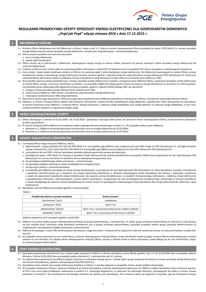 REGULAMIN PROMOCYJNEJ OFERTY SPRZEDAŻY ENERGII ELEKTRYCZNEJ DLA GOSPODARSTW DOMOWYCH „Prąd jak Prąd” edycja zimowa 2016 z dnia 17.12.2015 r. 1. INFORMACJE OGÓLNE 1.1. Niniejsza Oferta dedykowana jest dla Odbiorców, o których mowa w pkt 3.1., którzy w okresie obowiązywania Oferty posiadają lub zawrą z PGE Obrót S.A. umowy sprzedaży energii elektrycznej lub umowy sprzedaży energii elektrycznej i świadczenia usług dystrybucji – umowy kompleksowe. 1.2. Oferta zawiera wysokość oraz warunki stosowania: a. cen za energię elektryczną; b. stawek opłat handlowych. 1.3. Ofertę stosuje się w rozliczeniach z Odbiorcami, dokonującymi zakupu energii na własny użytek, stosownie do zakresu zawartych umów sprzedaży energii elektrycznej lub umów kompleksowych. 1.4. Ustalone w Ofercie ceny i stawki opłat nie zawierają podatku od towarów i usług (VAT). W odniesieniu do nich podatek VAT nalicza się zgodnie z obowiązującymi przepisami. 1.5. Ceny energii i stawki opłaty handlowej ustalone w Ofercie nie zawierają opłat z tytułu dystrybucji energii elektrycznej. Dla Odbiorców zawierających w ramach Oferty umowy kompleksowe opłata za dystrybucję energii elektrycznej zostanie naliczona zgodnie z aktualną taryfą dla usług dystrybucji energii elektrycznej PGE Dystrybucja S.A. Rozliczania usług dystrybucji dokonywane będą na podstawie umowy o świadczenie usług dystrybucji energii elektrycznej zawartej przez Odbiorcę z OSD. 1.6. W przypadku zawarcia umowy kompleksowej / umowy sprzedaży energii elektrycznej w związku z przyjęciem przez Odbiorcę Oferty, rozpoczęcie sprzedaży energii elektrycznej w ramach Oferty nastąpi, w terminie określonym w Umowie, a w przypadku Odbiorców dokonujących zmiany sprzedawcy energii dodatkowo nie wcześniej niż w dniu pozytywnej weryfikacji przez właściwego OSD zgłoszonej Umowy sprzedaży, zgodnie z zapisami IRiESD danego OSD i po uprzednim: a. przyjęciu umowy sprzedaży energii elektrycznej do realizacji przez OSD; b. zawarciu przez Odbiorcę z OSD umowy o świadczenie usług dystrybucji energii elektrycznej; c. rozpoczęciu świadczenia przez OSD usługi dystrybucji. 1.7. Warunkiem skutecznego skorzystania z Oferty jest poprawne wypełnienie przez Odbiorcę oświadczenia skorzystania z Oferty z określeniem wybranego Wariantu Oferty. 1.8. Odbiorca, w ramach niniejszej Oferty, będzie miał możliwość skorzystania z jednej lub kilku dodatkowych usług odpłatnych, spośród tych, które zaproponuje mu Sprzedawca w okresie korzystania przez Odbiorcę z niniejszej Oferty. Zasady korzystania z wybranej usługi dodatkowej oraz zasady płatności za wybraną usługę dodatkową, w tym cena, zostaną określone odrębnie, w regulaminie każdej usługi. 2. OKRES OBOWIĄZYWANIA OFERTY 2.1. Oferta obowiązuje w okresie od 01.01.2016r. do 31.03.2016r. Sprzedawca zastrzega sobie prawo do skrócenia okresu obowiązywania Oferty przed terminem wskazanym w zdaniu poprzednim. 2.2. W ramach niniejszej Oferty Odbiorca ma możliwość wyboru jednego Wariantu określonego w Tabeli nr 2. W przypadku wyboru przez Odbiorcę: a. Wariantu nr 1, Odbiorca otrzymuje gwarancję niezmienności ceny za energię elektryczną do 31.03.2018r.; b. Wariantu nr 2, Odbiorca otrzymuje gwarancję niezmienności ceny za energię elektryczną do 31.03.2019r. 3. ZASADY KWALIFIKACJI ODBIORCÓW 3.1. Z niniejszej Oferty mogą skorzystać Odbiorcy, którzy: a. będą korzystać z grupy taryfowej G11 lub G12 PGE Obrót S.A. w przypadku, gdy Odbiorca jest przyłączony do sieci OSD innego niż PGE Dystrybucja S.A., lub będą korzystać z grupy taryfowej G11, G12, G12w lub G12n PGE Obrót S.A w przypadku gdy Odbiorca jest przyłączony do sieci OSD, którym jest PGE Dystrybucja S.A.; b. są przyłączeni do sieci OSD, z którym Sprzedawca posiada podpisaną generalną umowę dystrybucyjną; c. posiadają lub zawrą z PGE Obrót S.A umowę na sprzedaż energii elektrycznej lub umowę kompleksową w przypadku Odbiorców przyłączonych do sieci dystrybucyjnej PGE Dystrybucja S.A. na czas nie krótszy niż do końca okresu obowiązywania gwarancji ceny; d. nie posiadają przedpłatowego układu pomiarowo – rozliczeniowego; e. nie posiadają zaległych zobowiązań wobec przedsiębiorstw energetycznych; f. nie figurują w żadnym z rejestrów dłużników; g. w przypadku gdy Odbiorcy posiadają lub zawrą umowę kompleksową i są przyłączeni do sieci dystrybucyjnej PGE Dystrybucja S.A. złożą Sprzedawcy stosowne oświadczenie o uprzednim poinformowaniu go o wysokości cen energii elektrycznej określonych w aktualnie obowiązującej taryfie Sprzedawcy jak również o obowiązku sprzedawcy z urzędu do zapewnienia świadczenia usługi kompleksowej i do zawarcia umowy kompleksowej, na zasadach równoprawnego traktowania, z odbiorcą energii elektrycznej w gospodarstwie domowym, niekorzystającym z prawa wyboru sprzedawcy i przyłączonym do sieci przedsiębiorstwa energetycznego wskazanego w koncesji sprzedawcy z urzędu niezbędnego do zawarcia umowy kompleksowej po cenach innych niż wynikających z obowiązującej Taryfy Sprzedawcy dla energii elektrycznej dla odbiorców z grup taryfowych G. 3.2. Sprzedawca oferuje Odbiorcom produkty zgodnie z poniższą tabelą: Tabela 1 Produkt Sprzedawcy w grupie taryfowej Strefy czasowe* „Komfortowa” (G11) całodobowa „Elastyczna” (G12) dzień i noc „Weekendowa” (G12w) dzień i noc z rozszerzoną strefą nocną o soboto niedziele „Niedzielna” (G12n) dzień i noc z rozszerzoną strefą nocną o niedziele *godziny ustawienia stref czasowych zgodnie z taryfą OSD. 3.3. Odbiorca ma prawo wyboru grupy taryfowej jednostrefowej lub grupy wielostrefowej, z zastrzeżeniem, że wybór grupy taryfowej wielostrefowej w rozliczeniu ze Sprzedawcą nie jest możliwy jeżeli rozliczenie usług dystrybucji prowadzone jest w grupie taryfowej jednostrefowej, pozostałe przypadki wyboru grupy taryfowej determinowane są możl